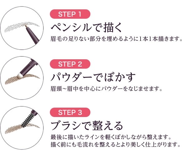 3役一体型の実力派!なめらかに描けるペンシル、自然にぼかせるパウダーチップ、全体を整えるスクリューブラシ、3つの機能が1本に! 描く・ぼかす・整えるの3ステップで、ふんわりと立体感ある美眉が完成します。