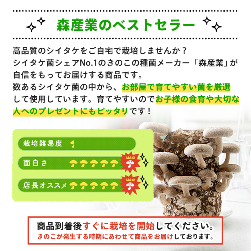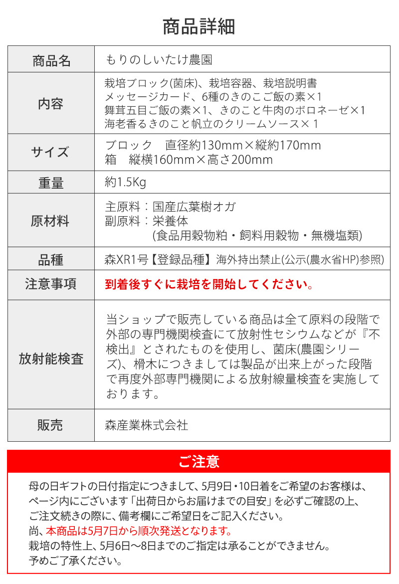 内 容:栽培ブロック(菌床)、栽培説明書、栽培容器、もりのごちそうブーケ