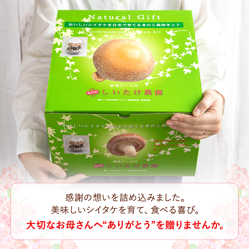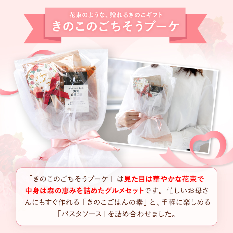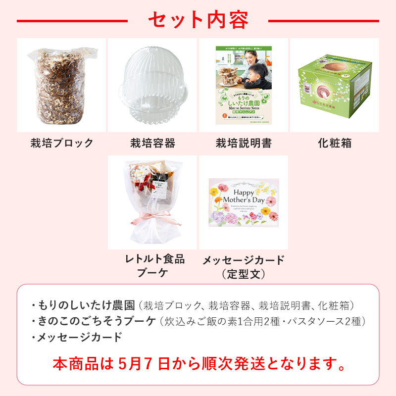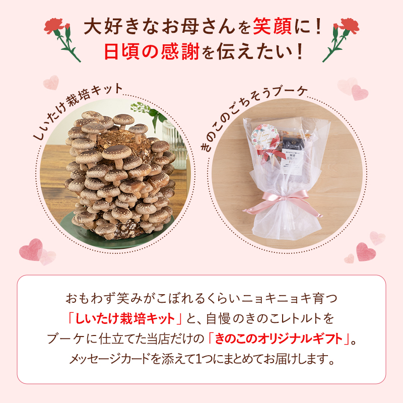 【5月7日から順次発送】【母の日限定】ごちそうブーケ×もりのしいたけ農園【栽培容器・レトルト食品・メッセージカード】付属品付|しいたけ栽培キット