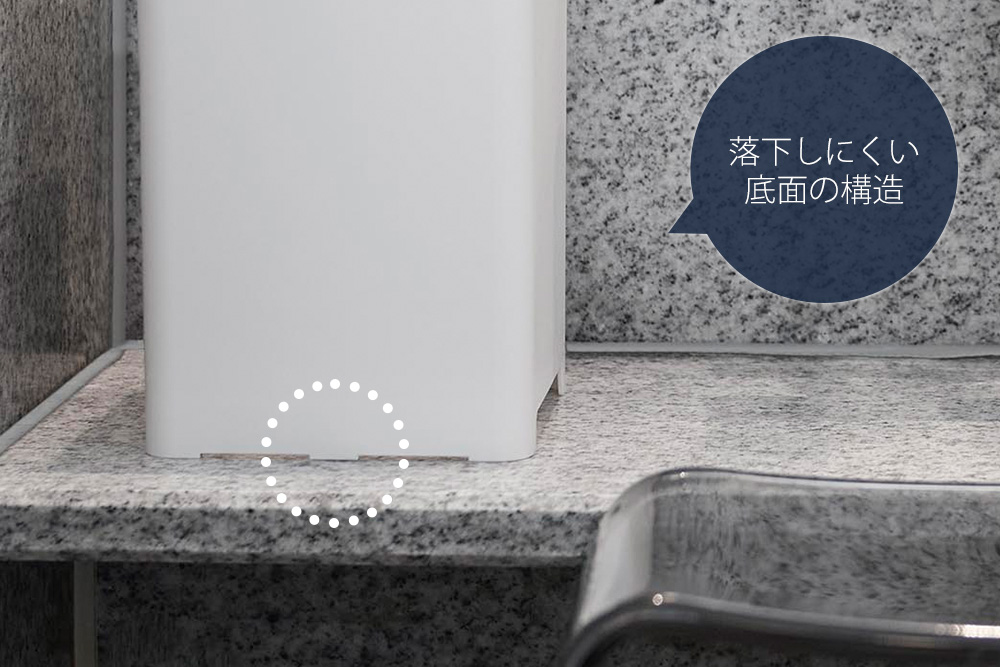 底面の水抜き部分の中央の出っ張りが支えになり、奥行の狭い洗面台でも落下しにくい構造になっています。