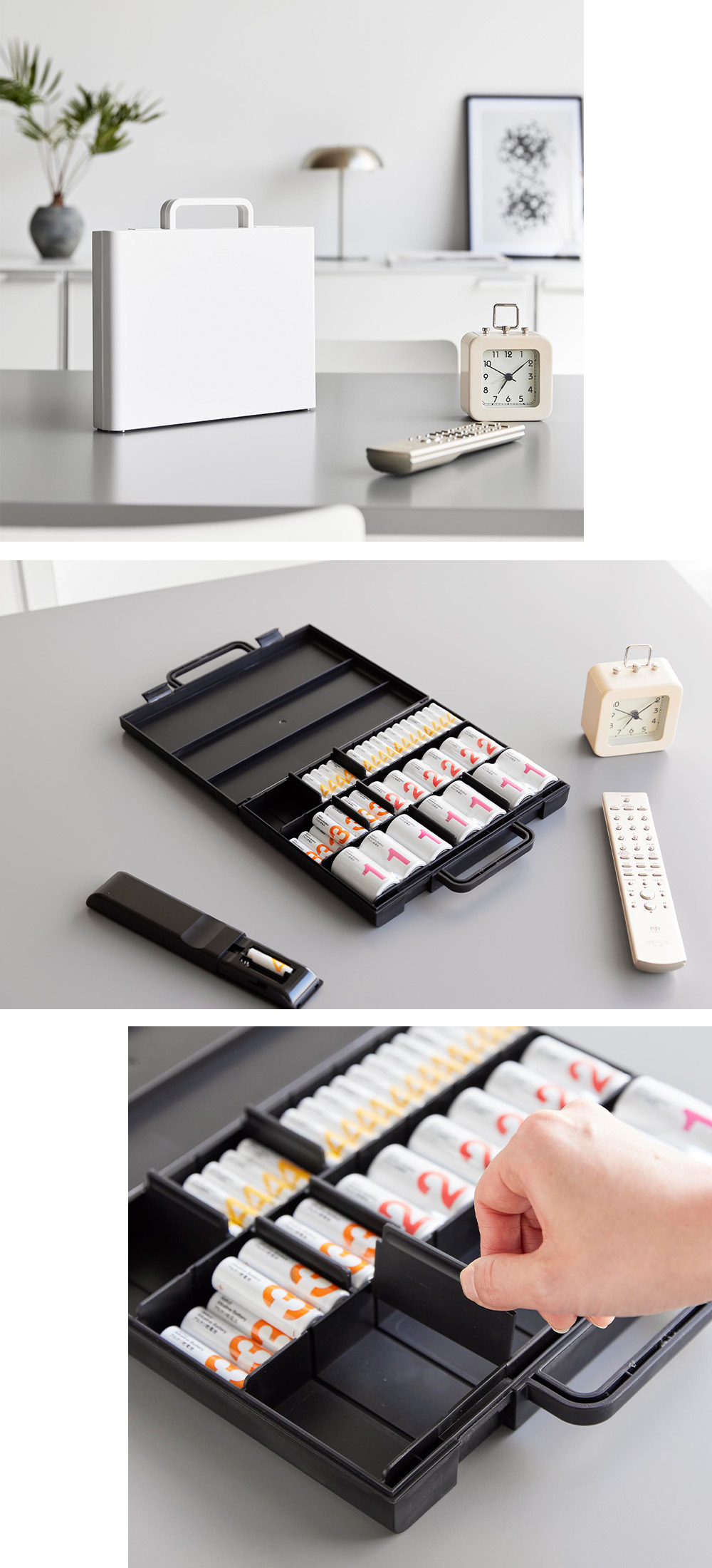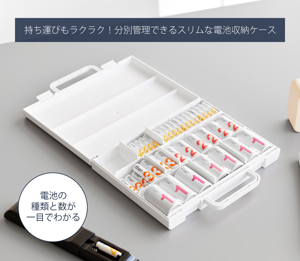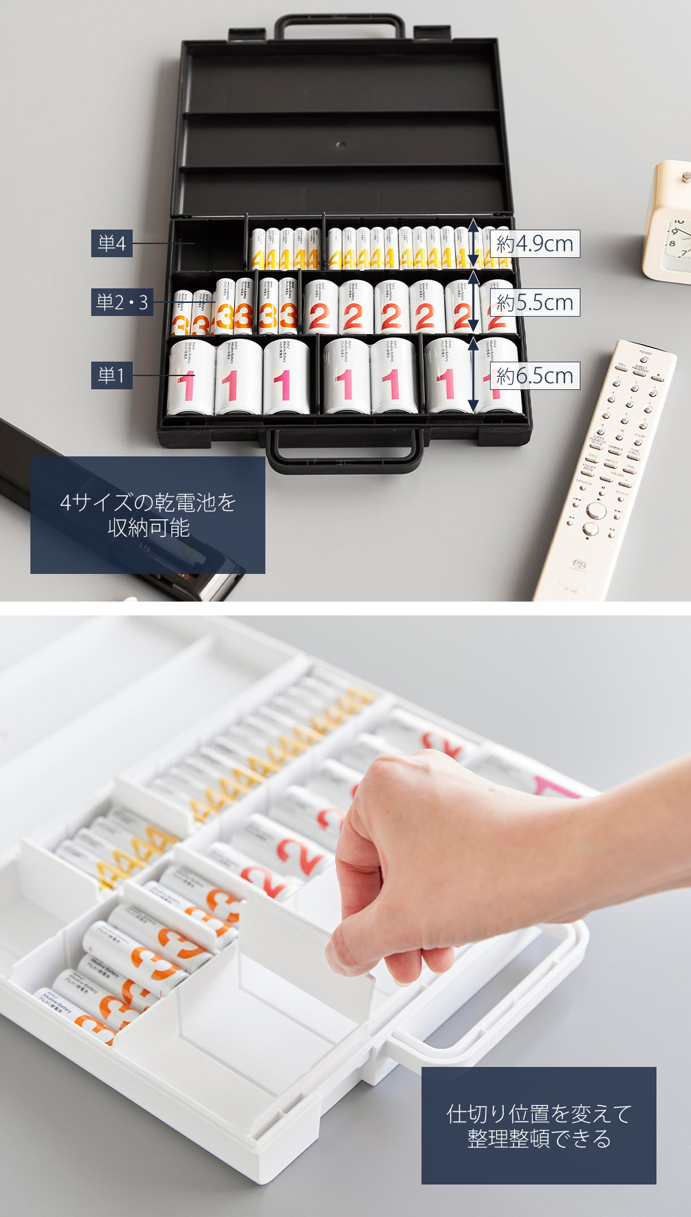 大きさの異なる電池を分別しながら管理できる、便利な収納ケースです。可動式仕切り付きなので、使用未使用を分けたり、種類分けしたりでき、種類・数が一目で分かります。