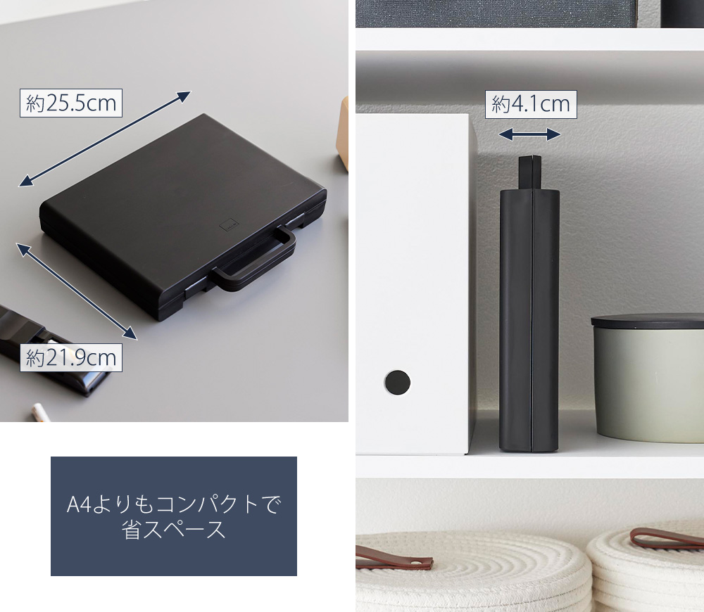 A4サイズよりもコンパクトでスリムなので、棚などの少しのスペースにも収納できます。大容量ながらもすっきり収まります。