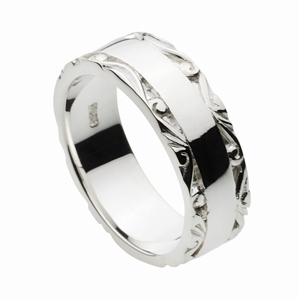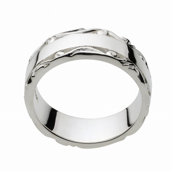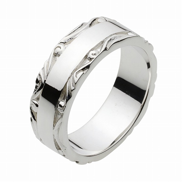 あえてサイド部分のみにアラベスク模様を入れて中央をプレーンに仕上げた事で、今までにない斬新なデザインになりました。重量感、デザイン、存在感すべてが魅力のシルバーリングです。