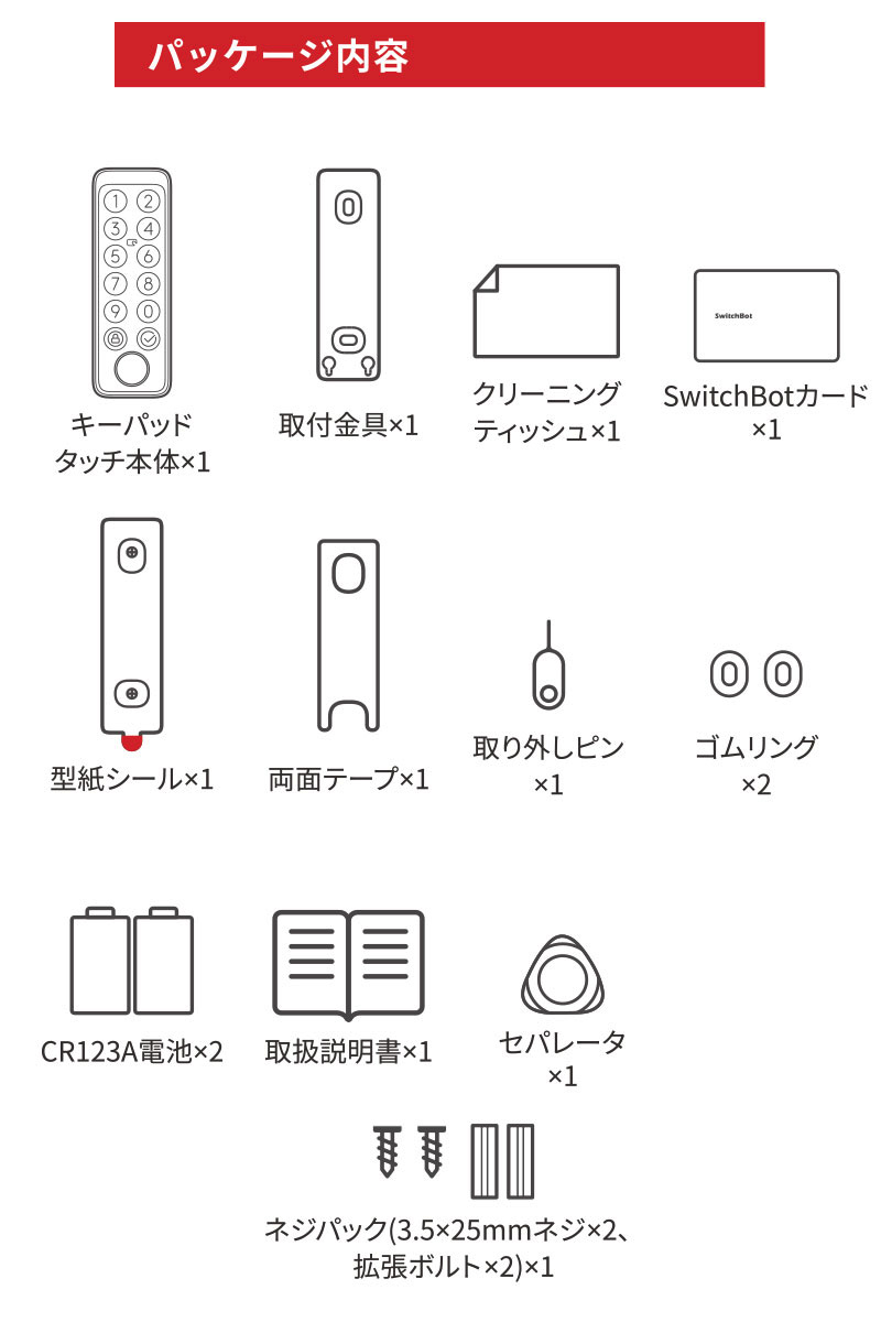 本製品内容は「SwitchBot ロックPro」のみとなり、それ以外の製品は別売です。
