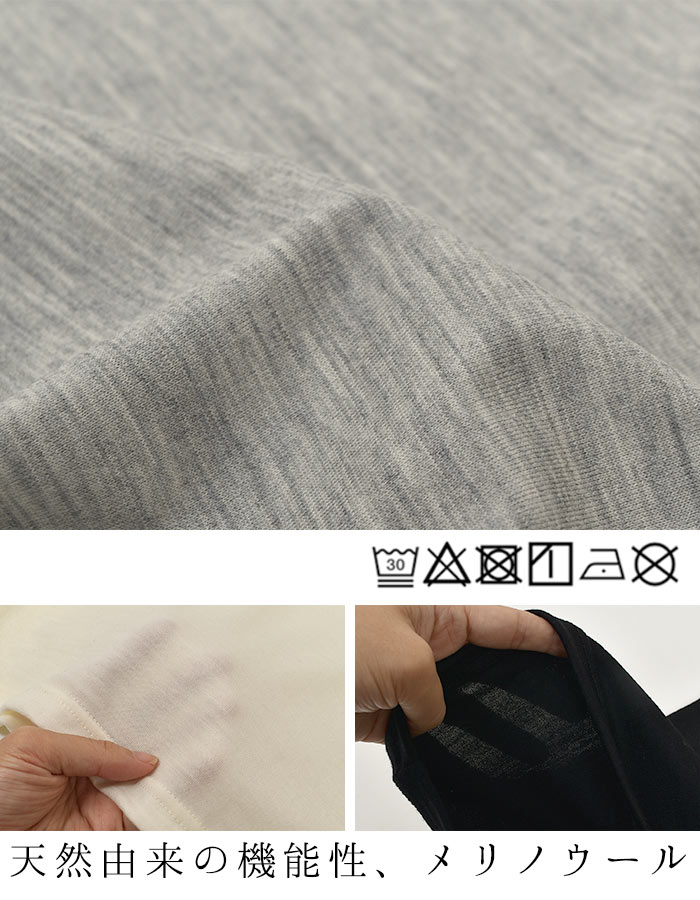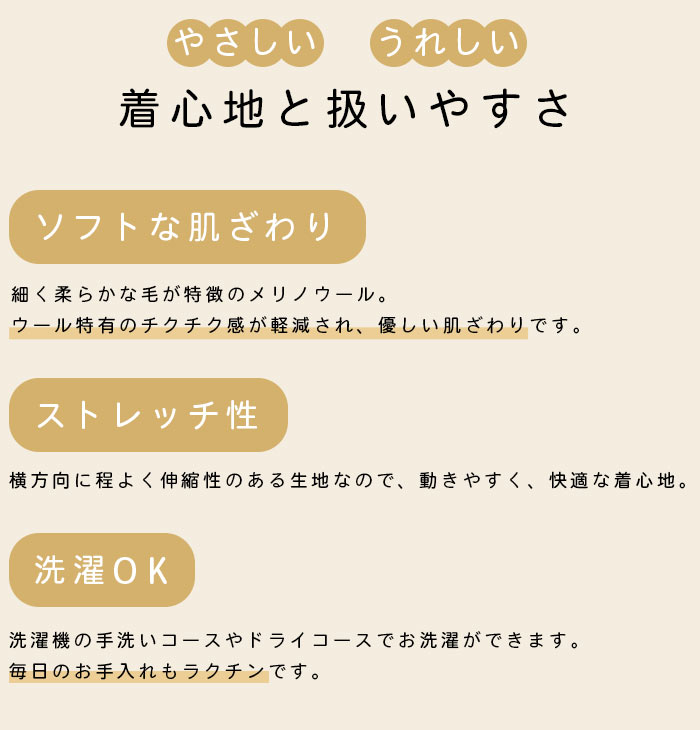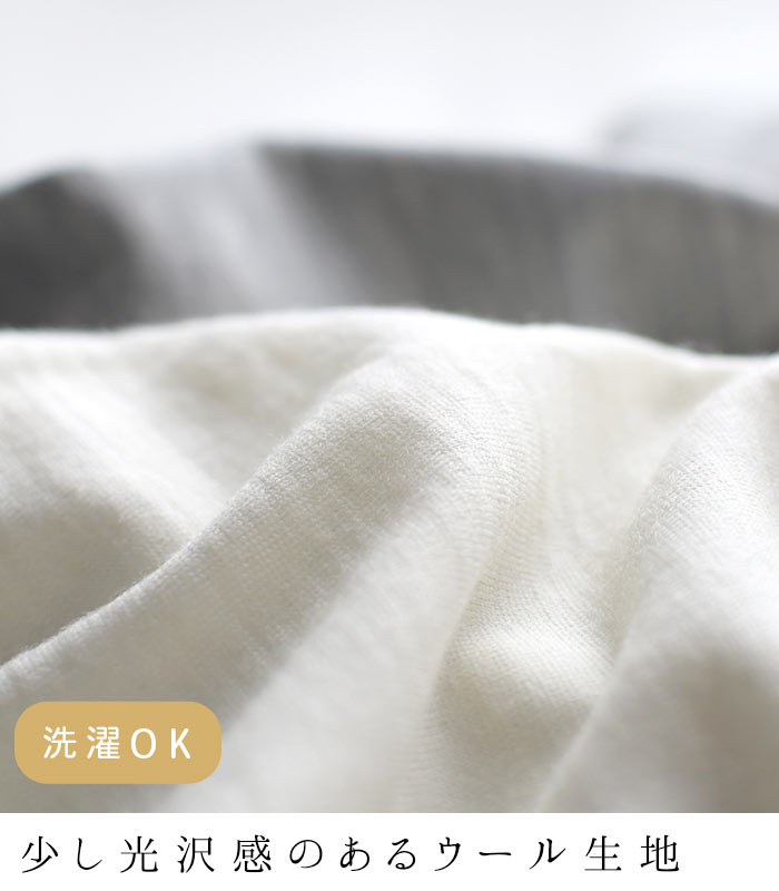 少し光沢のある上品な質感。細く柔らかな毛が特徴のメリノウールは、ウールとは思えないほどチクチク感のない優しい肌ざわりです。洗濯機でのお洗濯も可能なので、日ごろのお手入れもラクチン。