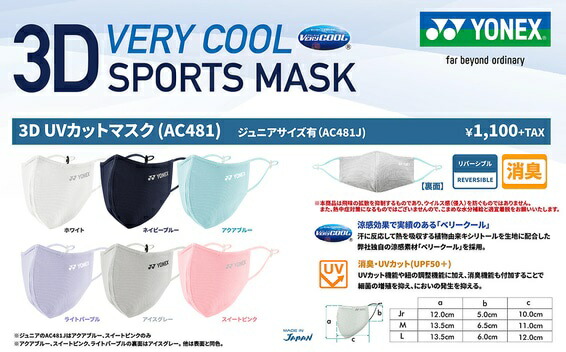 YONEX ベリークールマスク 接触冷感 消臭加工 花粉症 スポーツ 大人用 VERYCOOL 3D UVカット AC481 ヨネックス あす楽 あすつく