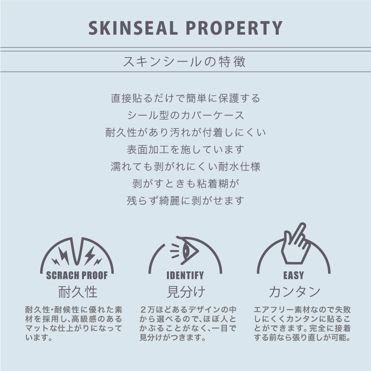 初回貼付時の位置調整や貼り直しは可能ですが、しっかりと押し付けて接着させた後の再剥離、再利用は保証しておりません。また接着部に油分や汚れが付着しますと角の部分は剥がれやすくなりますので、貼付時はあまり触れないようにご注意ください。