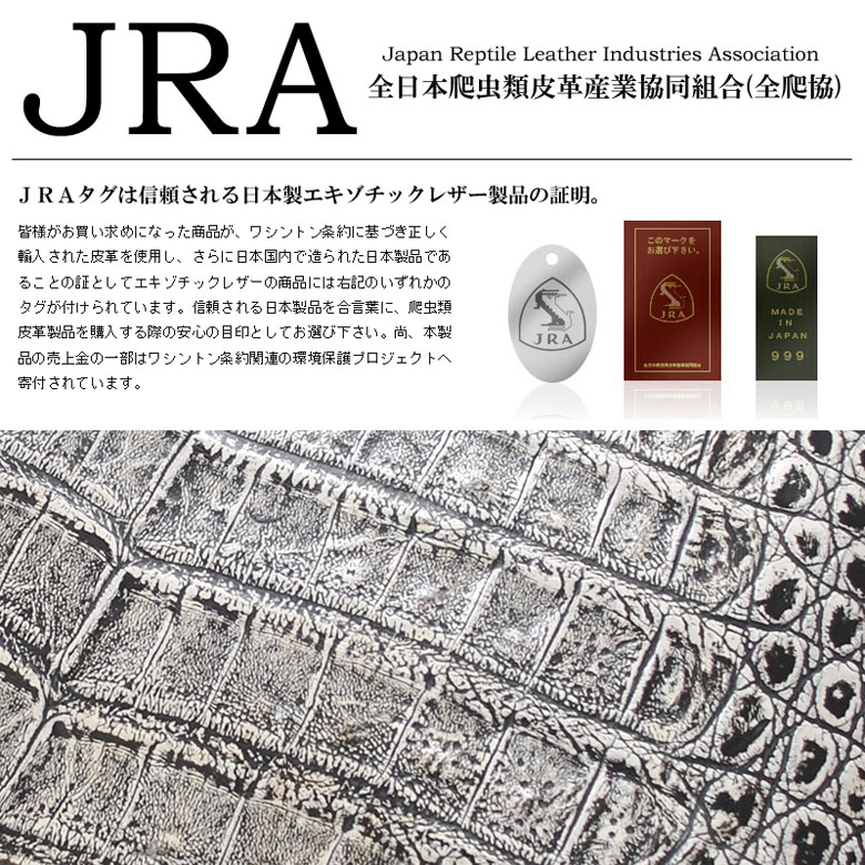 JRAマークは、本製品がワシントン条約の規定に基づき適法に輸入された皮革を用い丹念に仕上げられた、価値のある日本製品であることを証明するもので、この製品をお買い上げいただくことは、地球サミットのメインテーマでサスティナブル・ユースを推進することになります。尚、本製品の売上金の一部はワシントン条約関連の環境保護プロジェクトへ寄付されています。