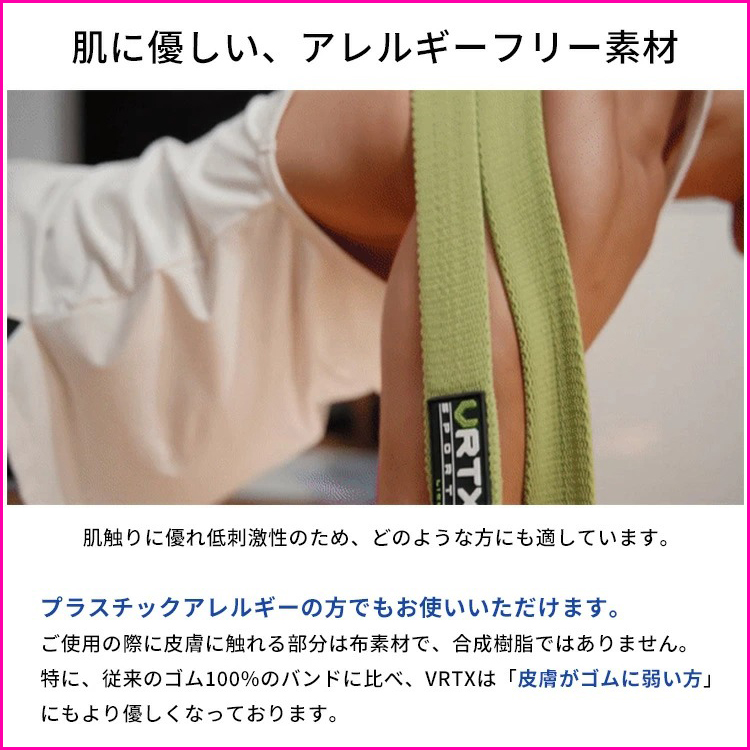 ※皮膚アレルギーの方は医者と相談した上でご使用ください。VRTXは、一般ゴム製バンドより最大68%ゴム削減しております。