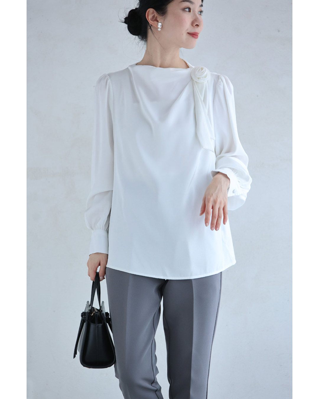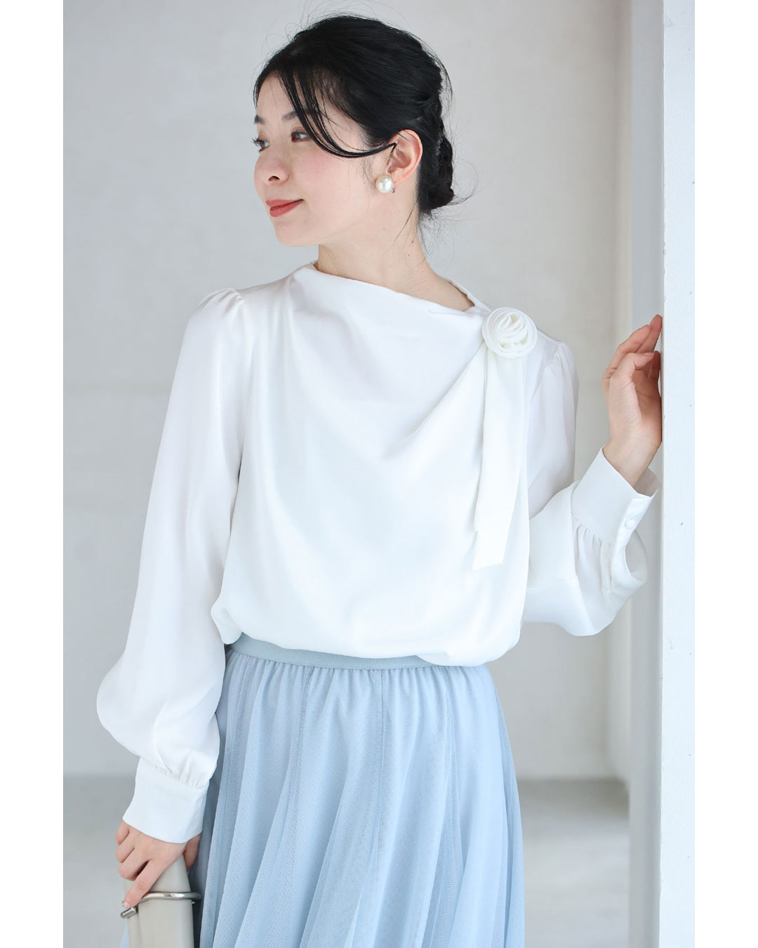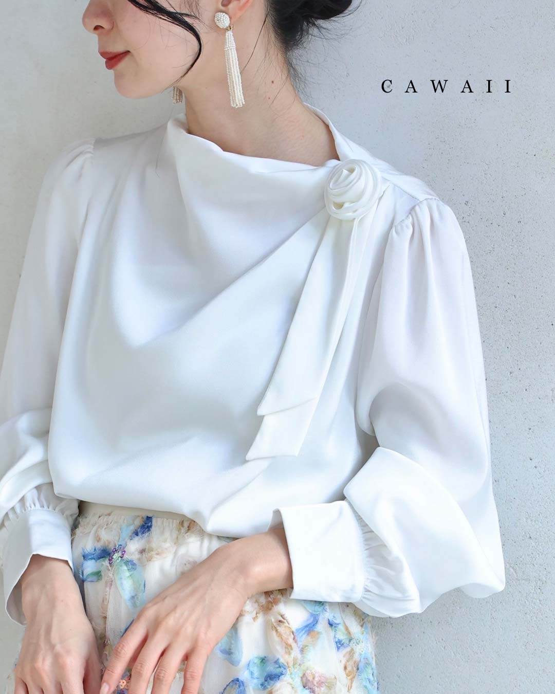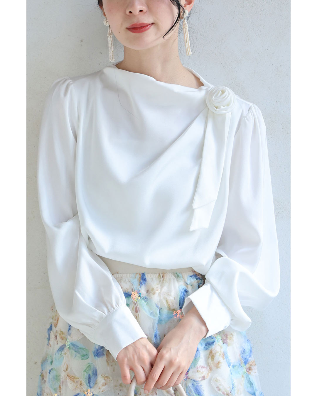 w61134ps 新作 新着 再入荷 CAWAII FRENCHPAVE フレンチパヴェ エレガント ベーシック カジュアル 可愛い かわいい カワイイ おしゃれ オシャレ お洒落 個性 個性的 定番 ベーシック 大人かわいい 大人可愛い 上品 女性らしい デザイン スタンダード ナチュラル きれいめ キレイめ シンプル フェミニン レディース レディースファッション 大人 ママ ミセス 30代 40代 50代 60代 肩に咲く 花 コサージュ ドレープ ブラウス トップス 長袖 長そで ロング袖 光沢感 ドレープ とろみ感 滑らか ワンポイント ワンサイズ Sサイズ Mサイズ Lサイズ フリーサイズ フリー 小さめ 小さめサイズ小さい 小さいサイズ 低身長 痩せ ほっそり 小柄 細身 標準サイズ 大きめシルエット 大きい 大きめ ビッグシルエット ぽっちゃり F サイズ自由 薄手 涼しい ずずしい 春 夏 夏服 夏物 春服 春物 秋服 秋物 ホワイト 白 白色 無地 ワンカラー ワントーン 日常着 普段着 日常使い オフィス オフィスカジュアル 会社 おでかけ 旅行 女子会 祝賀会 同窓会 学校行事 授業参観 保護者懇談会 三者面談