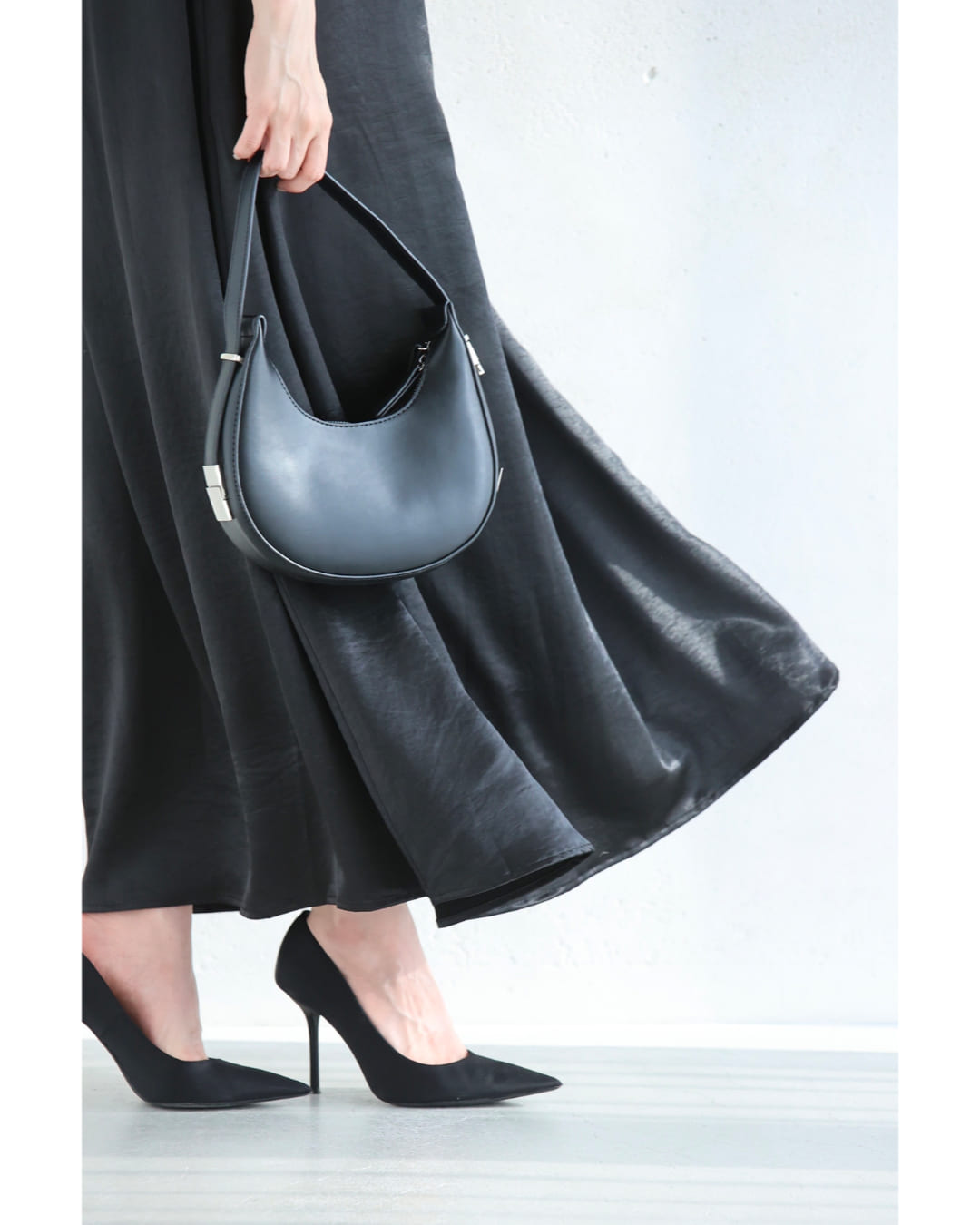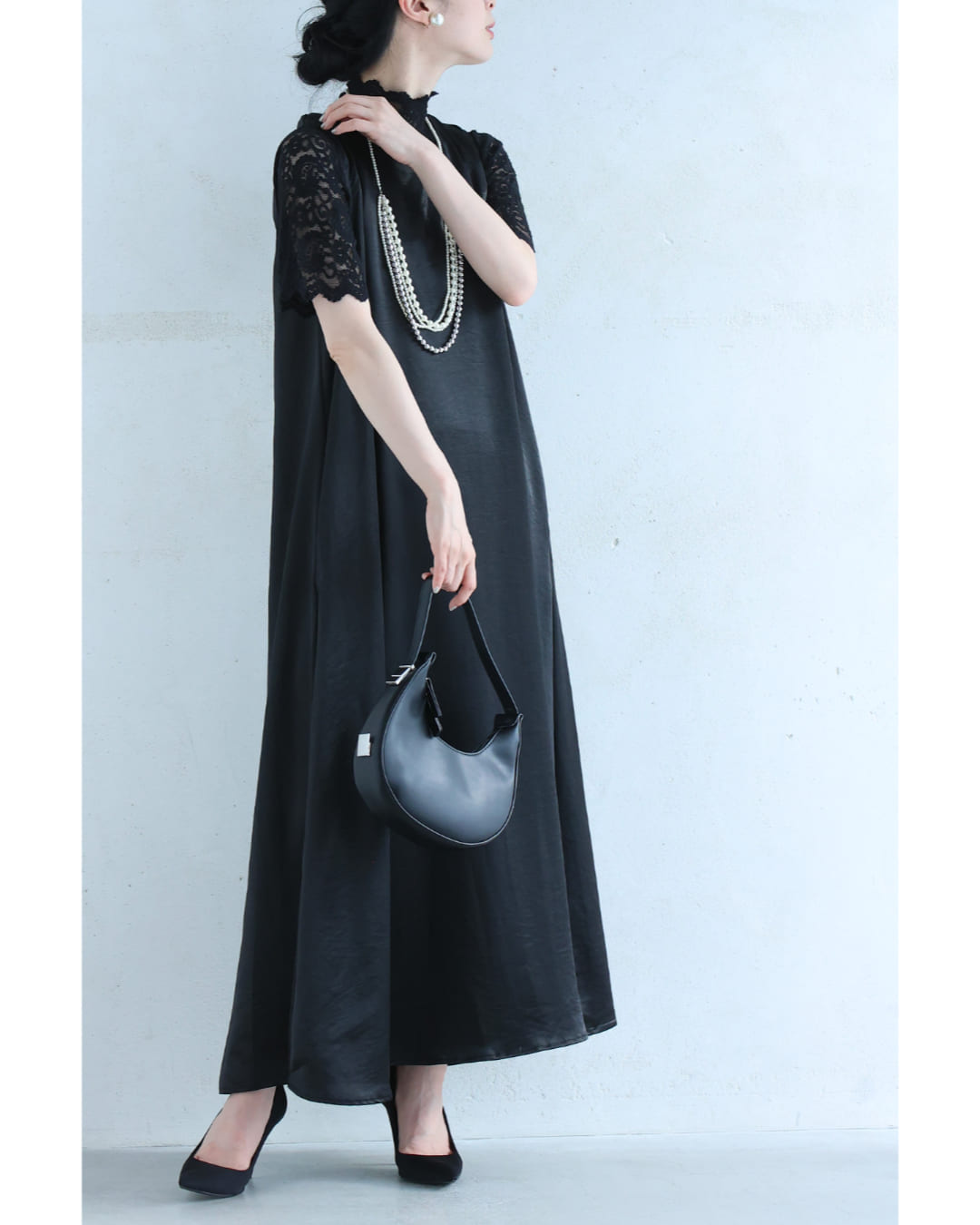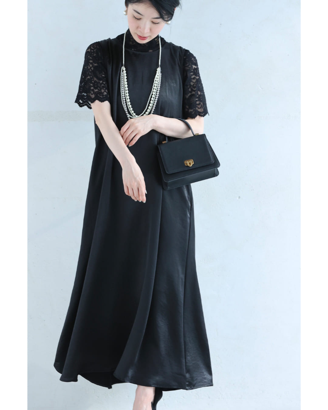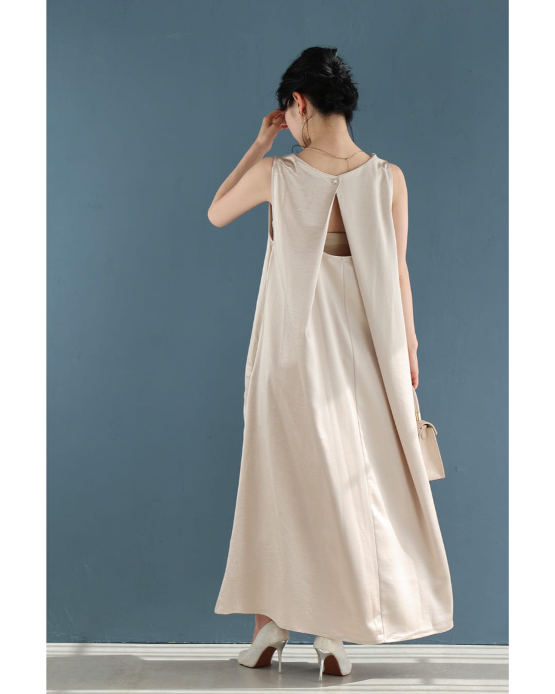 Sから2L対応 バックタックのラグジュアリーな光沢ロングワンピース