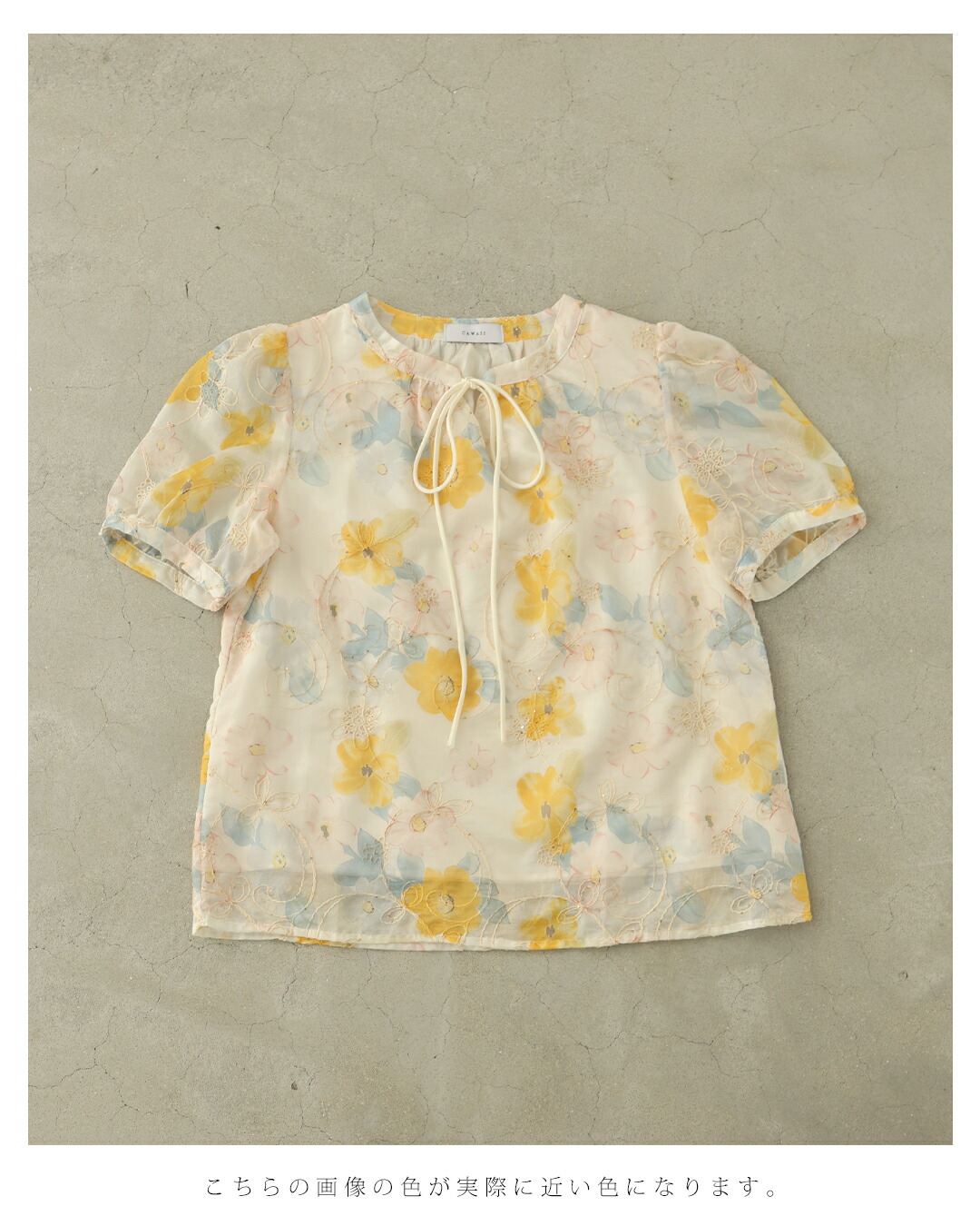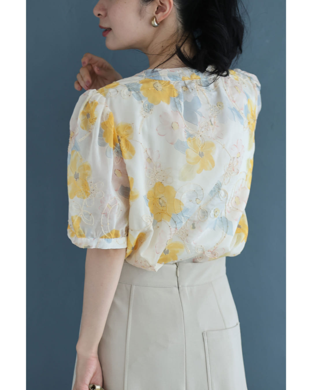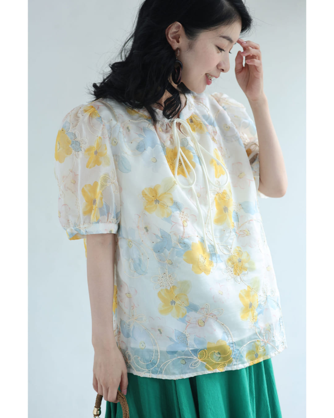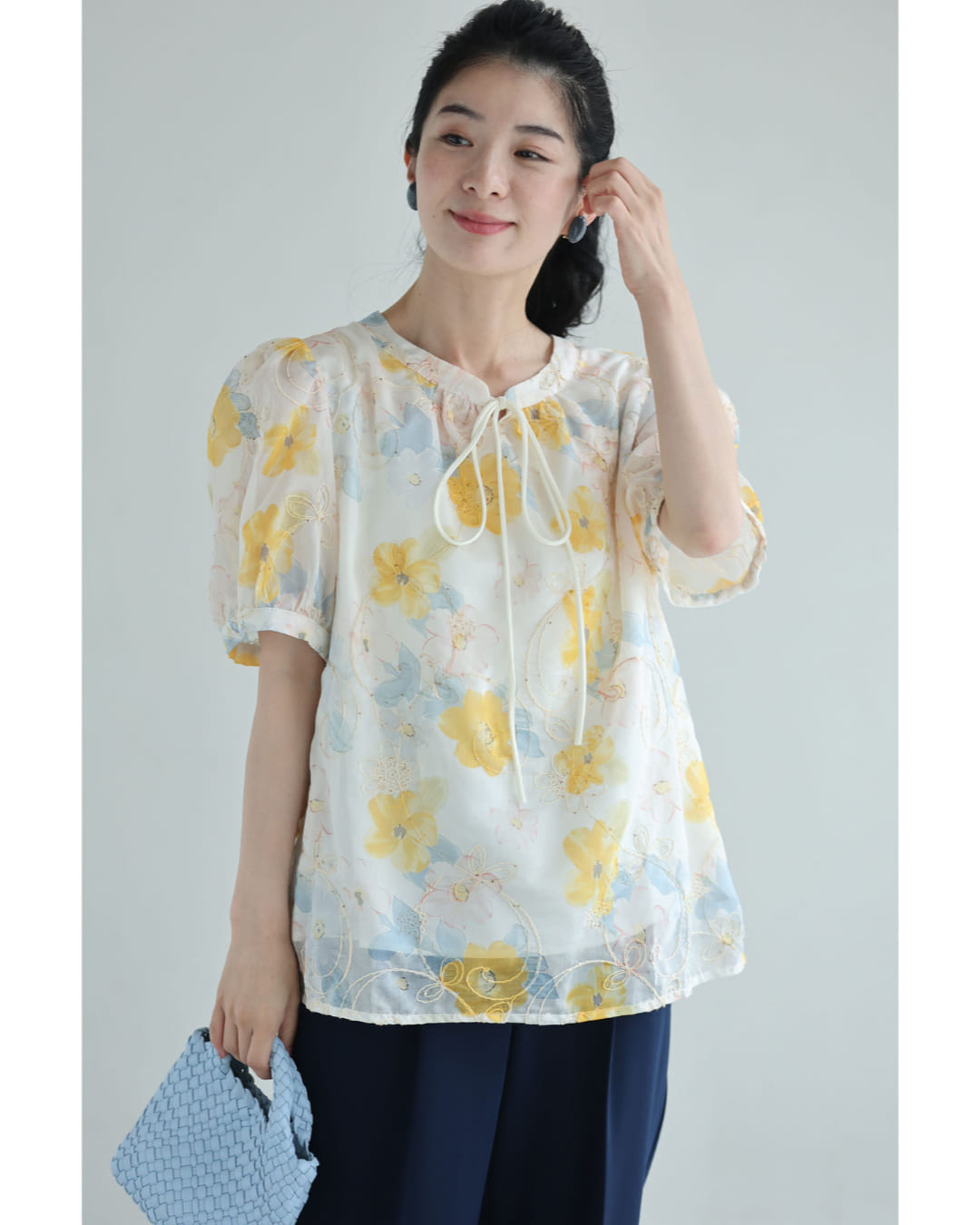 w61365ps 新作 新着 再入荷 CAWAII FRENCHPAVE フレンチパヴェ エレガント ベーシック カジュアル 可愛い かわいい カワイイ おしゃれ オシャレ お洒落 個性 個性的 定番 ベーシック 大人かわいい 大人可愛い 上品 女性らしい デザイン スタンダード ナチュラル きれいめ キレイめ シンプル フェミニン レディース レディースファッション 大人 ママ ミセス 30代 40代 50代 60代 彩り 水彩花 重なる 花刺繍 ブラウス トップス 半袖 S M L フリーサイズ フリー 小さめ 小さいサイズ 低身長 痩せ ほっそり 小柄 細身 標準サイズ ゆったり F サイズ自由 薄手 涼感性 涼しい ずずしい 春 夏 春服 春物 夏服 夏物 爽やか イエロー 柄 総柄 フラワー柄 ガーデン 滲み花 日常着 普段着 日常使い オフィスカジュアル 会社 通勤 OL スパンコール おでかけ 旅行