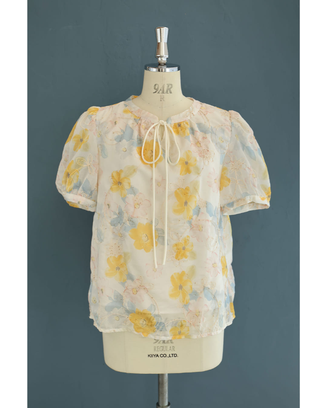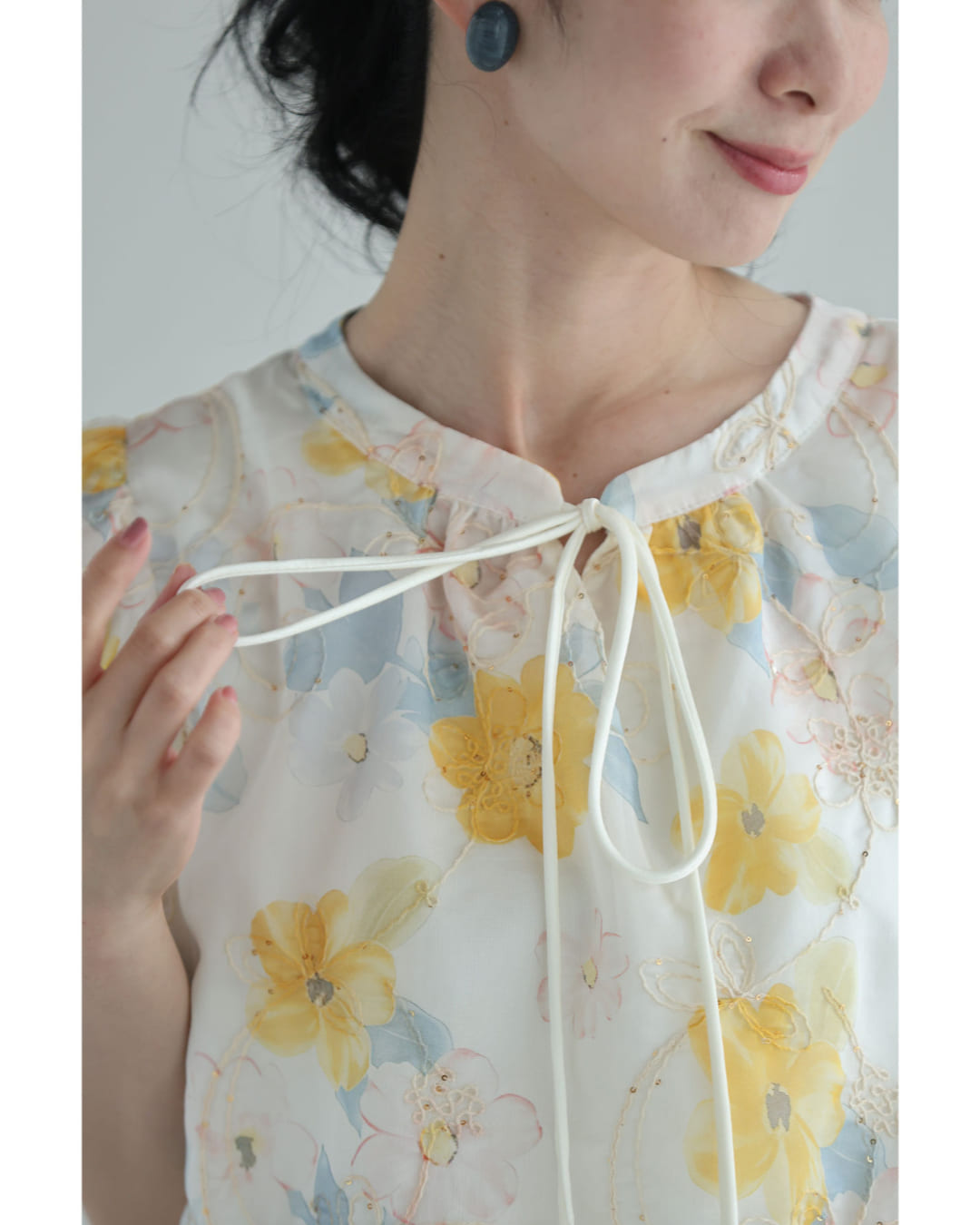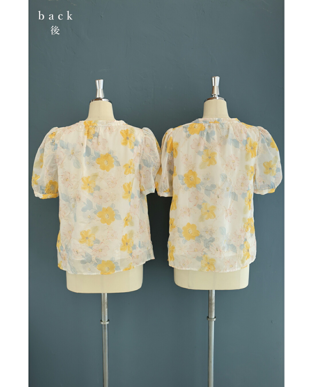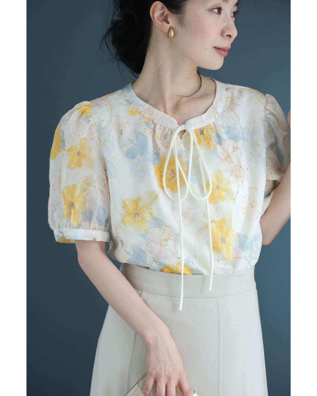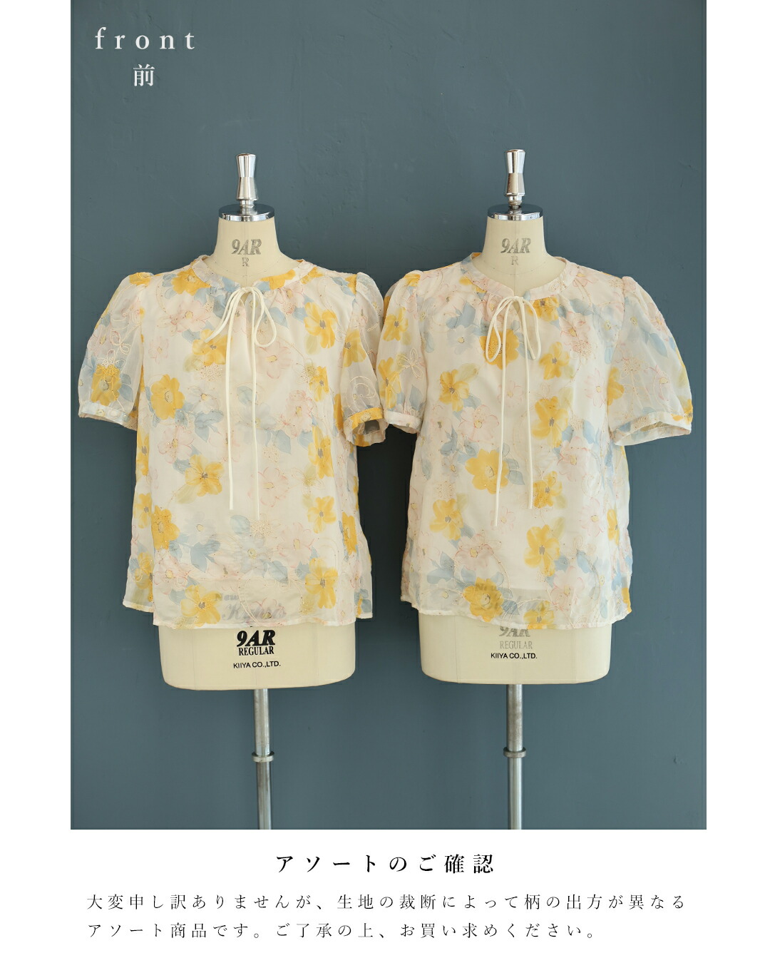 w61365ps 新作 新着 再入荷 CAWAII FRENCHPAVE フレンチパヴェ エレガント ベーシック カジュアル 可愛い かわいい カワイイ おしゃれ オシャレ お洒落 個性 個性的 定番 ベーシック 大人かわいい 大人可愛い 上品 女性らしい デザイン スタンダード ナチュラル きれいめ キレイめ シンプル フェミニン レディース レディースファッション 大人 ママ ミセス 30代 40代 50代 60代 彩り 水彩花 重なる 花刺繍 ブラウス トップス 半袖 S M L フリーサイズ フリー 小さめ 小さいサイズ 低身長 痩せ ほっそり 小柄 細身 標準サイズ ゆったり F サイズ自由 薄手 涼感性 涼しい ずずしい 春 夏 春服 春物 夏服 夏物 爽やか イエロー 柄 総柄 フラワー柄 ガーデン 滲み花 日常着 普段着 日常使い オフィスカジュアル 会社 通勤 OL スパンコール おでかけ 旅行