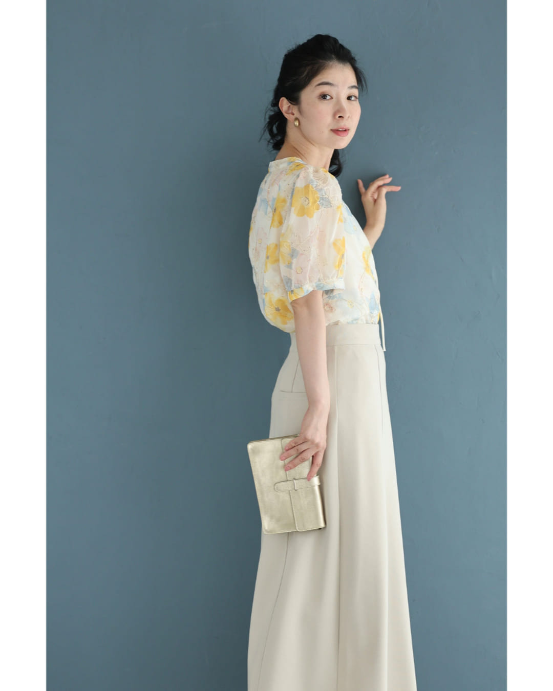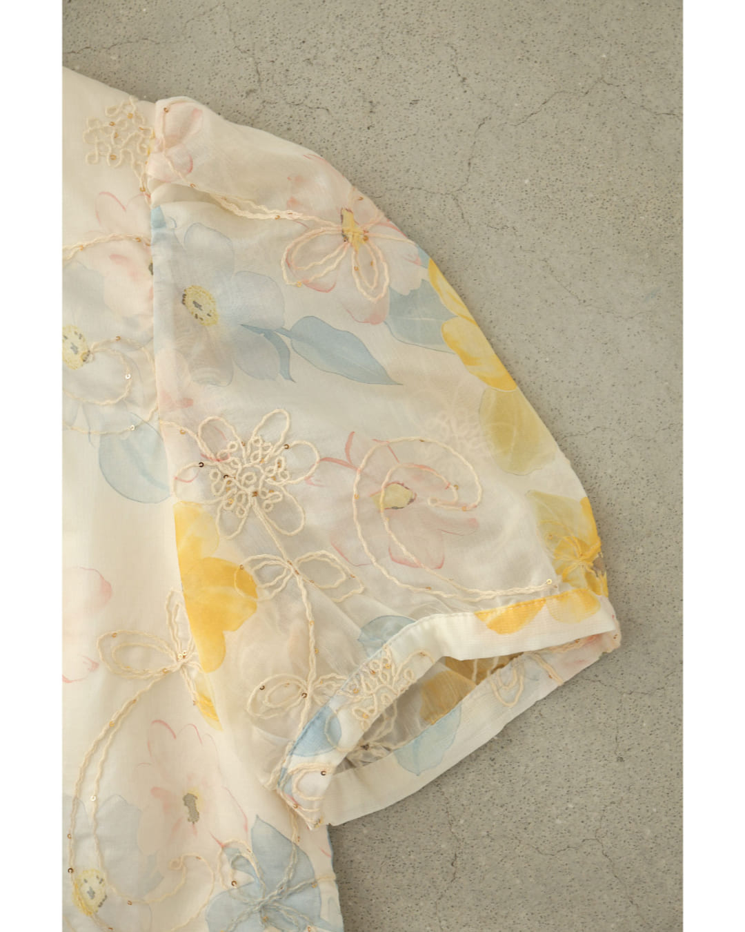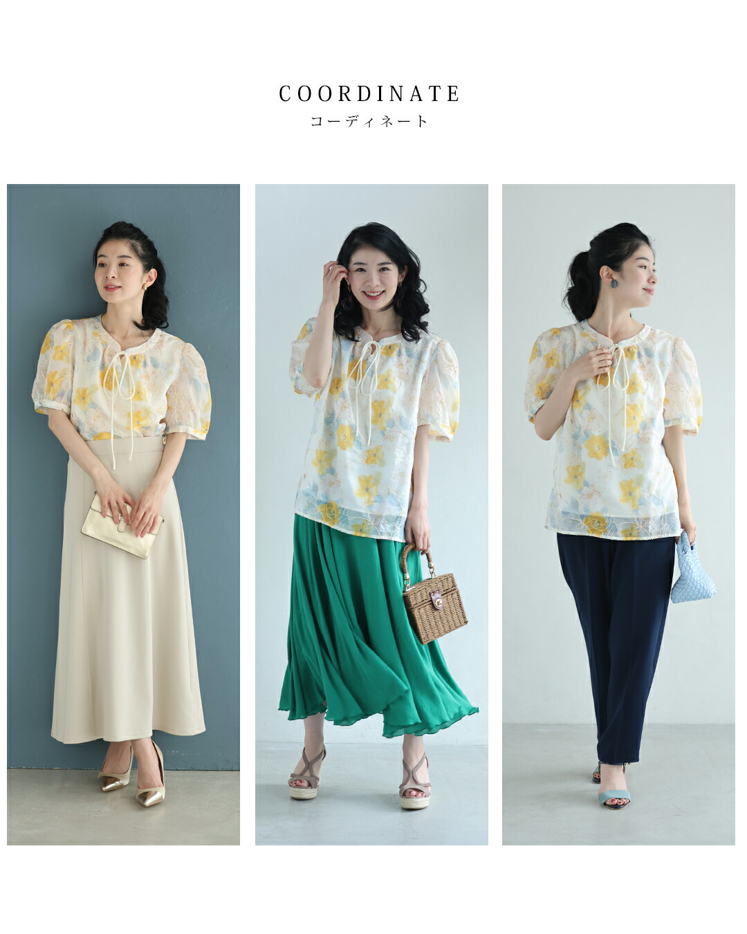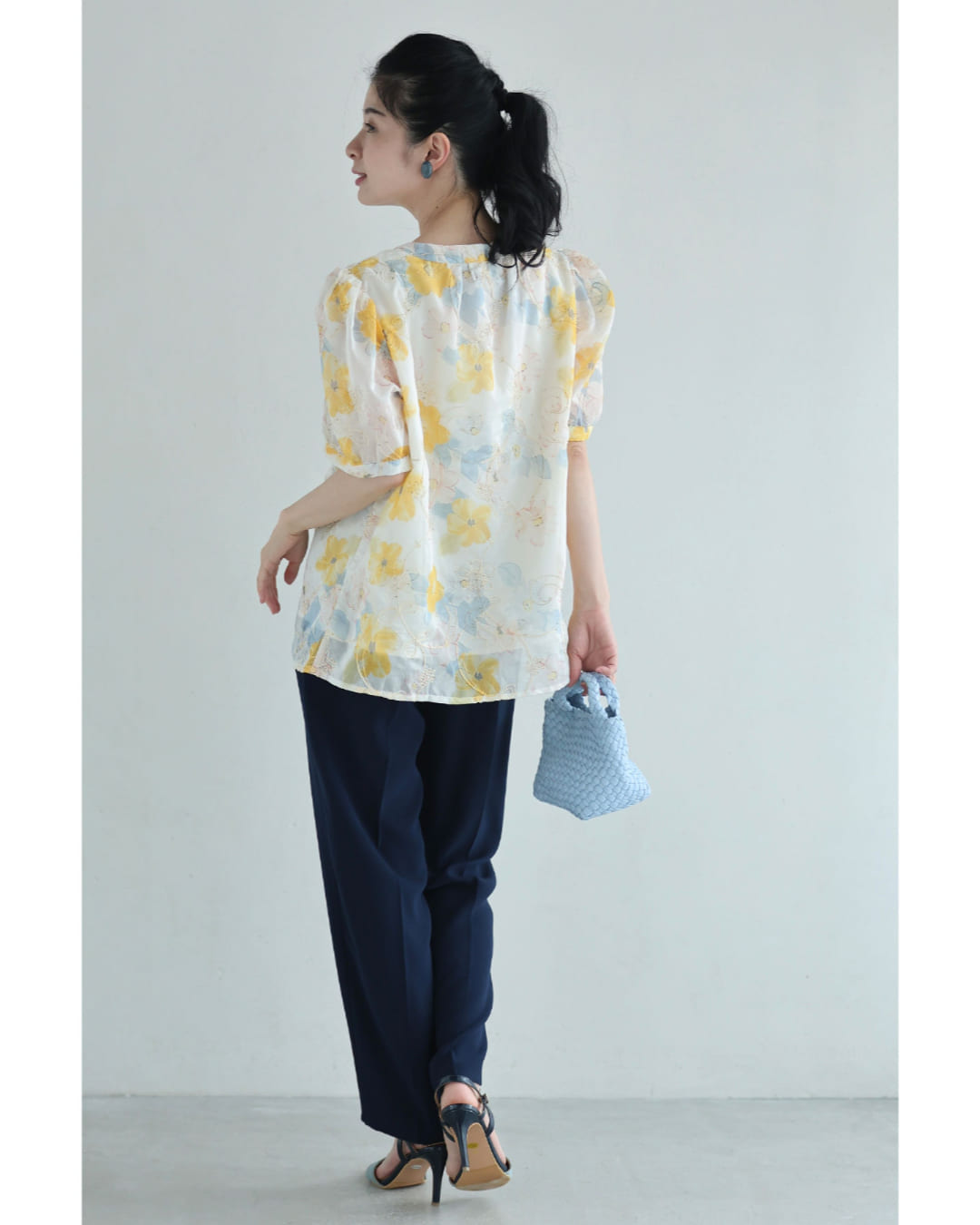 w61365ps 新作 新着 再入荷 CAWAII FRENCHPAVE フレンチパヴェ エレガント ベーシック カジュアル 可愛い かわいい カワイイ おしゃれ オシャレ お洒落 個性 個性的 定番 ベーシック 大人かわいい 大人可愛い 上品 女性らしい デザイン スタンダード ナチュラル きれいめ キレイめ シンプル フェミニン レディース レディースファッション 大人 ママ ミセス 30代 40代 50代 60代 彩り 水彩花 重なる 花刺繍 ブラウス トップス 半袖 S M L フリーサイズ フリー 小さめ 小さいサイズ 低身長 痩せ ほっそり 小柄 細身 標準サイズ ゆったり F サイズ自由 薄手 涼感性 涼しい ずずしい 春 夏 春服 春物 夏服 夏物 爽やか イエロー 柄 総柄 フラワー柄 ガーデン 滲み花 日常着 普段着 日常使い オフィスカジュアル 会社 通勤 OL スパンコール おでかけ 旅行