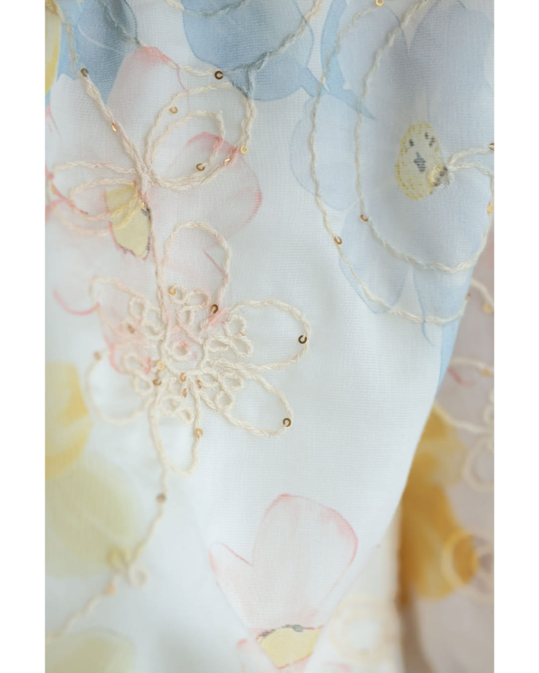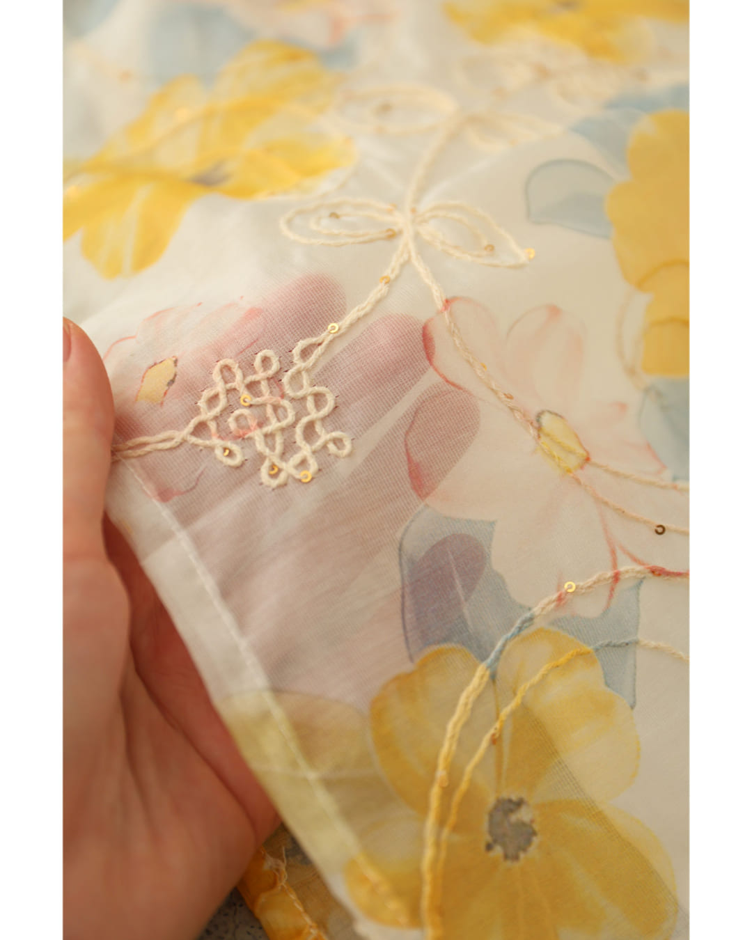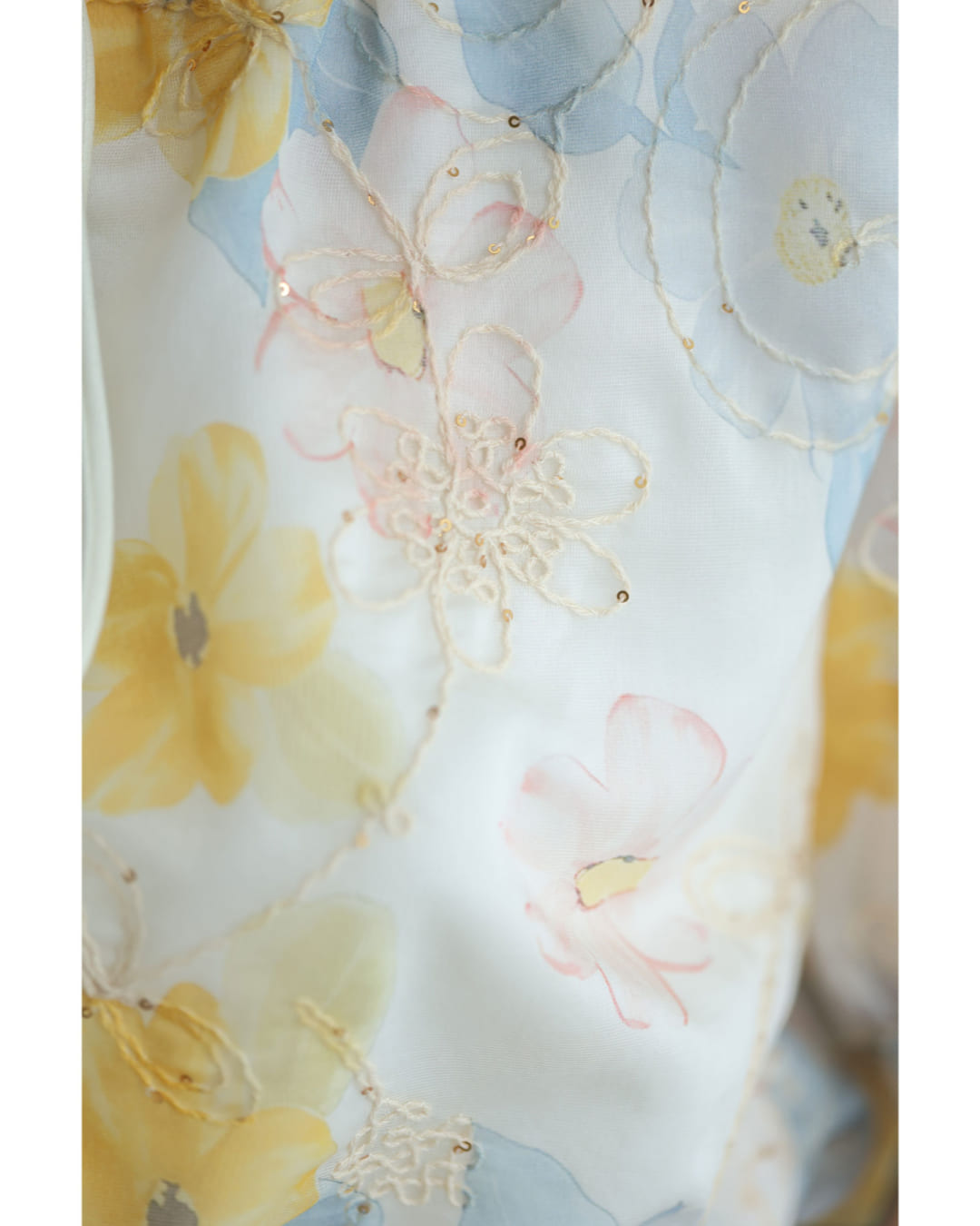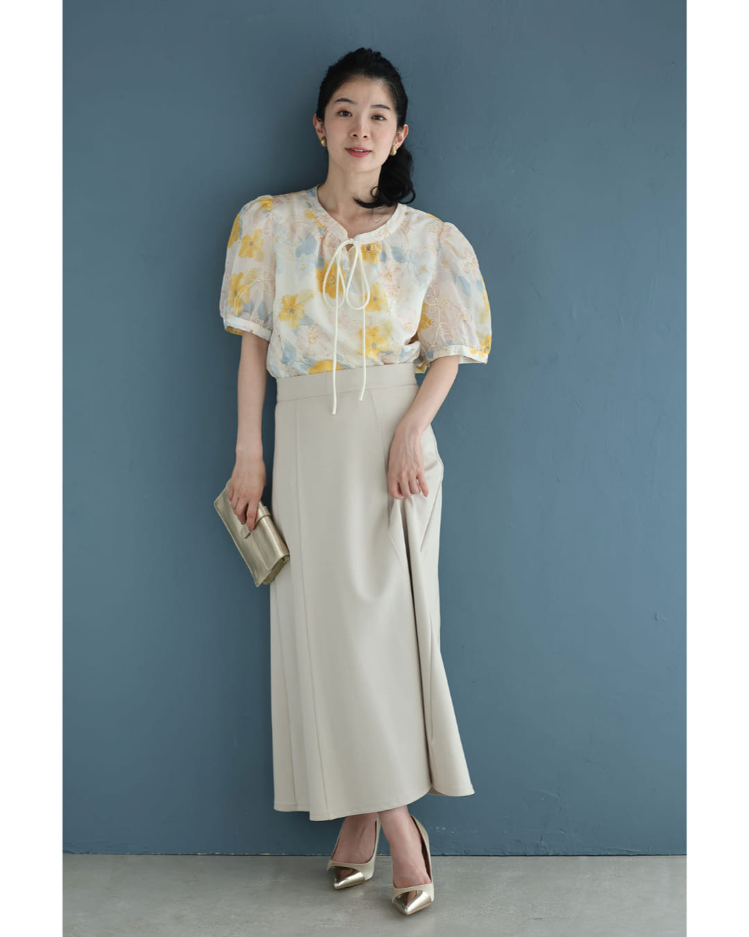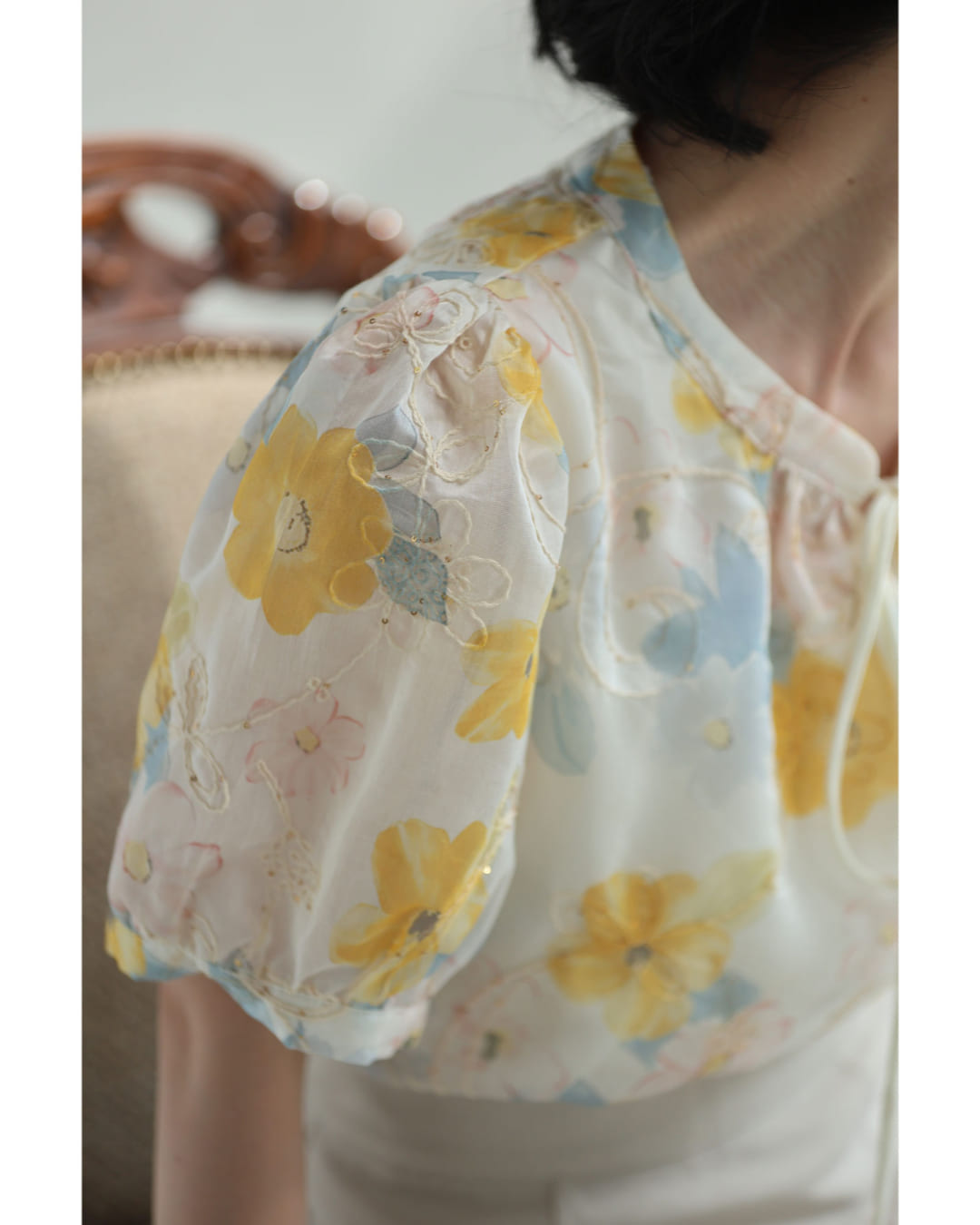 w61365ps 新作 新着 再入荷 CAWAII FRENCHPAVE フレンチパヴェ エレガント ベーシック カジュアル 可愛い かわいい カワイイ おしゃれ オシャレ お洒落 個性 個性的 定番 ベーシック 大人かわいい 大人可愛い 上品 女性らしい デザイン スタンダード ナチュラル きれいめ キレイめ シンプル フェミニン レディース レディースファッション 大人 ママ ミセス 30代 40代 50代 60代 彩り 水彩花 重なる 花刺繍 ブラウス トップス 半袖 S M L フリーサイズ フリー 小さめ 小さいサイズ 低身長 痩せ ほっそり 小柄 細身 標準サイズ ゆったり F サイズ自由 薄手 涼感性 涼しい ずずしい 春 夏 春服 春物 夏服 夏物 爽やか イエロー 柄 総柄 フラワー柄 ガーデン 滲み花 日常着 普段着 日常使い オフィスカジュアル 会社 通勤 OL スパンコール おでかけ 旅行