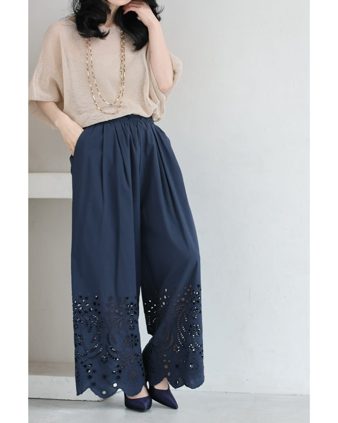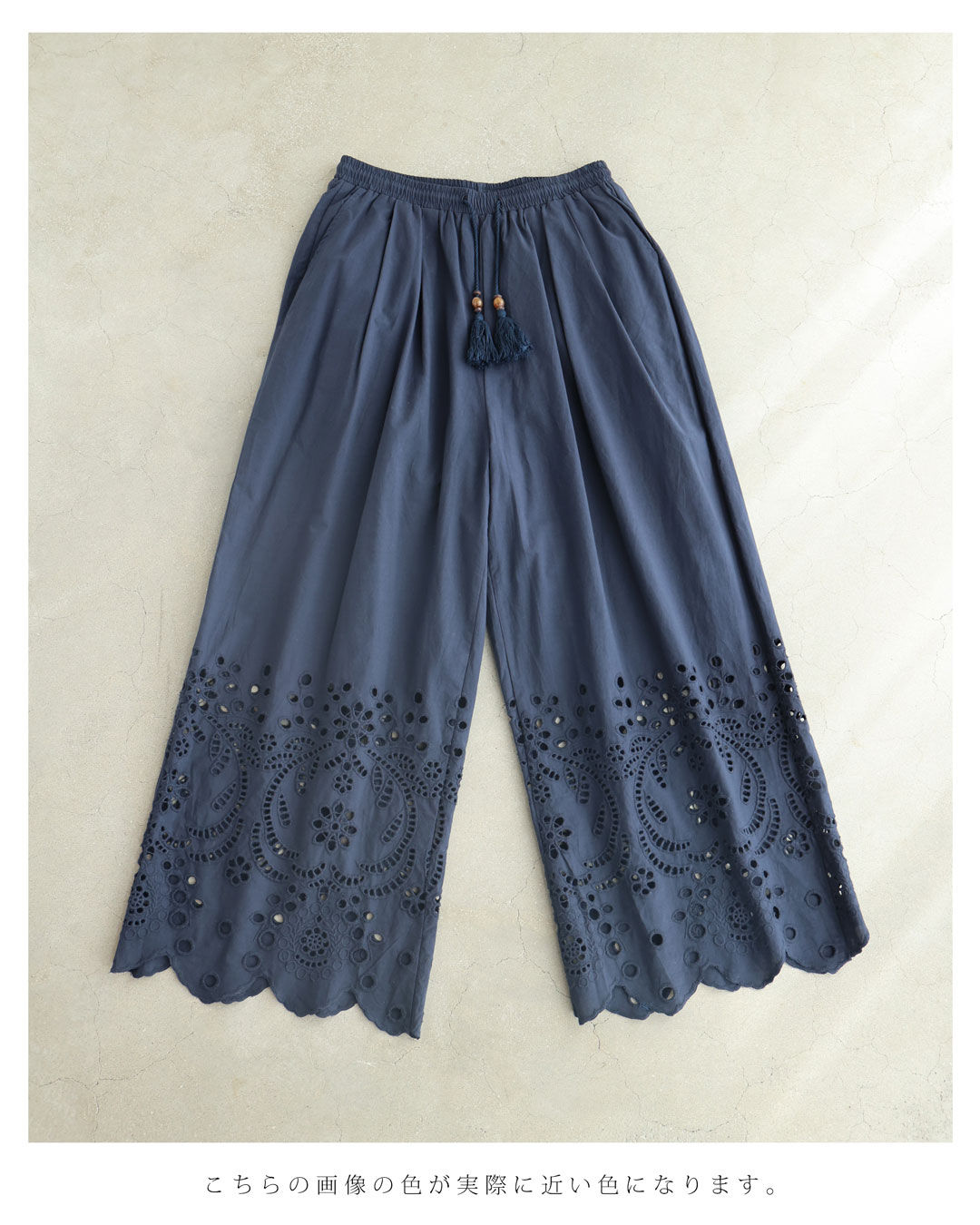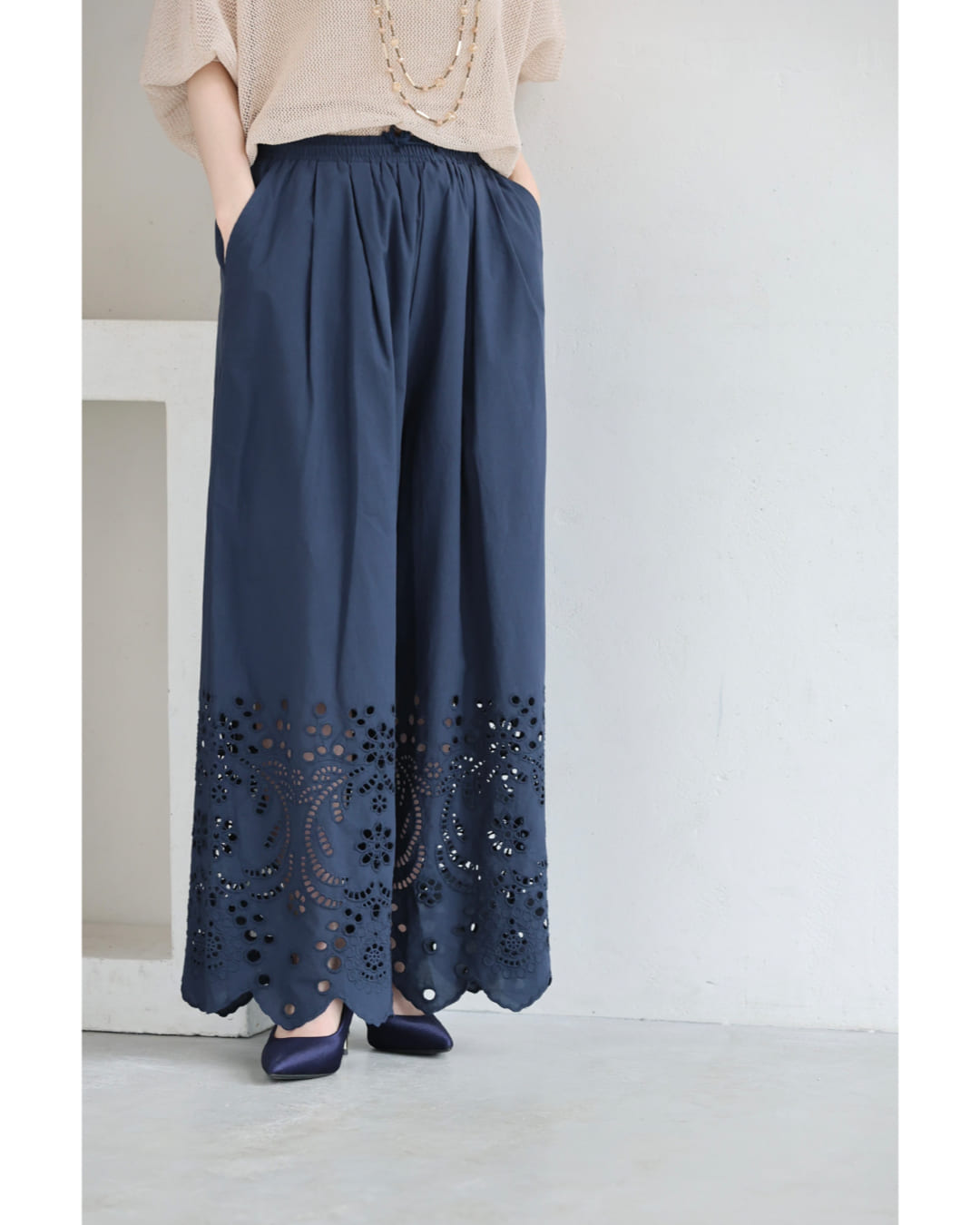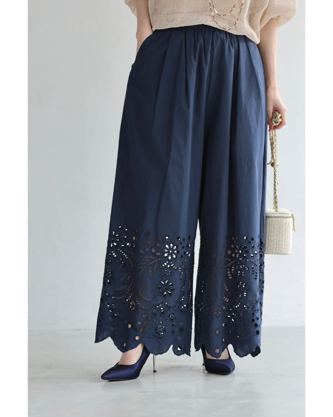 SからL対応 紺 日差しに透けるパンチングレースのワイドパンツ