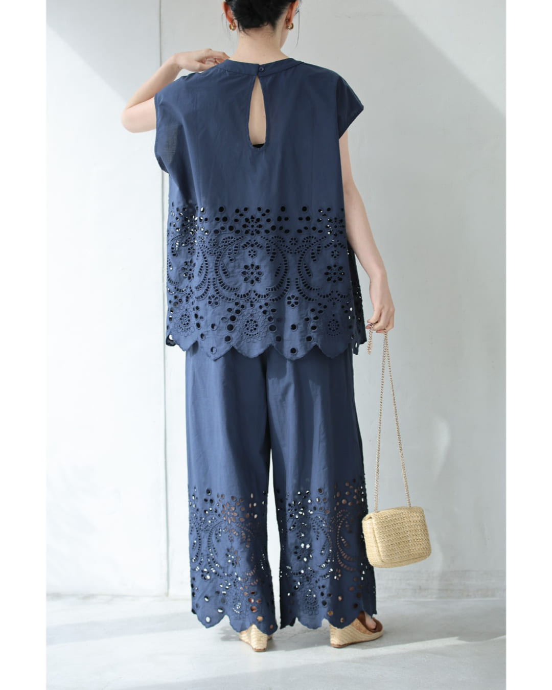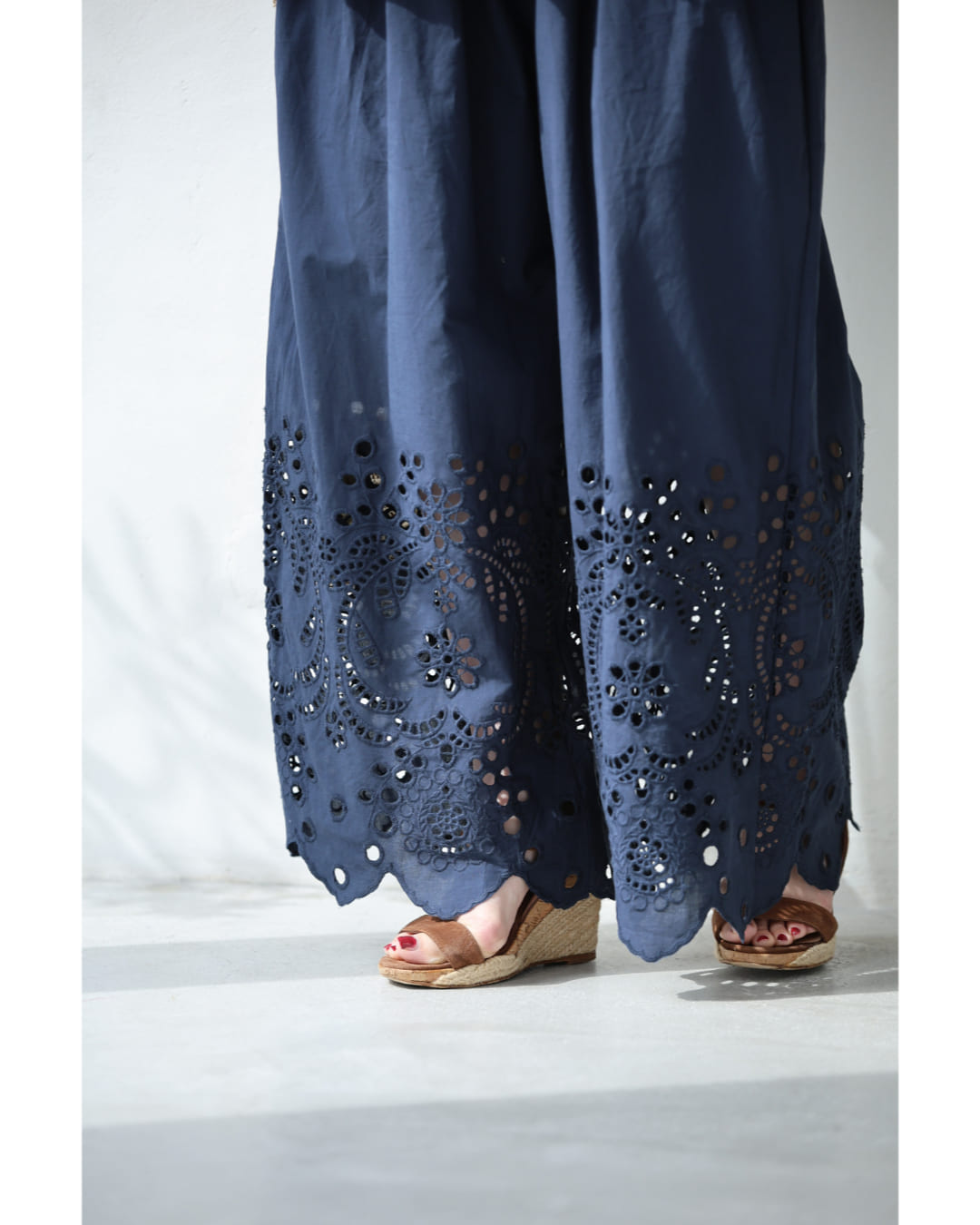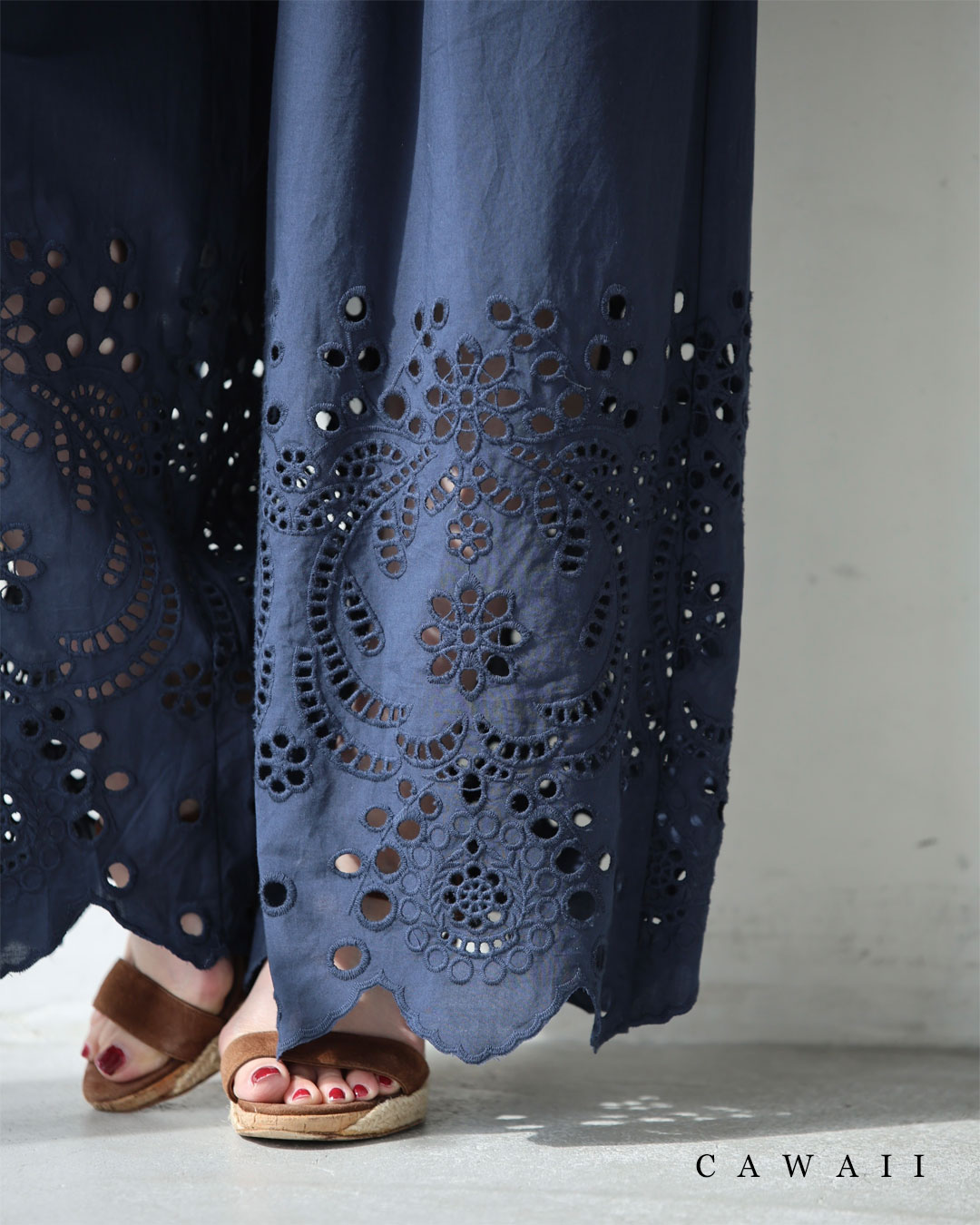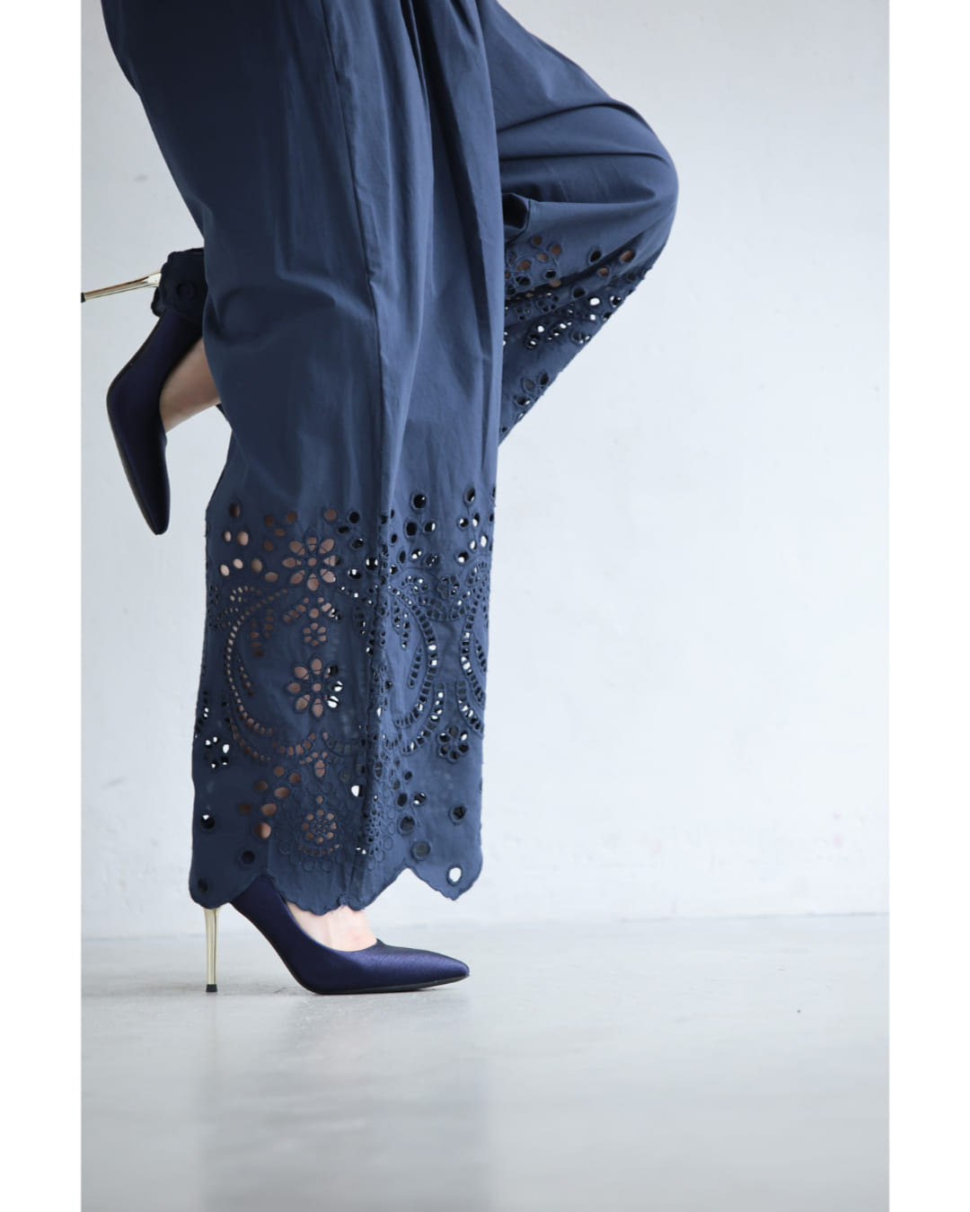 SからL対応 紺 日差しに透けるパンチングレースのワイドパンツ