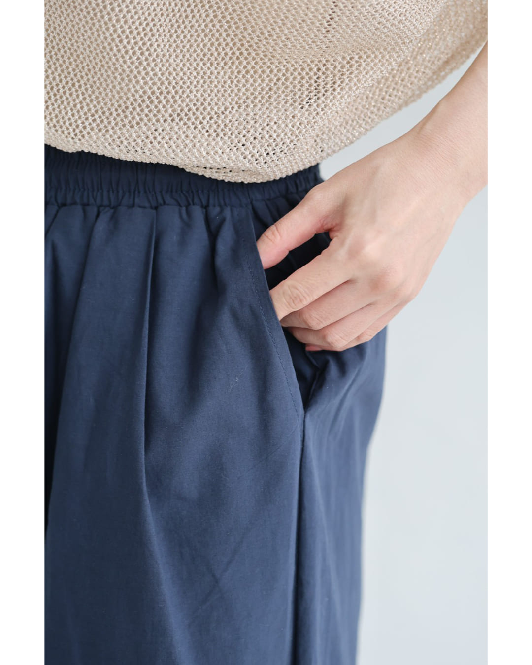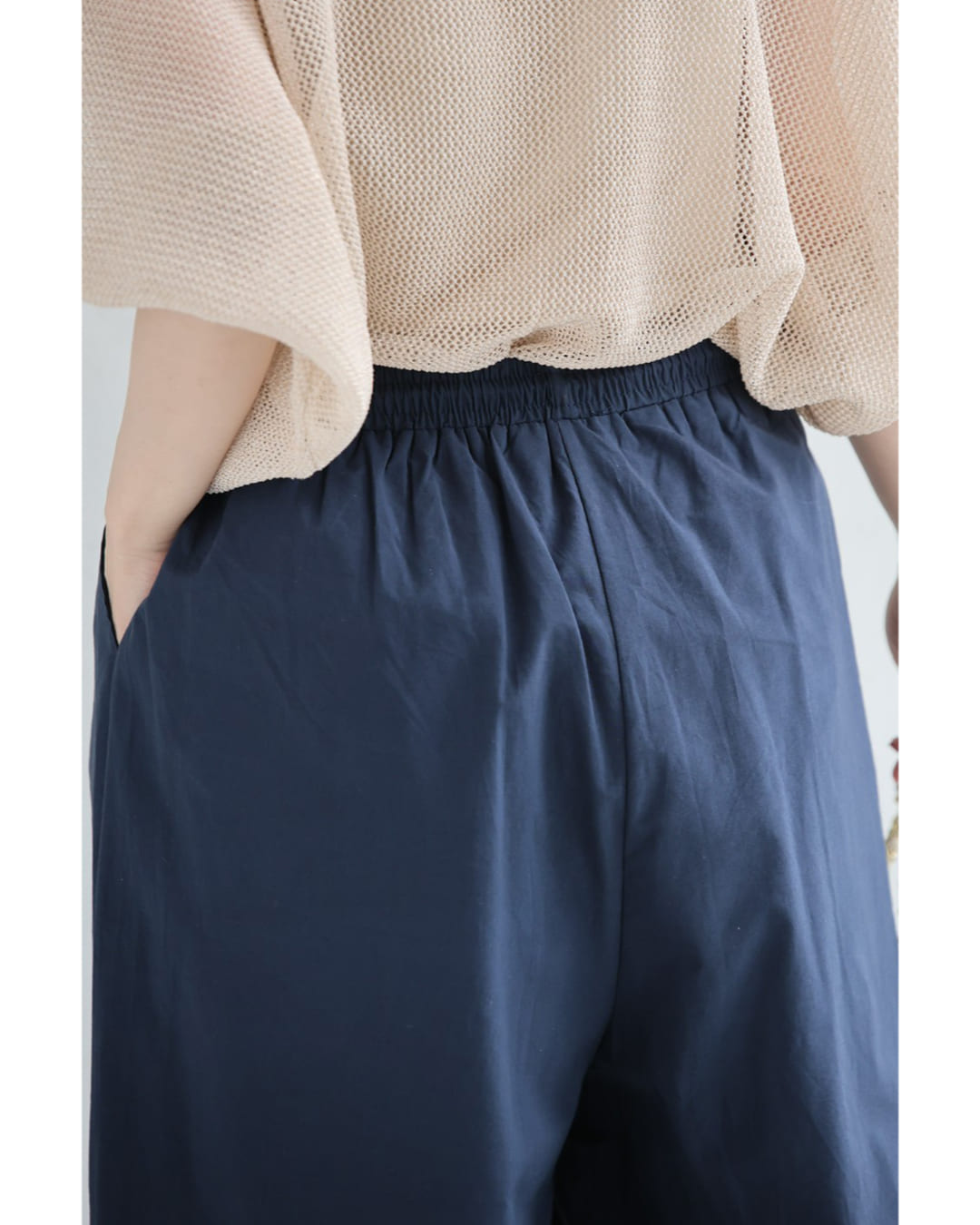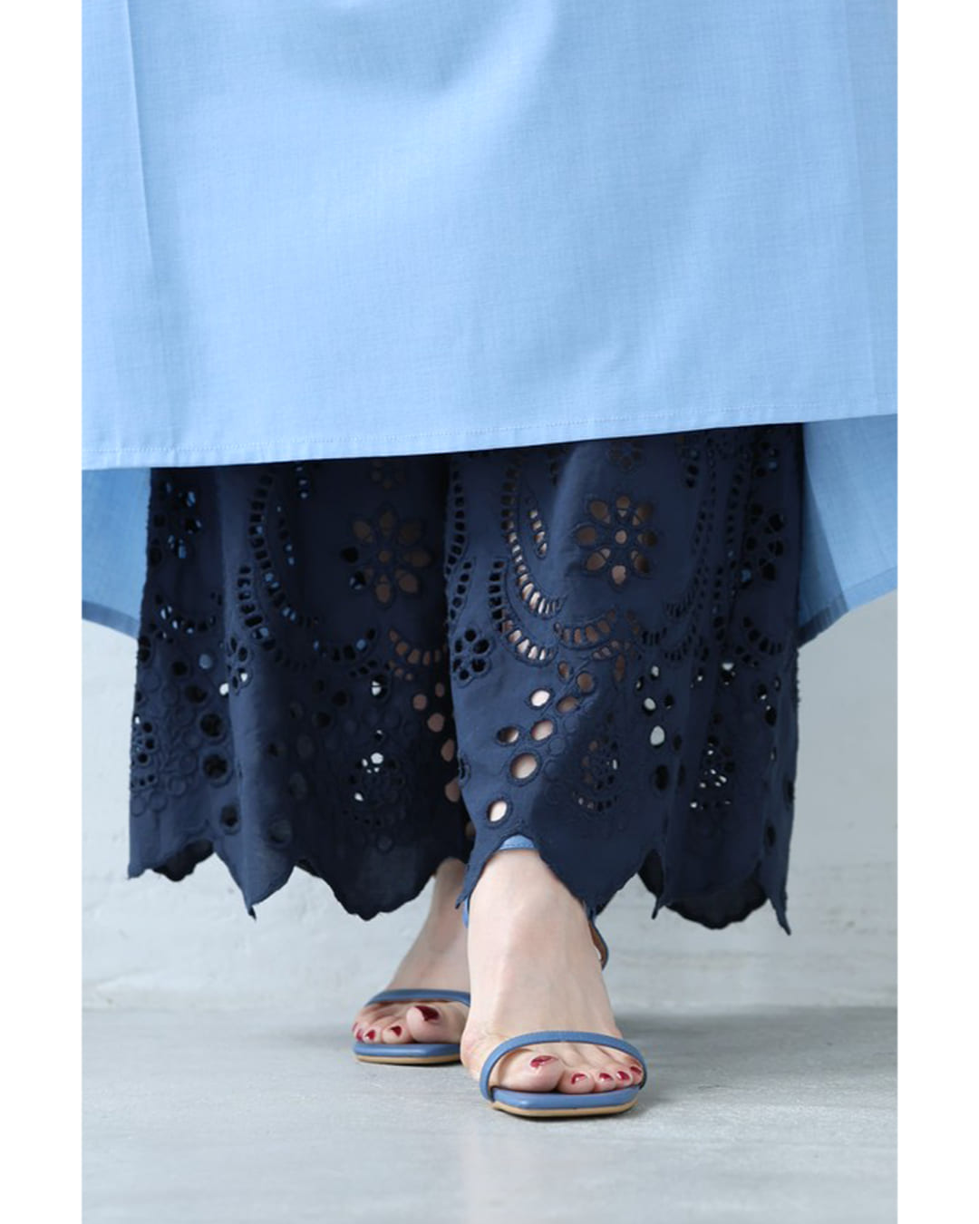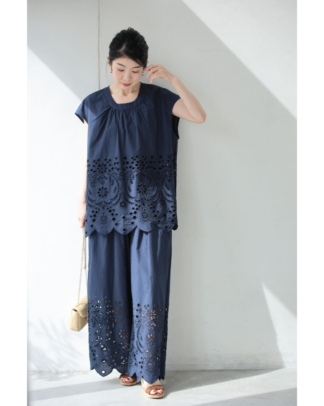 SからL対応 紺 日差しに透けるパンチングレースのワイドパンツ