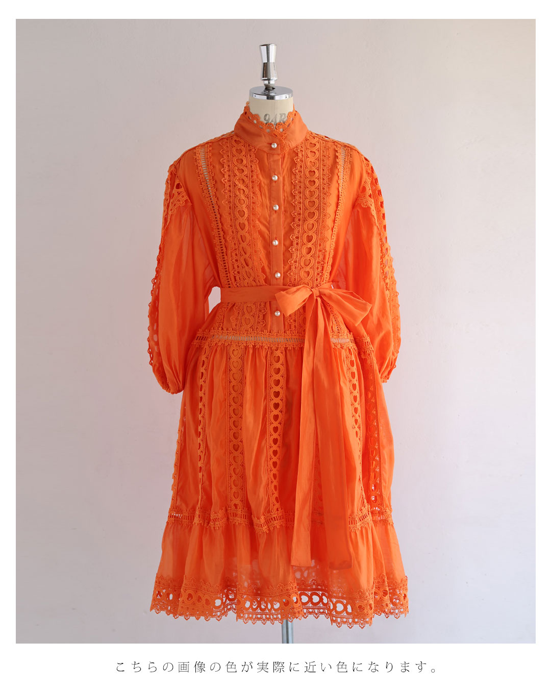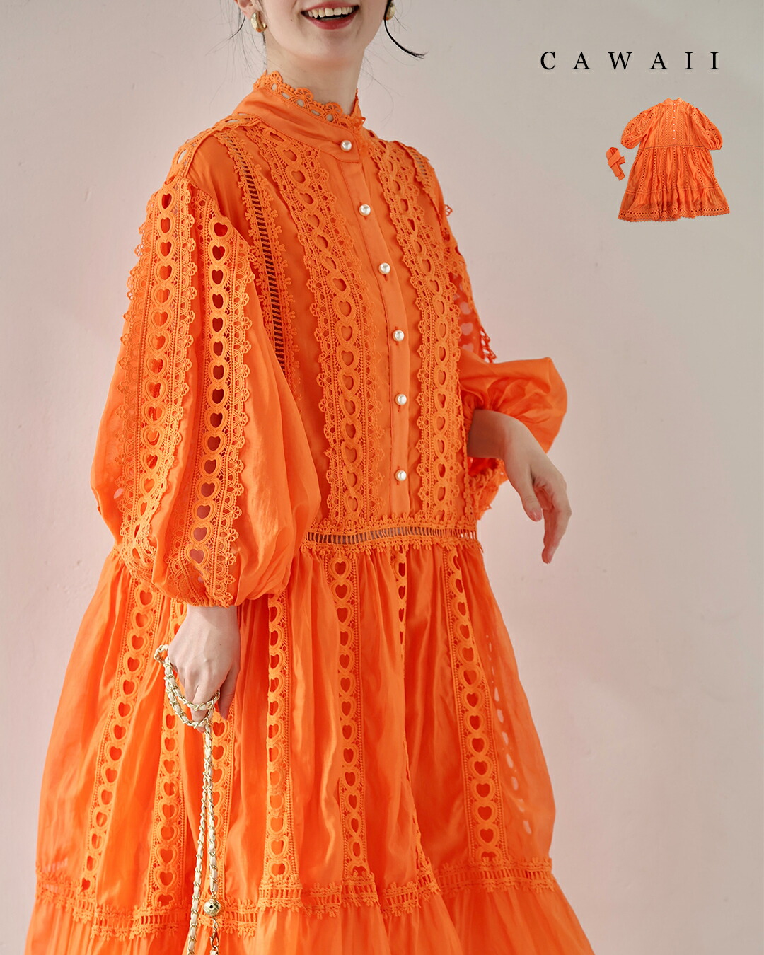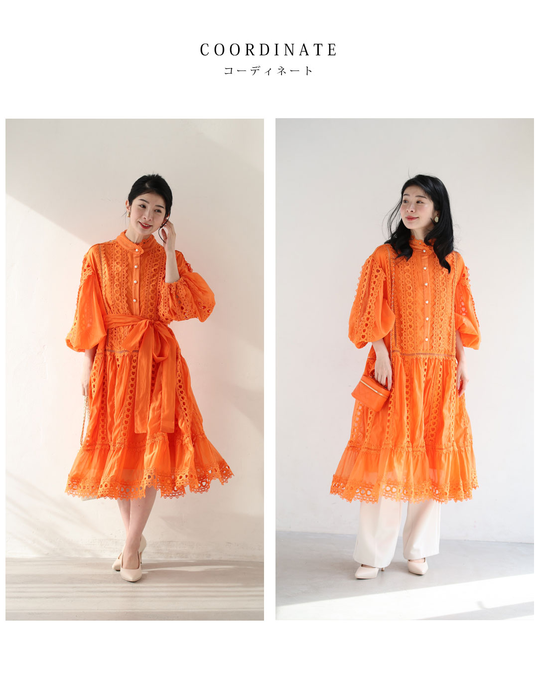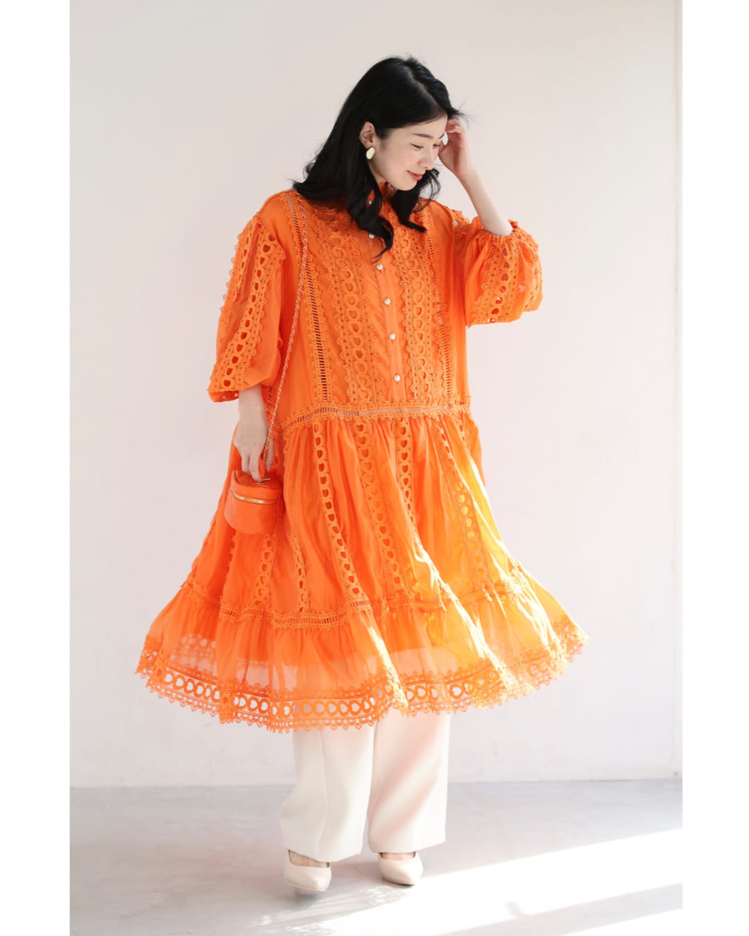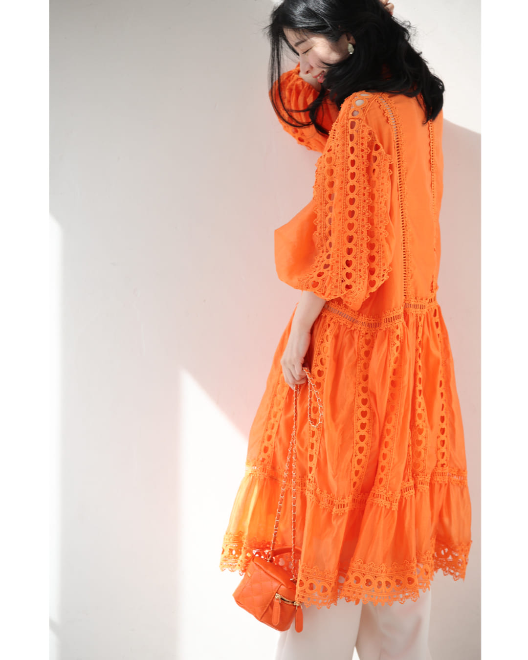 w61648ps 新作 新着 再入荷 CAWAII FRENCHPAVE フレンチパヴェ エレガント ベーシック カジュアル 可愛い かわいい カワイイ おしゃれ オシャレ お洒落 個性 個性的 定番 ベーシック 大人かわいい 大人可愛い 上品 女性らしい デザイン スタンダード ナチュラル きれいめ キレイめ シンプル フェミニン レディース レディースファッション 大人 ママ ミセス 30代 40代 50代 60代 太陽に映えるオレンジのふんわりレースミディアムワンピース リボン付 半端袖7分袖 S M L XL 3L ワンサイズ フリー 小さめ 小さい 低身長 痩せ ほっそり 小柄 細身 標準サイズ 大きめシルエット 大きい ビッグシルエット ゆったり F サイズ自由 春 夏 春服 春物 夏服 夏物 ビタミンカラー アイレットレース パフスリーブ 前ボタン ティアード 日常 おでかけ サマードレス 海外 リゾート レイヤード