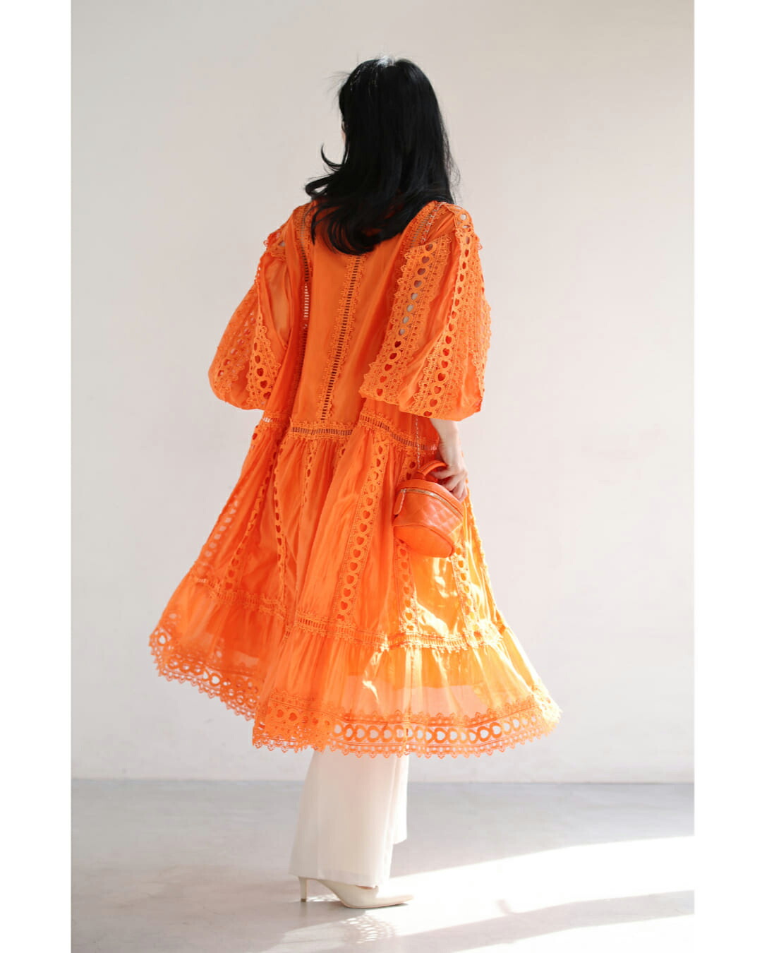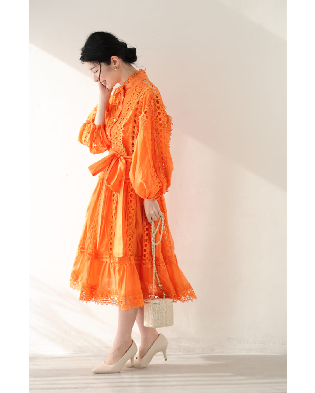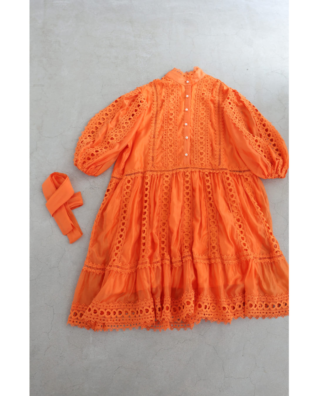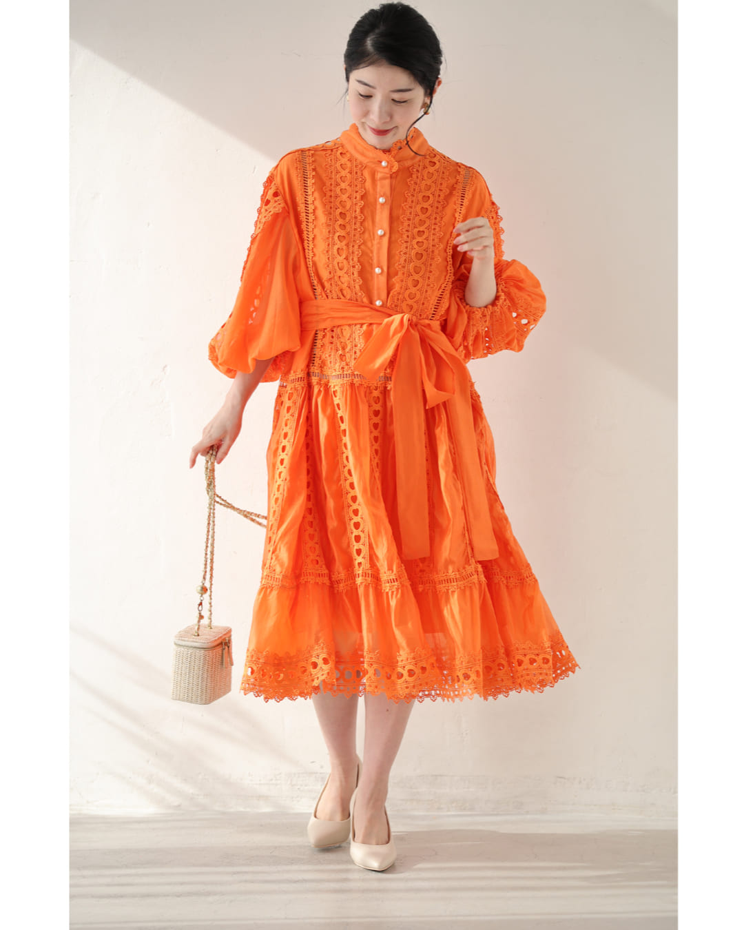 w61648ps 新作 新着 再入荷 CAWAII FRENCHPAVE フレンチパヴェ エレガント ベーシック カジュアル 可愛い かわいい カワイイ おしゃれ オシャレ お洒落 個性 個性的 定番 ベーシック 大人かわいい 大人可愛い 上品 女性らしい デザイン スタンダード ナチュラル きれいめ キレイめ シンプル フェミニン レディース レディースファッション 大人 ママ ミセス 30代 40代 50代 60代 太陽に映えるオレンジのふんわりレースミディアムワンピース リボン付 半端袖7分袖 S M L XL 3L ワンサイズ フリー 小さめ 小さい 低身長 痩せ ほっそり 小柄 細身 標準サイズ 大きめシルエット 大きい ビッグシルエット ゆったり F サイズ自由 春 夏 春服 春物 夏服 夏物 ビタミンカラー アイレットレース パフスリーブ 前ボタン ティアード 日常 おでかけ サマードレス 海外 リゾート レイヤード