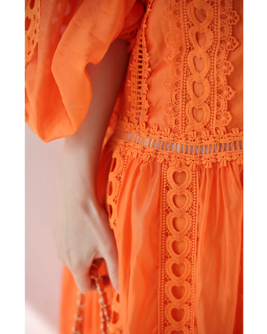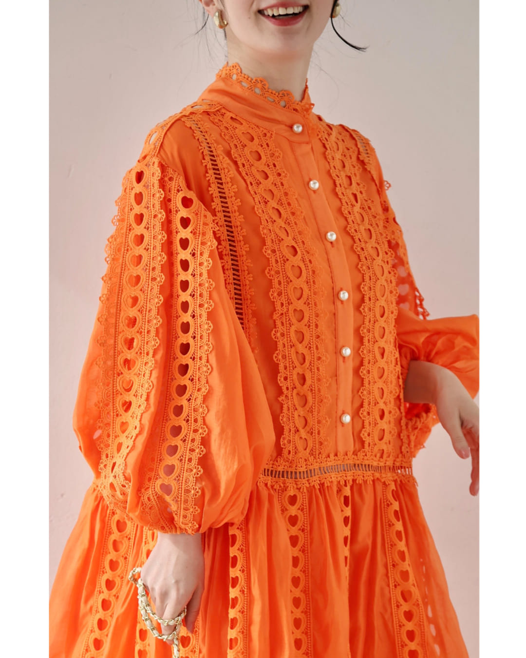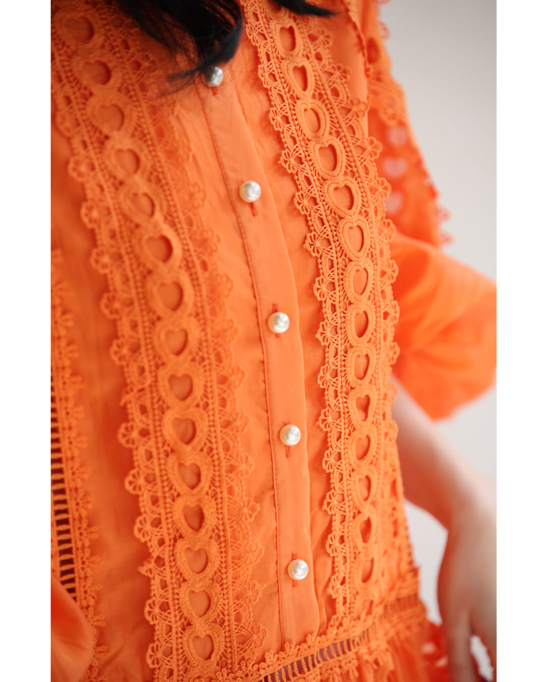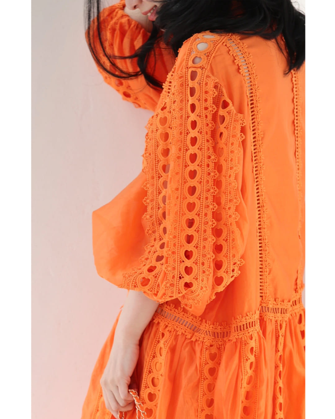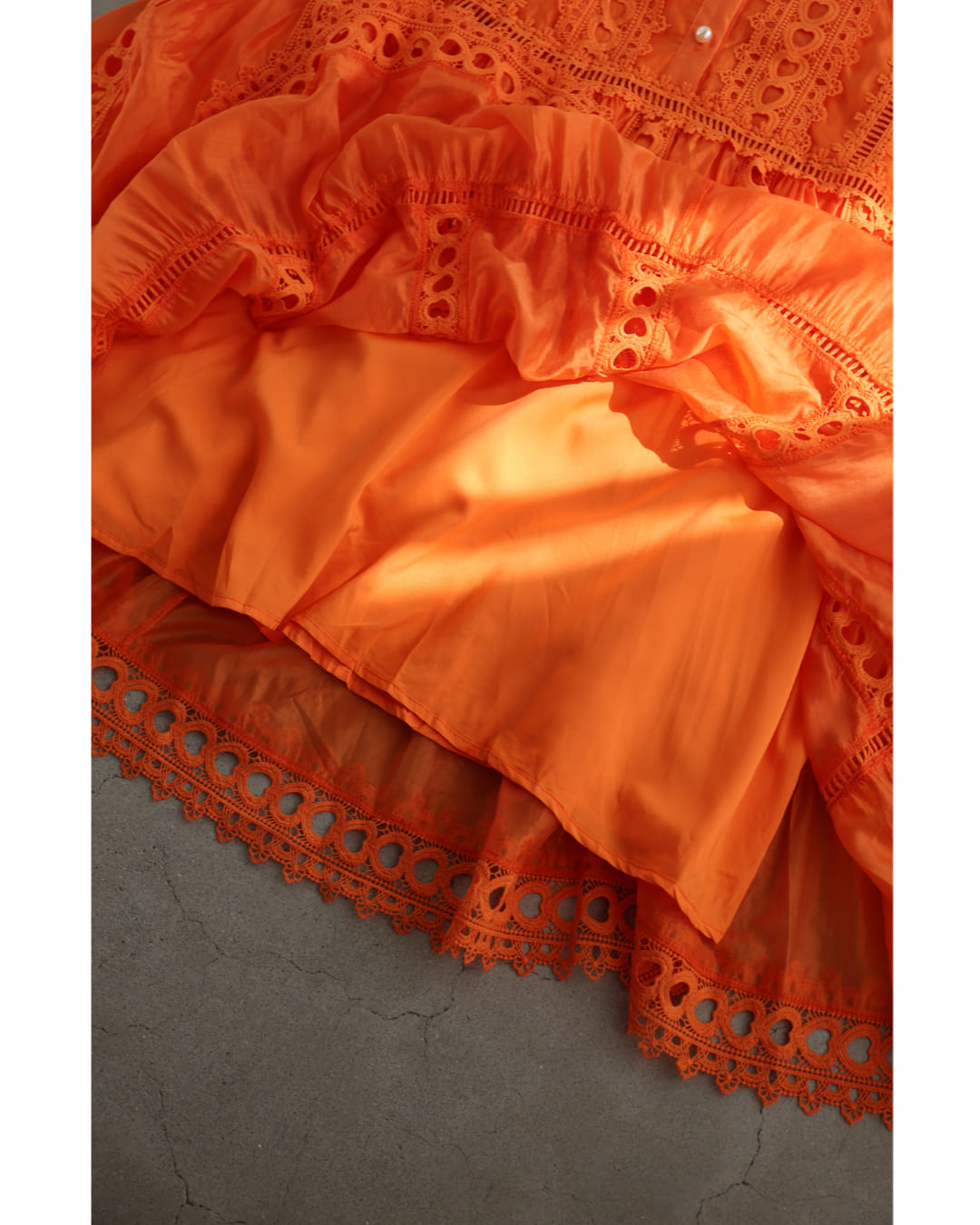 w61648ps 新作 新着 再入荷 CAWAII FRENCHPAVE フレンチパヴェ エレガント ベーシック カジュアル 可愛い かわいい カワイイ おしゃれ オシャレ お洒落 個性 個性的 定番 ベーシック 大人かわいい 大人可愛い 上品 女性らしい デザイン スタンダード ナチュラル きれいめ キレイめ シンプル フェミニン レディース レディースファッション 大人 ママ ミセス 30代 40代 50代 60代 太陽に映えるオレンジのふんわりレースミディアムワンピース リボン付 半端袖7分袖 S M L XL 3L ワンサイズ フリー 小さめ 小さい 低身長 痩せ ほっそり 小柄 細身 標準サイズ 大きめシルエット 大きい ビッグシルエット ゆったり F サイズ自由 春 夏 春服 春物 夏服 夏物 ビタミンカラー アイレットレース パフスリーブ 前ボタン ティアード 日常 おでかけ サマードレス 海外 リゾート レイヤード