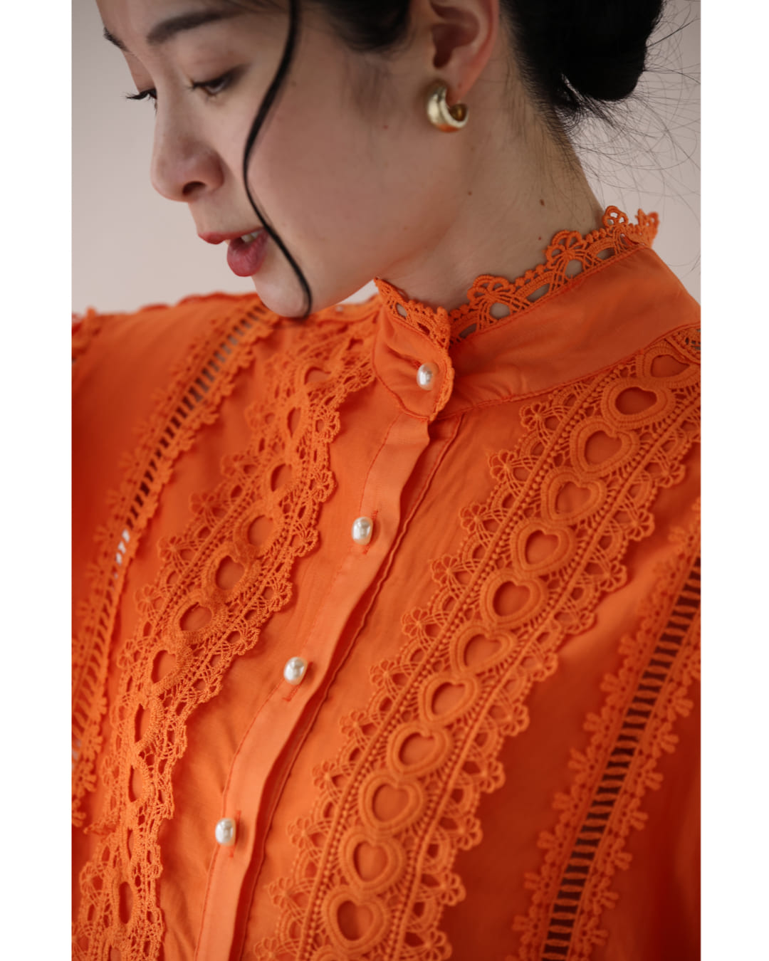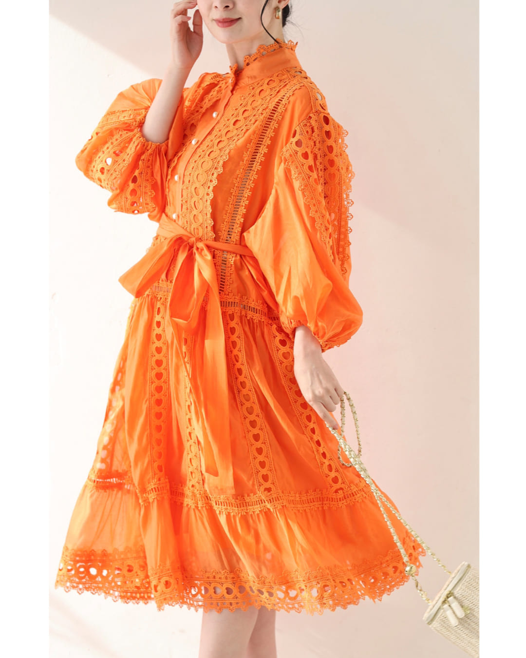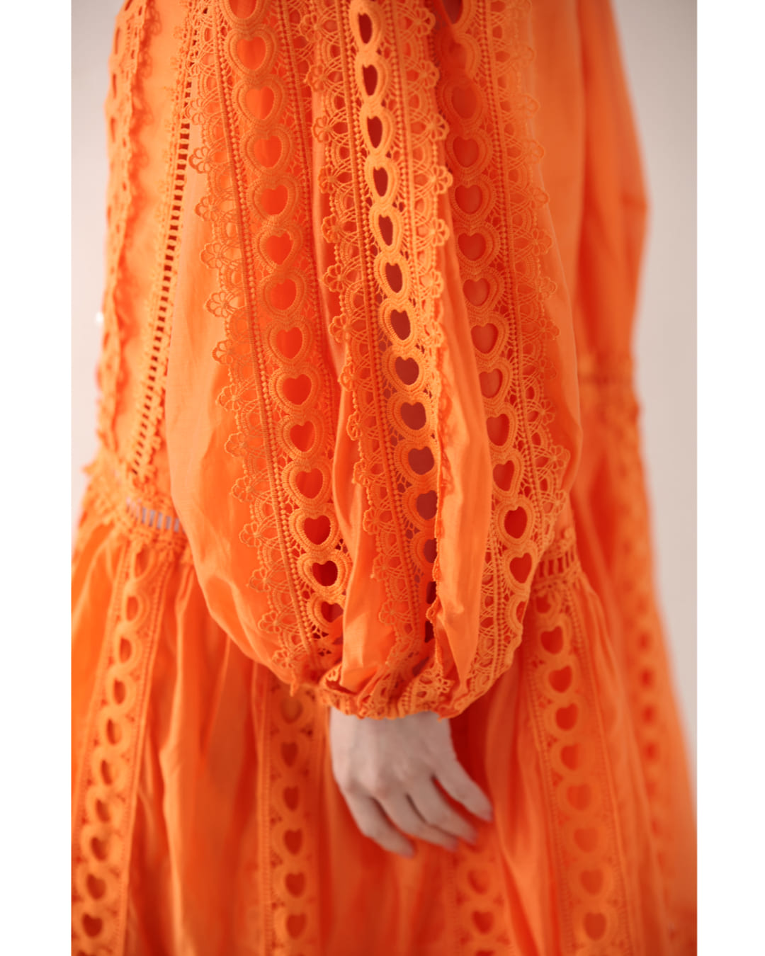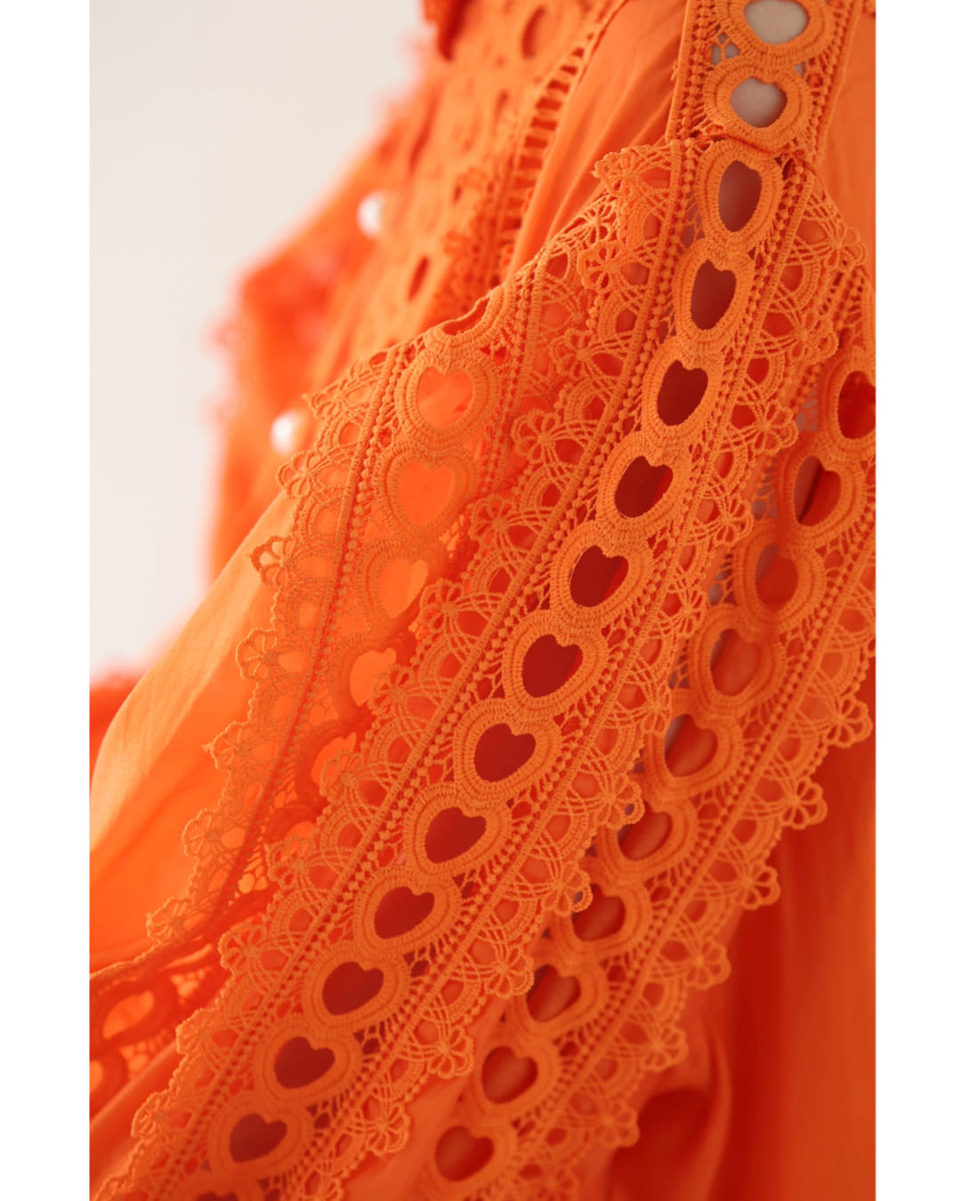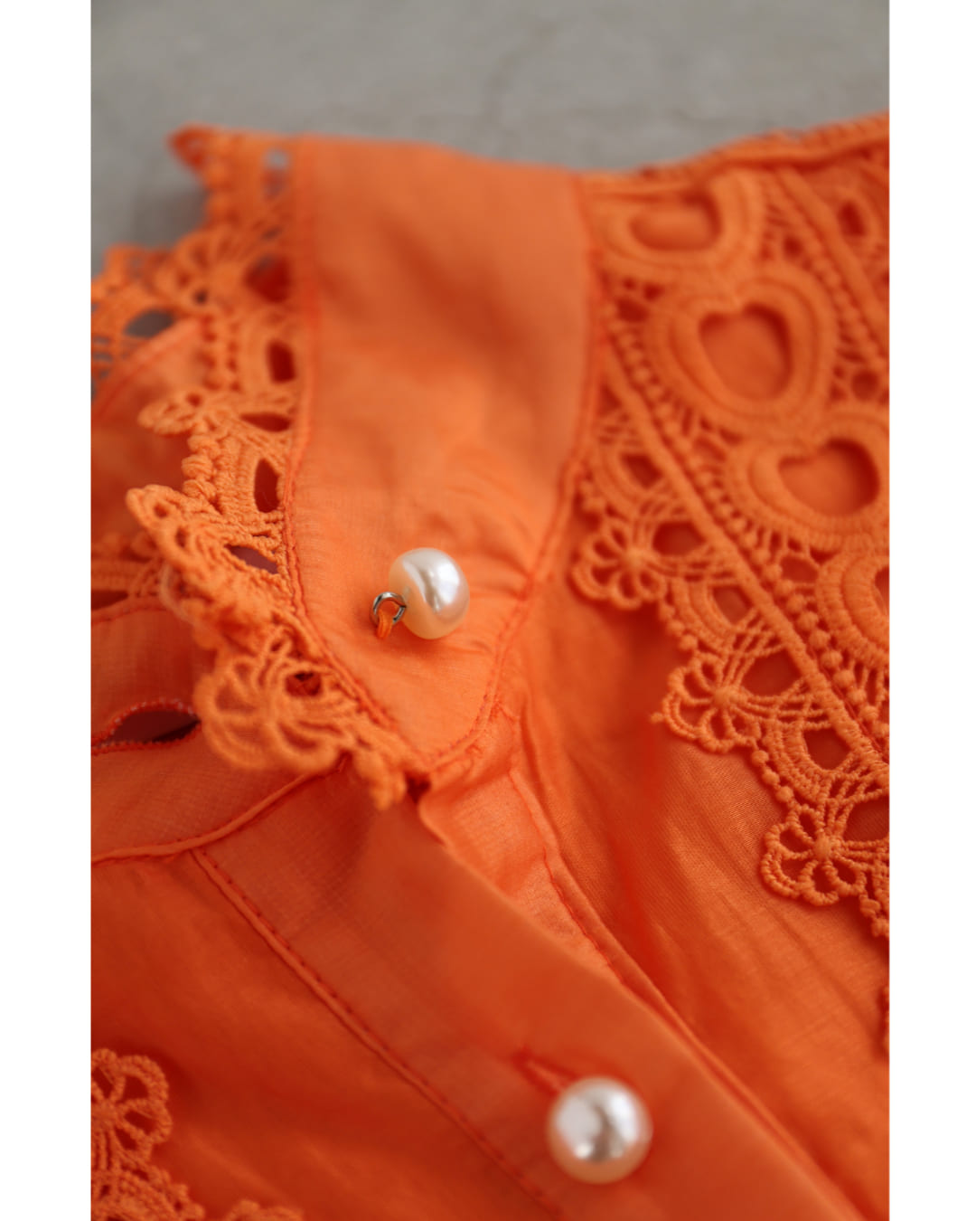 w61648ps 新作 新着 再入荷 CAWAII FRENCHPAVE フレンチパヴェ エレガント ベーシック カジュアル 可愛い かわいい カワイイ おしゃれ オシャレ お洒落 個性 個性的 定番 ベーシック 大人かわいい 大人可愛い 上品 女性らしい デザイン スタンダード ナチュラル きれいめ キレイめ シンプル フェミニン レディース レディースファッション 大人 ママ ミセス 30代 40代 50代 60代 太陽に映えるオレンジのふんわりレースミディアムワンピース リボン付 半端袖7分袖 S M L XL 3L ワンサイズ フリー 小さめ 小さい 低身長 痩せ ほっそり 小柄 細身 標準サイズ 大きめシルエット 大きい ビッグシルエット ゆったり F サイズ自由 春 夏 春服 春物 夏服 夏物 ビタミンカラー アイレットレース パフスリーブ 前ボタン ティアード 日常 おでかけ サマードレス 海外 リゾート レイヤード