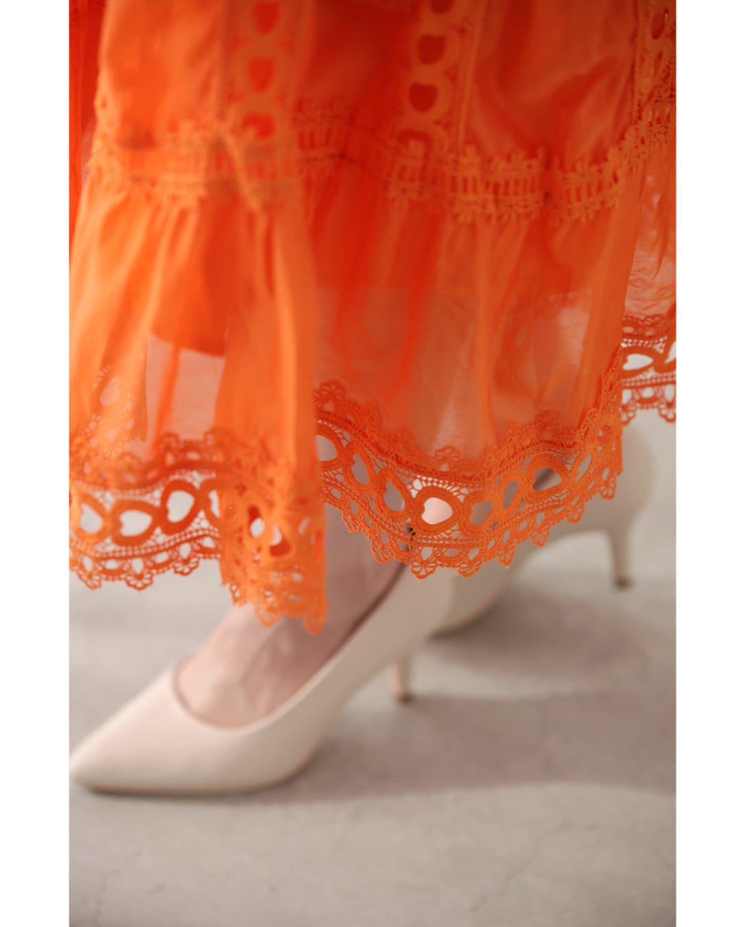 Sから3L対応 太陽に映えるオレンジのふんわりレースミディアムワンピース リボン付き