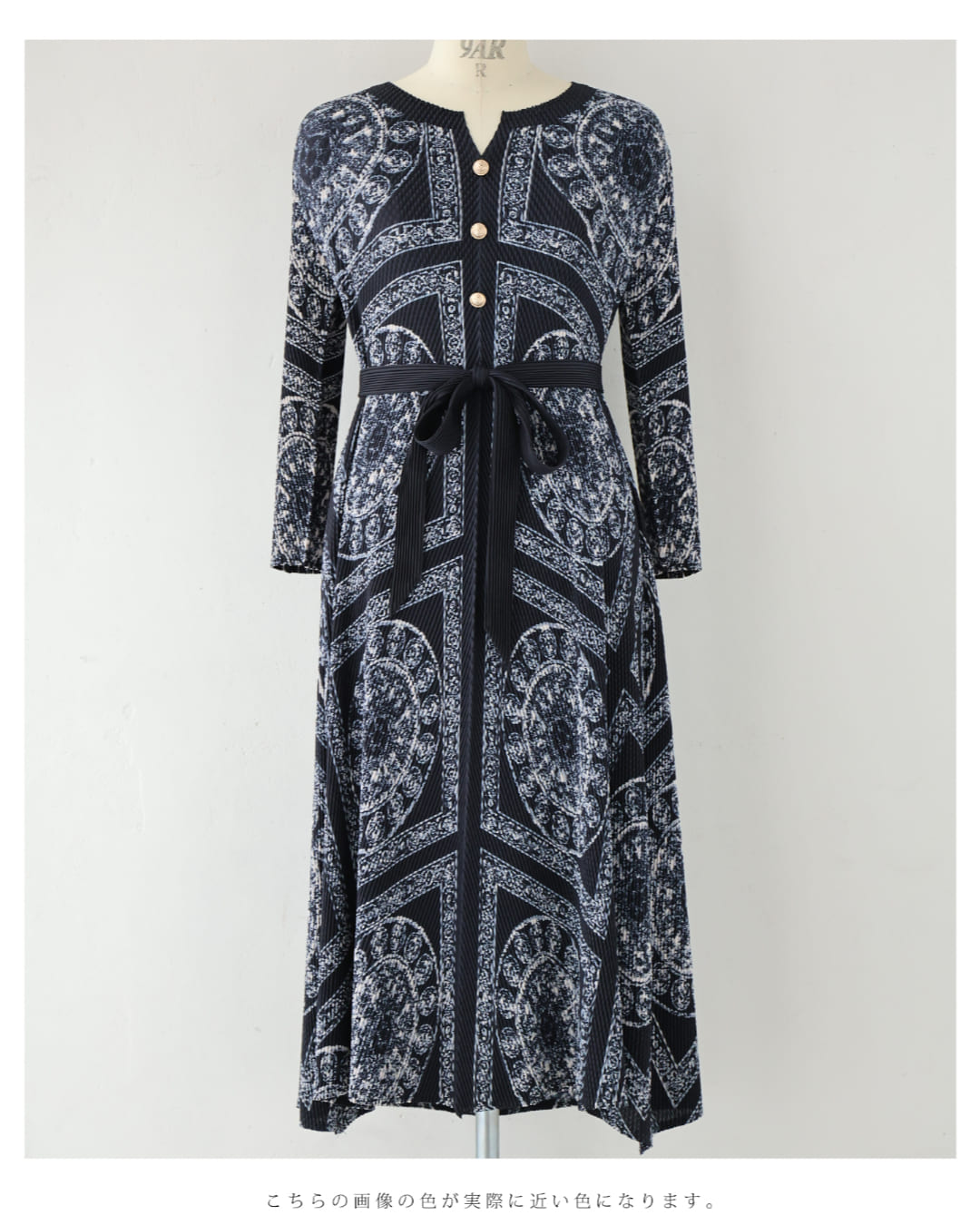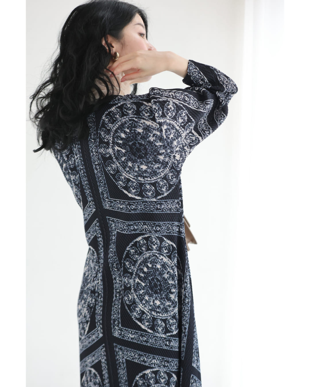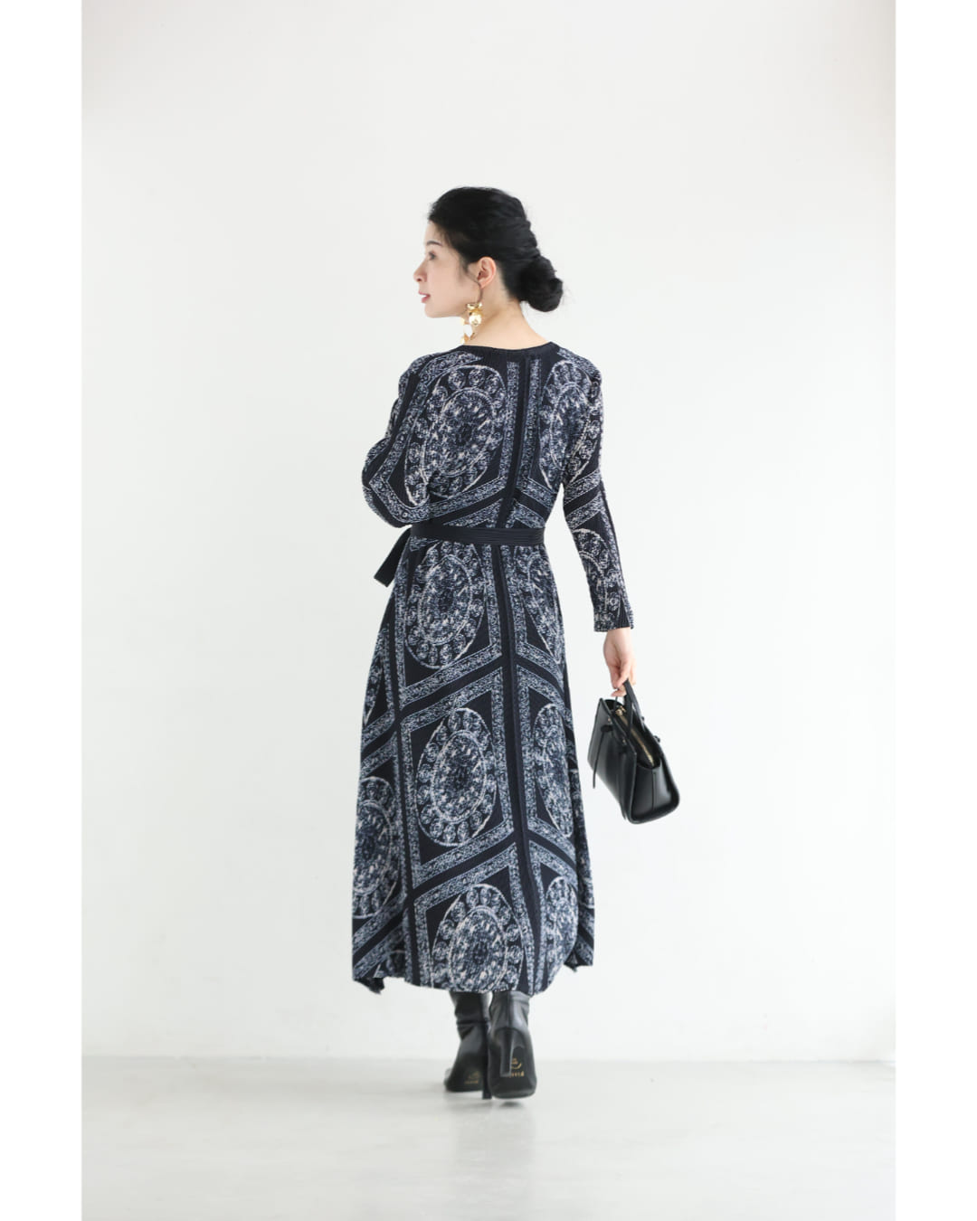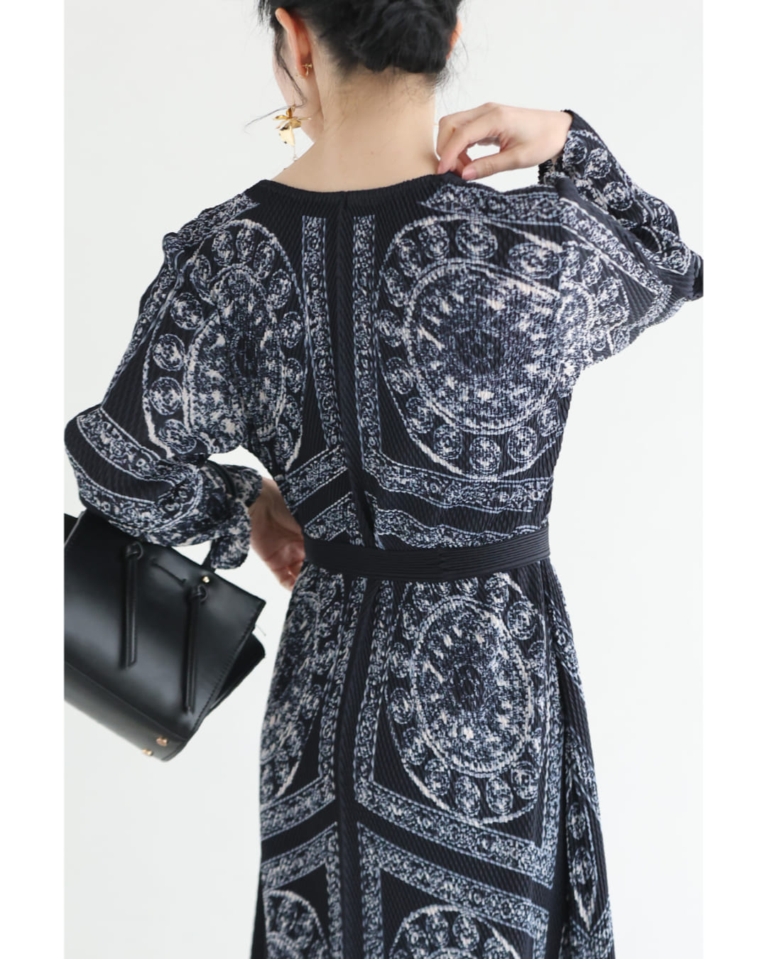 w61683ps 新作 新着 再入荷 CAWAII FRENCHPAVE フレンチパヴェ エレガント ベーシック カジュアル 可愛い かわいい カワイイ おしゃれ オシャレ お洒落 個性 個性的 定番 ベーシック 大人かわいい 大人可愛い 上品 女性らしい デザイン スタンダード ナチュラル きれいめ キレイめ シンプル フェミニン レディース レディースファッション 大人 ママ ミセス 30代 40代 50代 60代 黒 伸びやか 揺らめく スカーフ柄 ロング ワンピース リボンベルト付き 半端袖 八分袖 九分袖 S M L XL 3L ワンサイズ フリー 小さめ 小さい 低身長 痩せ ほっそり 小柄 細身 標準サイズ 大きめシルエット 大きい ビッグシルエット ゆったり F サイズ自由 春 夏 春服 春物 夏服 夏物 伸縮 ブラック 黒 柄 総柄 日常着 おでかけ リゾート 旅行 異国感 アコーディオンプリーツ 楽 大柄