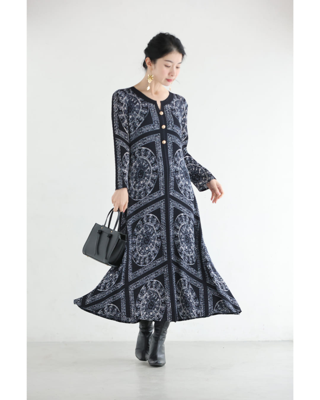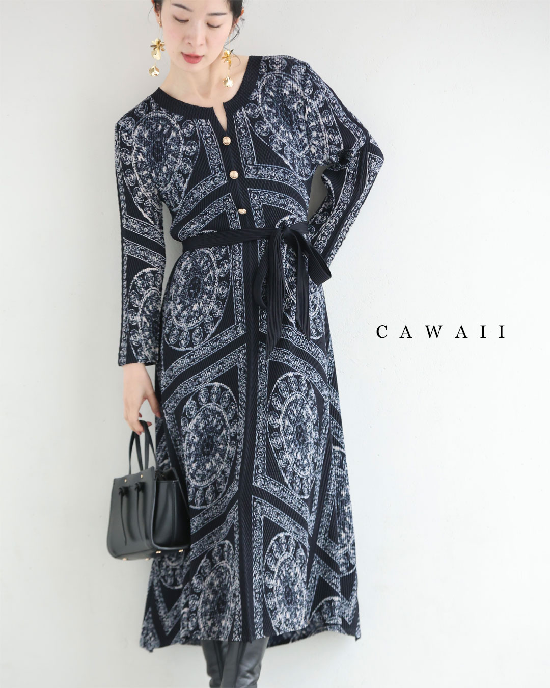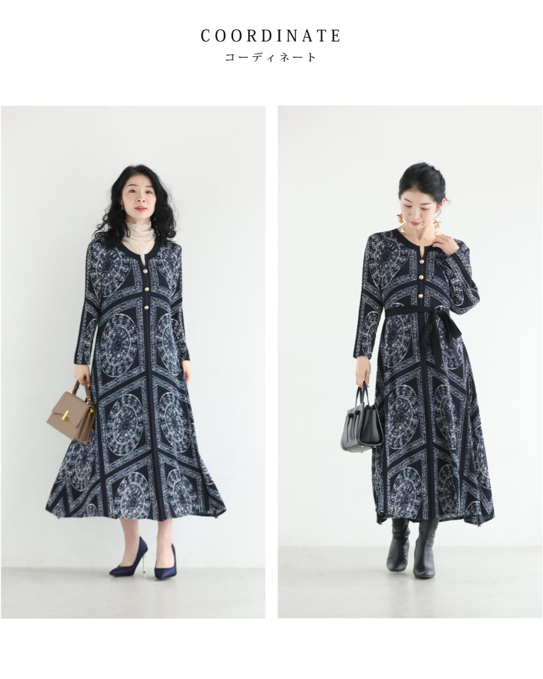 w61683ps 新作 新着 再入荷 CAWAII FRENCHPAVE フレンチパヴェ エレガント ベーシック カジュアル 可愛い かわいい カワイイ おしゃれ オシャレ お洒落 個性 個性的 定番 ベーシック 大人かわいい 大人可愛い 上品 女性らしい デザイン スタンダード ナチュラル きれいめ キレイめ シンプル フェミニン レディース レディースファッション 大人 ママ ミセス 30代 40代 50代 60代 黒 伸びやか 揺らめく スカーフ柄 ロング ワンピース リボンベルト付き 半端袖 八分袖 九分袖 S M L XL 3L ワンサイズ フリー 小さめ 小さい 低身長 痩せ ほっそり 小柄 細身 標準サイズ 大きめシルエット 大きい ビッグシルエット ゆったり F サイズ自由 春 夏 春服 春物 夏服 夏物 伸縮 ブラック 黒 柄 総柄 日常着 おでかけ リゾート 旅行 異国感 アコーディオンプリーツ 楽 大柄