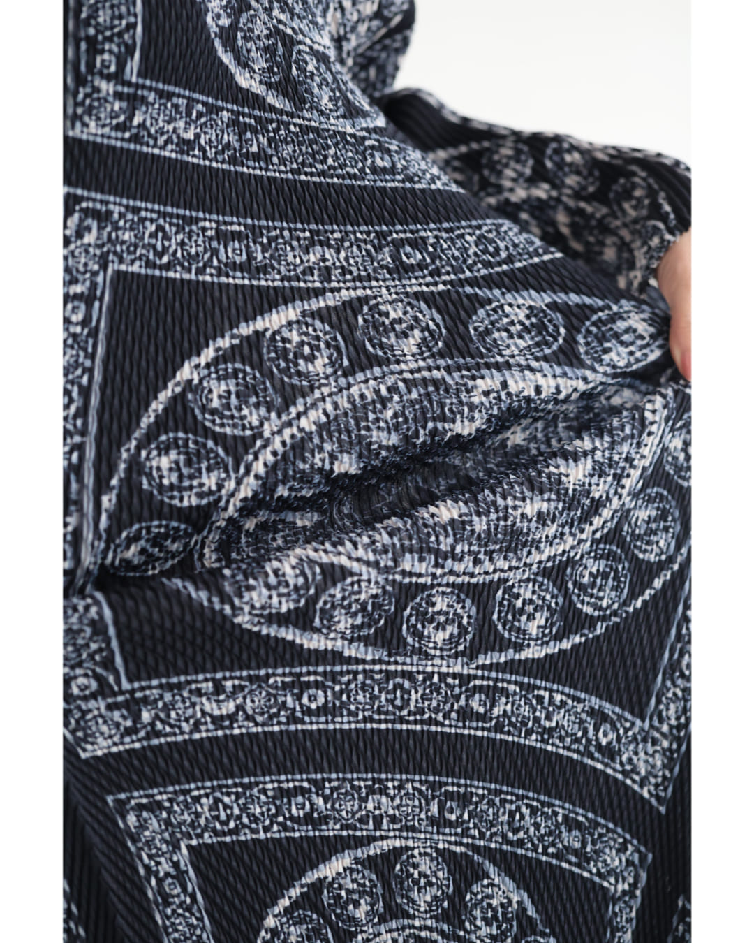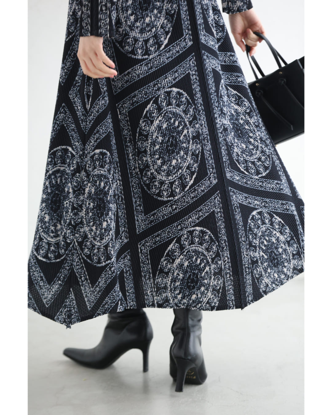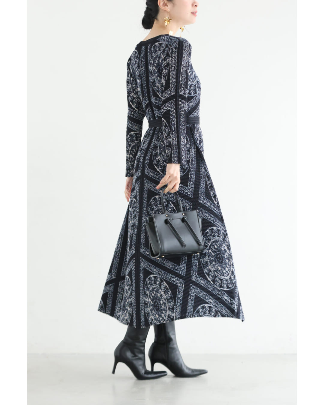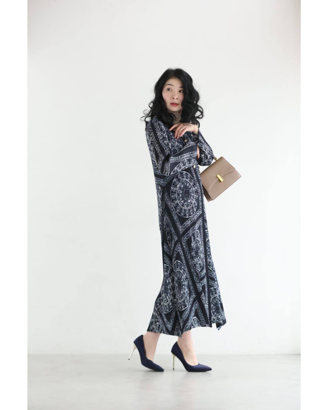 w61683ps 新作 新着 再入荷 CAWAII FRENCHPAVE フレンチパヴェ エレガント ベーシック カジュアル 可愛い かわいい カワイイ おしゃれ オシャレ お洒落 個性 個性的 定番 ベーシック 大人かわいい 大人可愛い 上品 女性らしい デザイン スタンダード ナチュラル きれいめ キレイめ シンプル フェミニン レディース レディースファッション 大人 ママ ミセス 30代 40代 50代 60代 黒 伸びやか 揺らめく スカーフ柄 ロング ワンピース リボンベルト付き 半端袖 八分袖 九分袖 S M L XL 3L ワンサイズ フリー 小さめ 小さい 低身長 痩せ ほっそり 小柄 細身 標準サイズ 大きめシルエット 大きい ビッグシルエット ゆったり F サイズ自由 春 夏 春服 春物 夏服 夏物 伸縮 ブラック 黒 柄 総柄 日常着 おでかけ リゾート 旅行 異国感 アコーディオンプリーツ 楽 大柄
