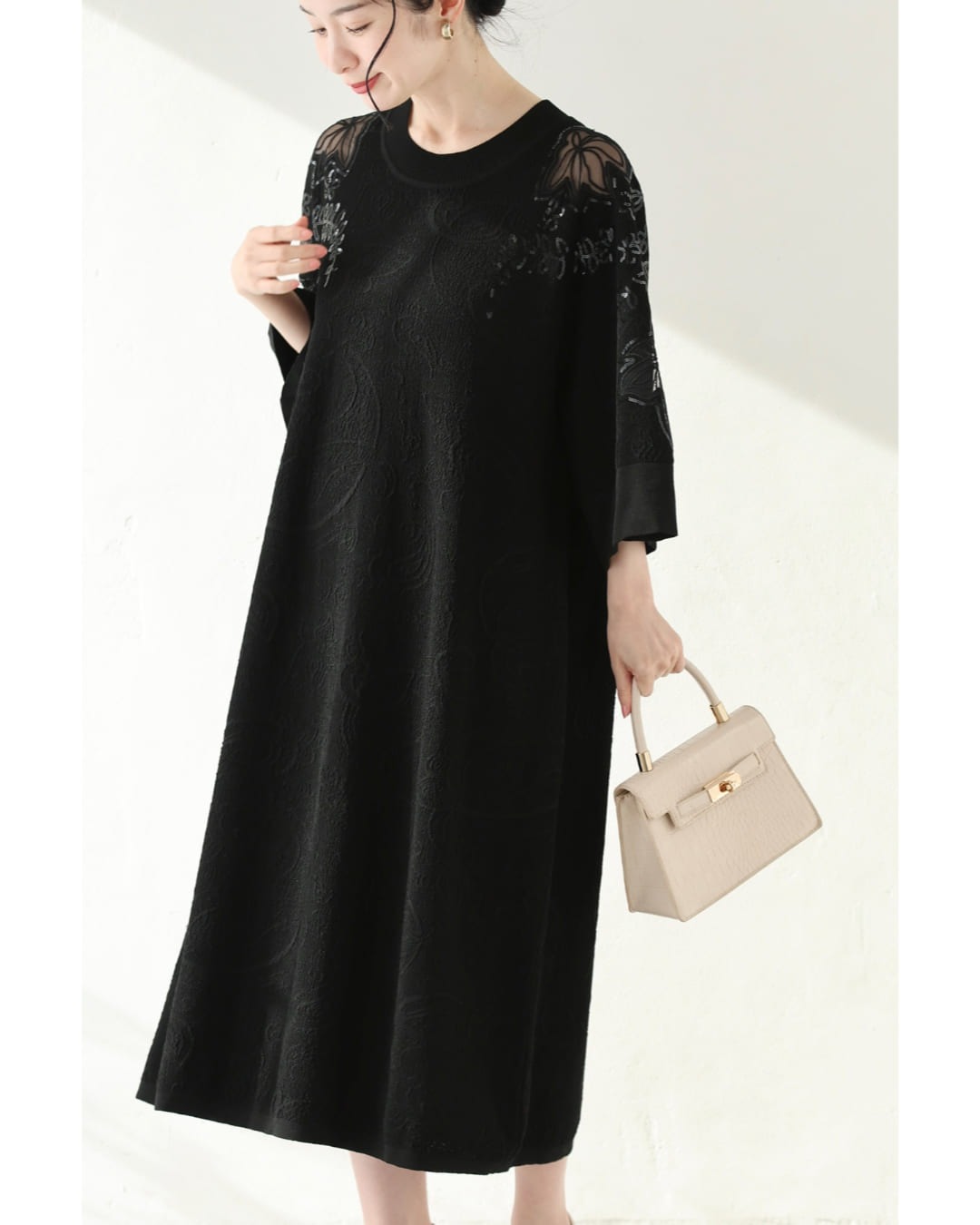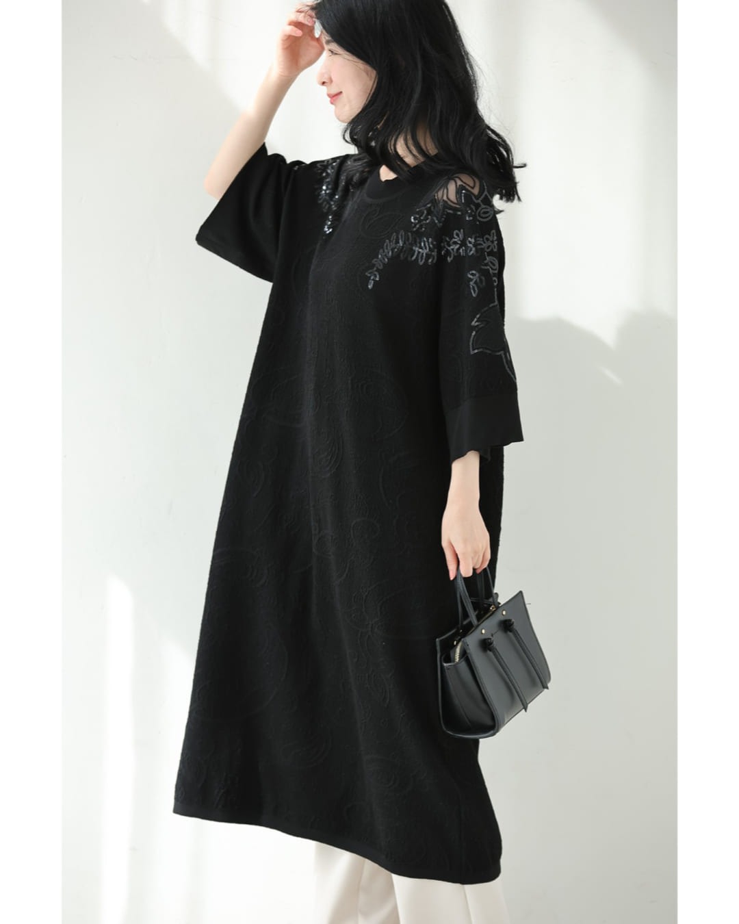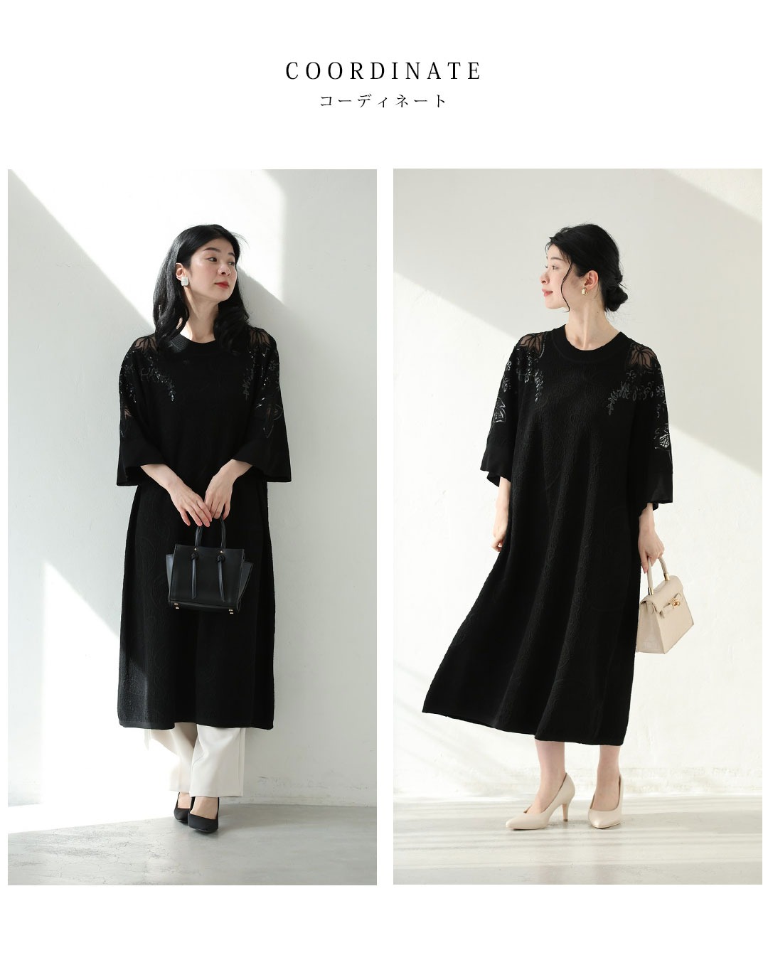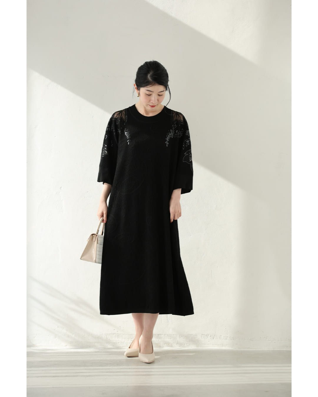 w61686ps 新作 新着 再入荷 CAWAII FRENCHPAVE フレンチパヴェ エレガント ベーシック カジュアル 可愛い かわいい カワイイ おしゃれ オシャレ お洒落 個性 個性的 定番 ベーシック 大人かわいい 大人可愛い 上品 女性らしい デザイン スタンダード ナチュラル きれいめ キレイめ シンプル フェミニン レディース レディースファッション 大人 ママ ミセス 30代 40代 50代 60代 スパンコール 花咲く ニット ミディアム ワンピース 半端袖7分袖 S M L XL 3L ワンサイズ フリー 小さめ 小さい 低身長 痩せ ほっそり 小柄 細身 標準サイズ 大きめシルエット 大きい ビッグシルエット ゆったり F サイズ自由 春 夏 春服 春物 夏服 夏物 薄手 楽 伸縮 ブラック 黒 レース 日常使い おでかけ パーティー 女子会 お呼ばれ
