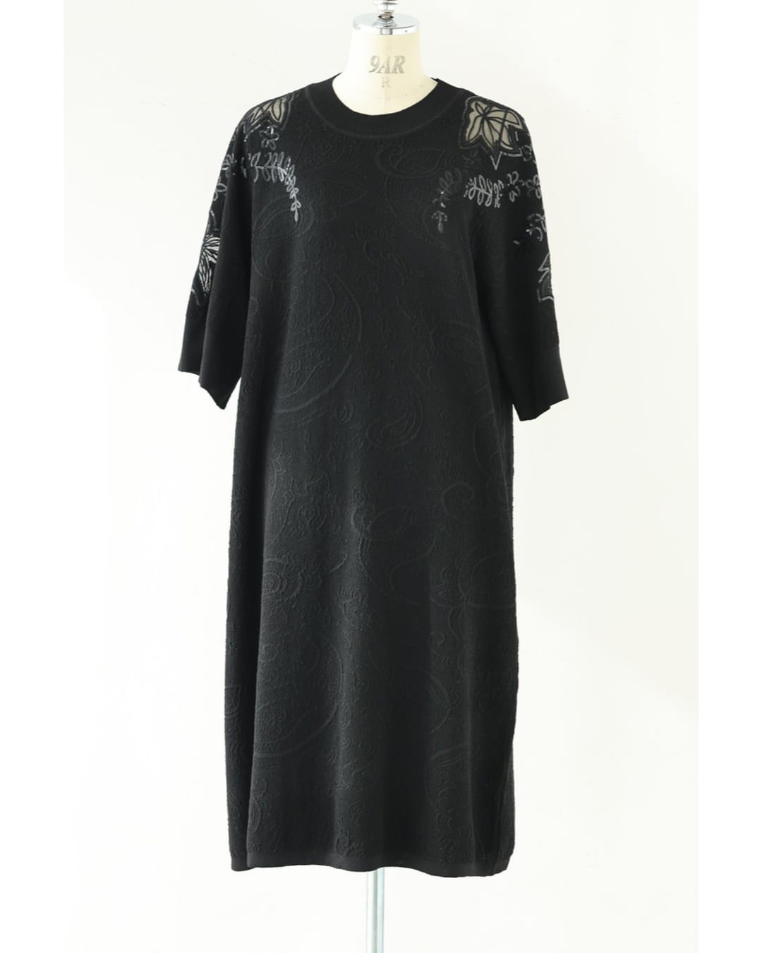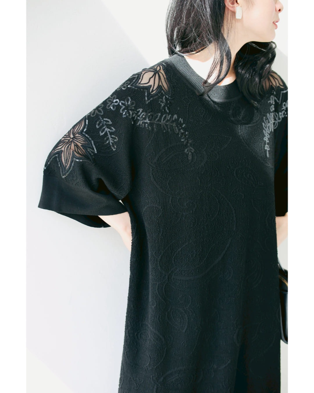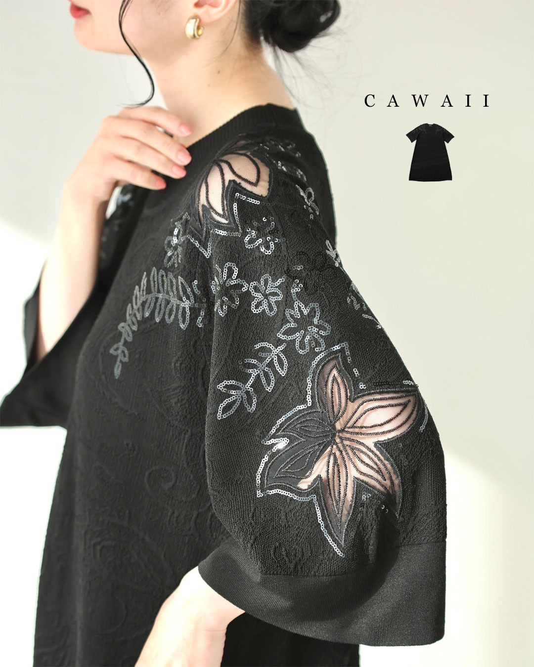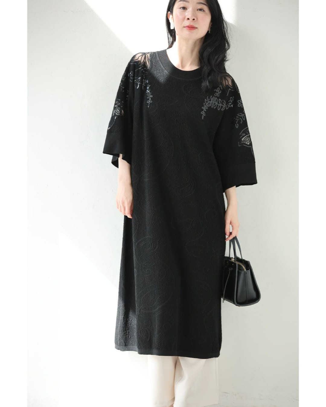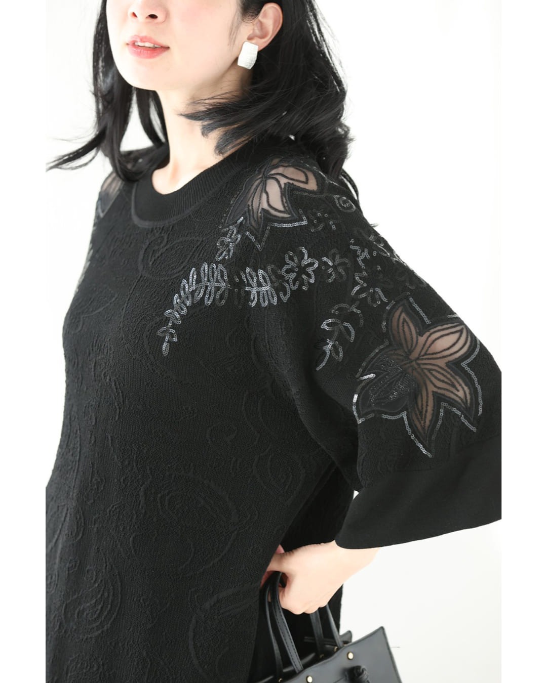 w61686ps 新作 新着 再入荷 CAWAII FRENCHPAVE フレンチパヴェ エレガント ベーシック カジュアル 可愛い かわいい カワイイ おしゃれ オシャレ お洒落 個性 個性的 定番 ベーシック 大人かわいい 大人可愛い 上品 女性らしい デザイン スタンダード ナチュラル きれいめ キレイめ シンプル フェミニン レディース レディースファッション 大人 ママ ミセス 30代 40代 50代 60代 スパンコール 花咲く ニット ミディアム ワンピース 半端袖7分袖 S M L XL 3L ワンサイズ フリー 小さめ 小さい 低身長 痩せ ほっそり 小柄 細身 標準サイズ 大きめシルエット 大きい ビッグシルエット ゆったり F サイズ自由 春 夏 春服 春物 夏服 夏物 薄手 楽 伸縮 ブラック 黒 レース 日常使い おでかけ パーティー 女子会 お呼ばれ
