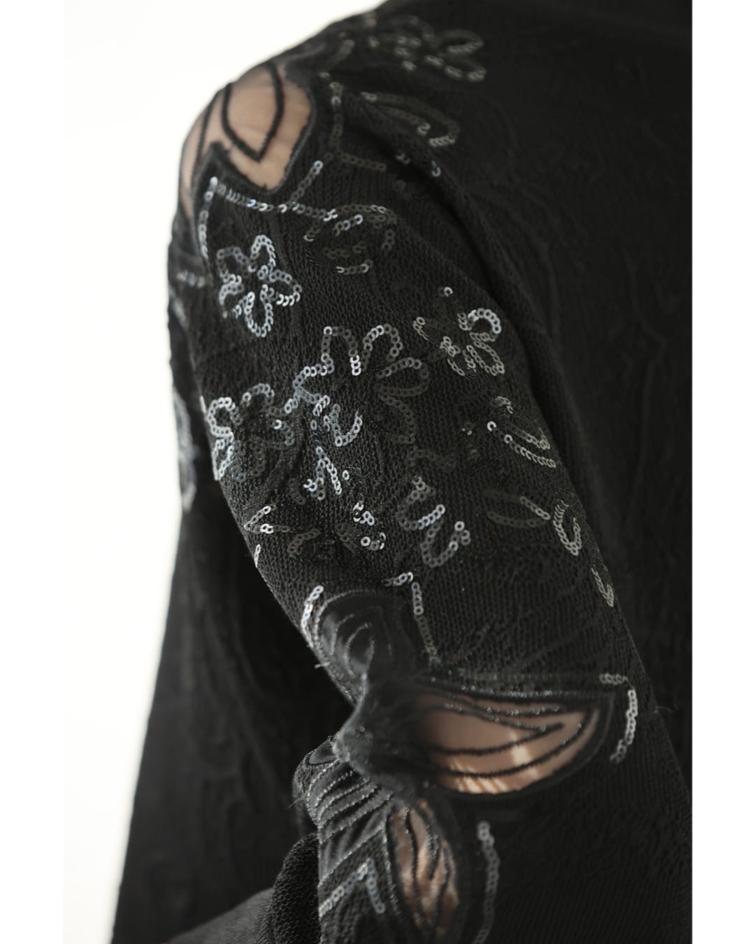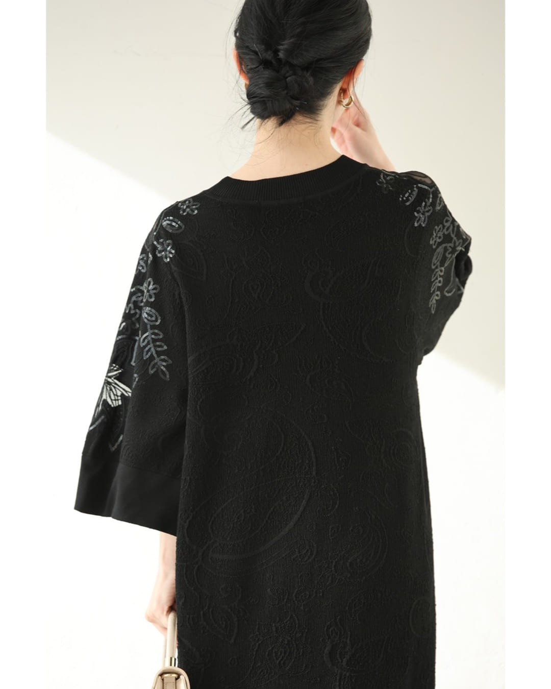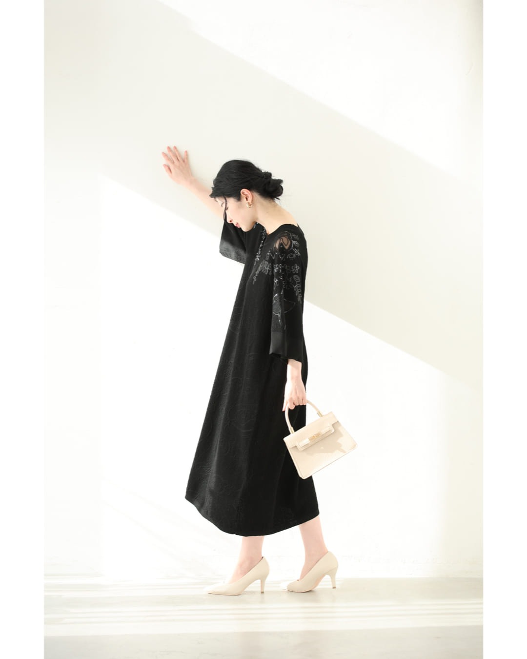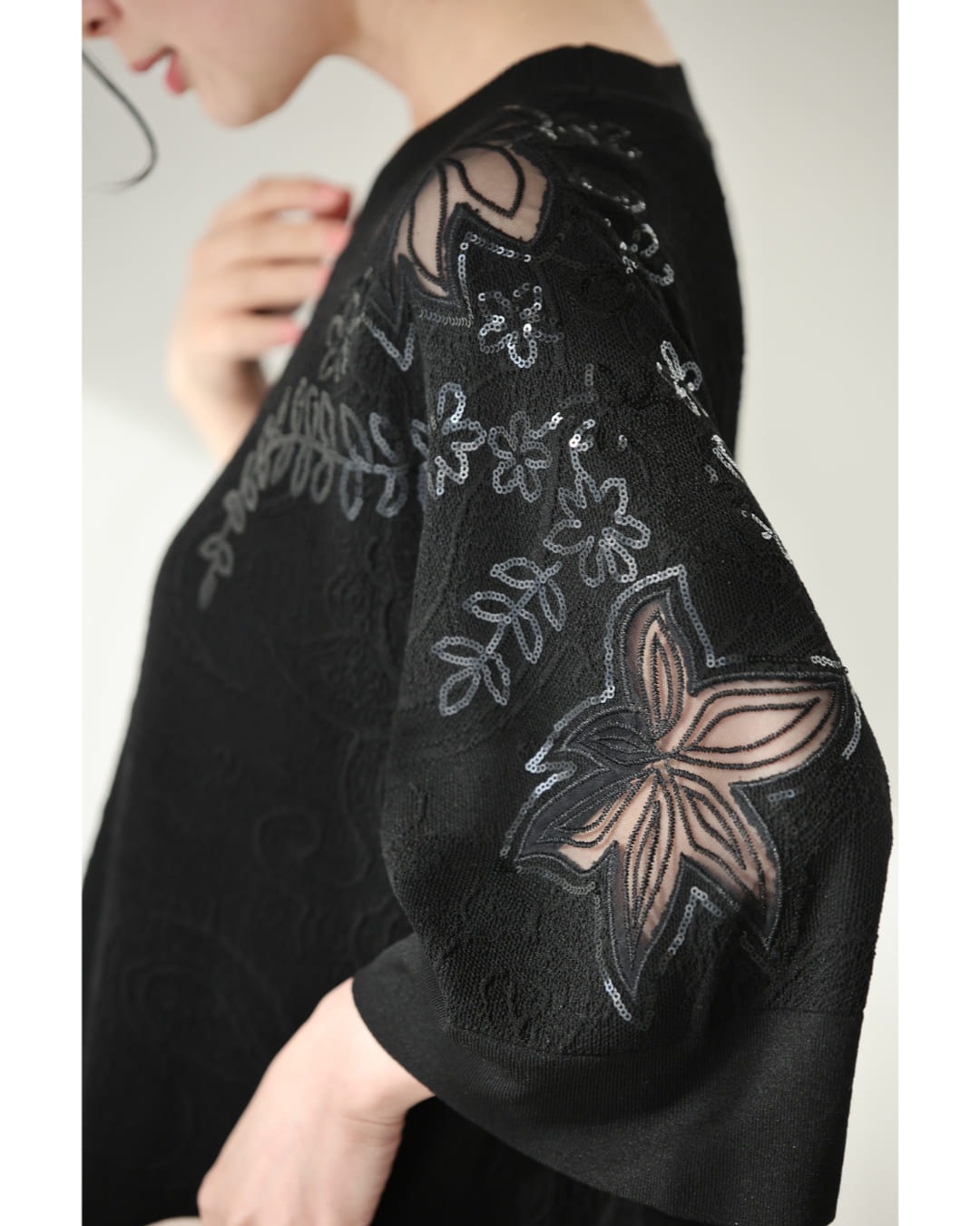 w61686ps 新作 新着 再入荷 CAWAII FRENCHPAVE フレンチパヴェ エレガント ベーシック カジュアル 可愛い かわいい カワイイ おしゃれ オシャレ お洒落 個性 個性的 定番 ベーシック 大人かわいい 大人可愛い 上品 女性らしい デザイン スタンダード ナチュラル きれいめ キレイめ シンプル フェミニン レディース レディースファッション 大人 ママ ミセス 30代 40代 50代 60代 スパンコール 花咲く ニット ミディアム ワンピース 半端袖7分袖 S M L XL 3L ワンサイズ フリー 小さめ 小さい 低身長 痩せ ほっそり 小柄 細身 標準サイズ 大きめシルエット 大きい ビッグシルエット ゆったり F サイズ自由 春 夏 春服 春物 夏服 夏物 薄手 楽 伸縮 ブラック 黒 レース 日常使い おでかけ パーティー 女子会 お呼ばれ
