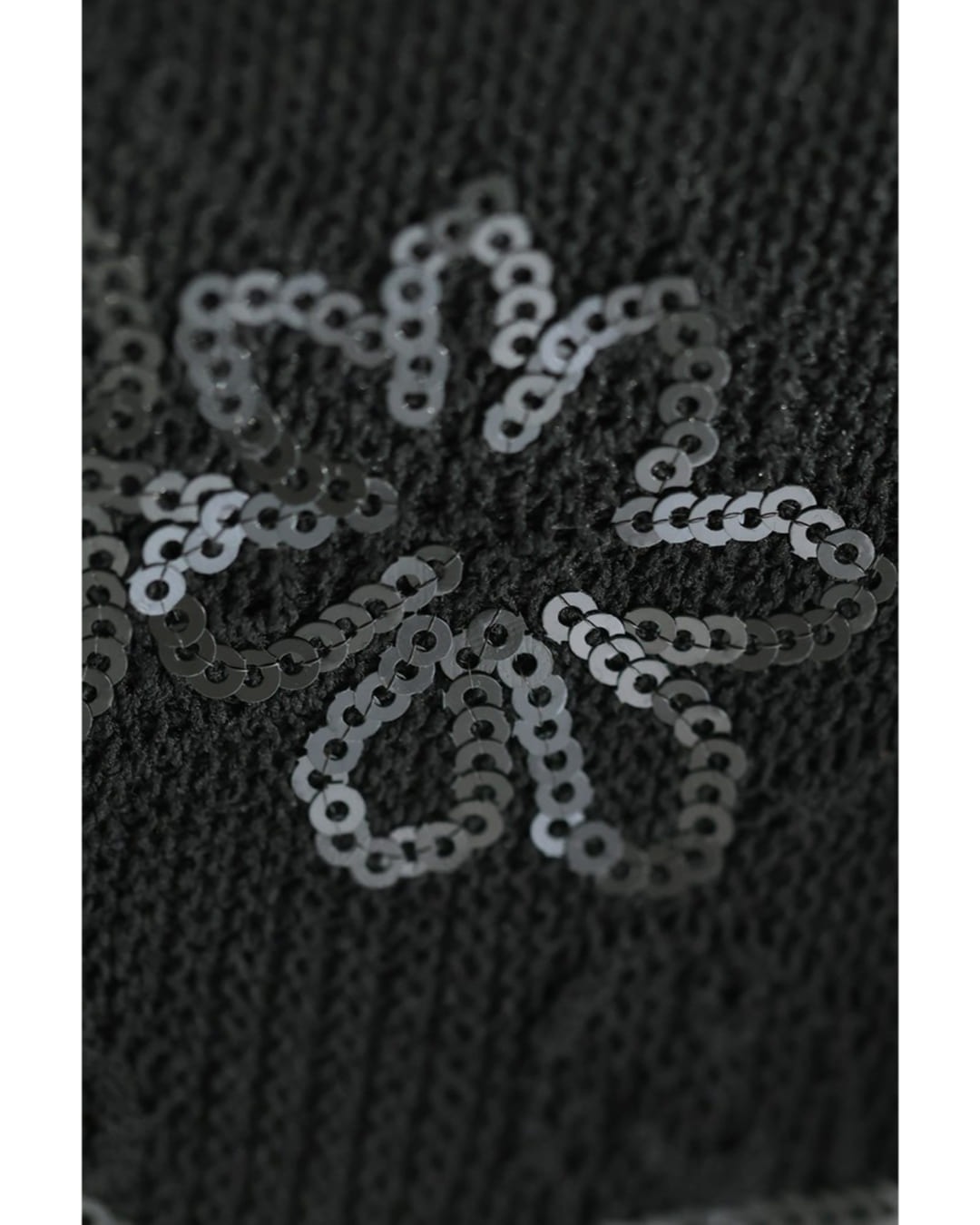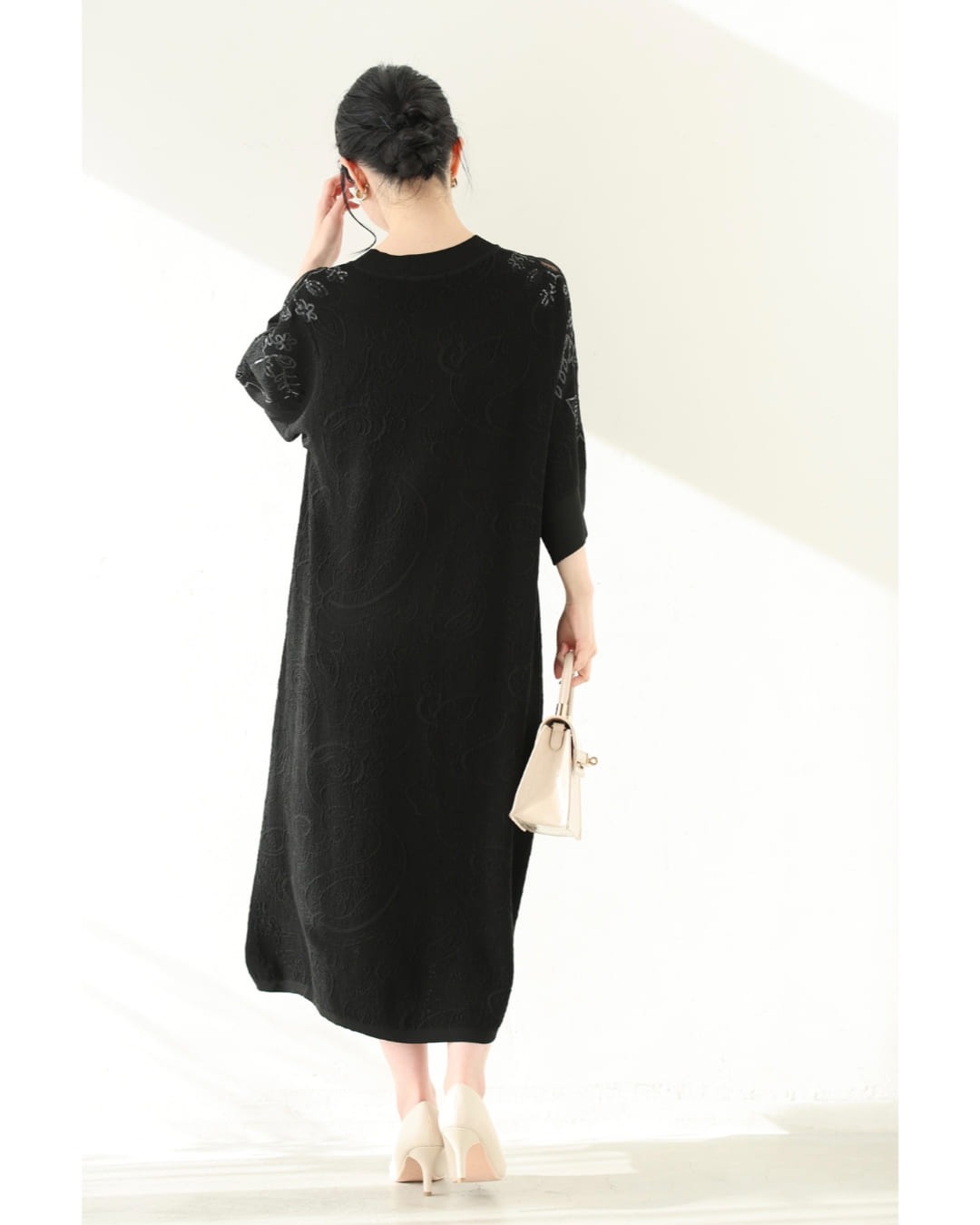 Sから3L対応 黒 スパンコールの花咲くニットミディアムワンピース