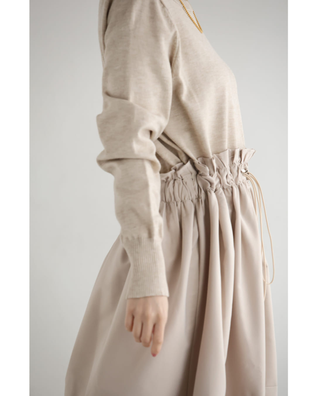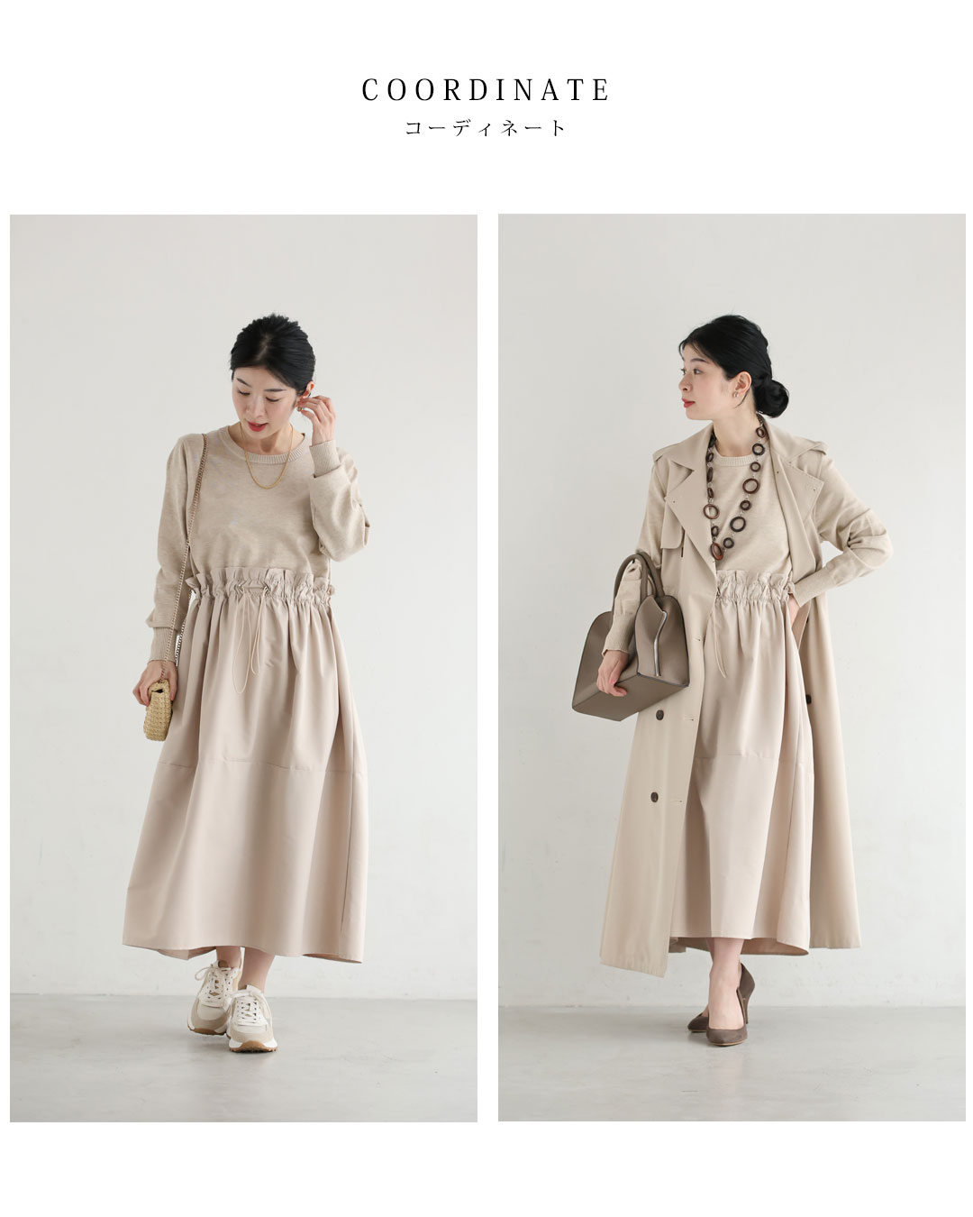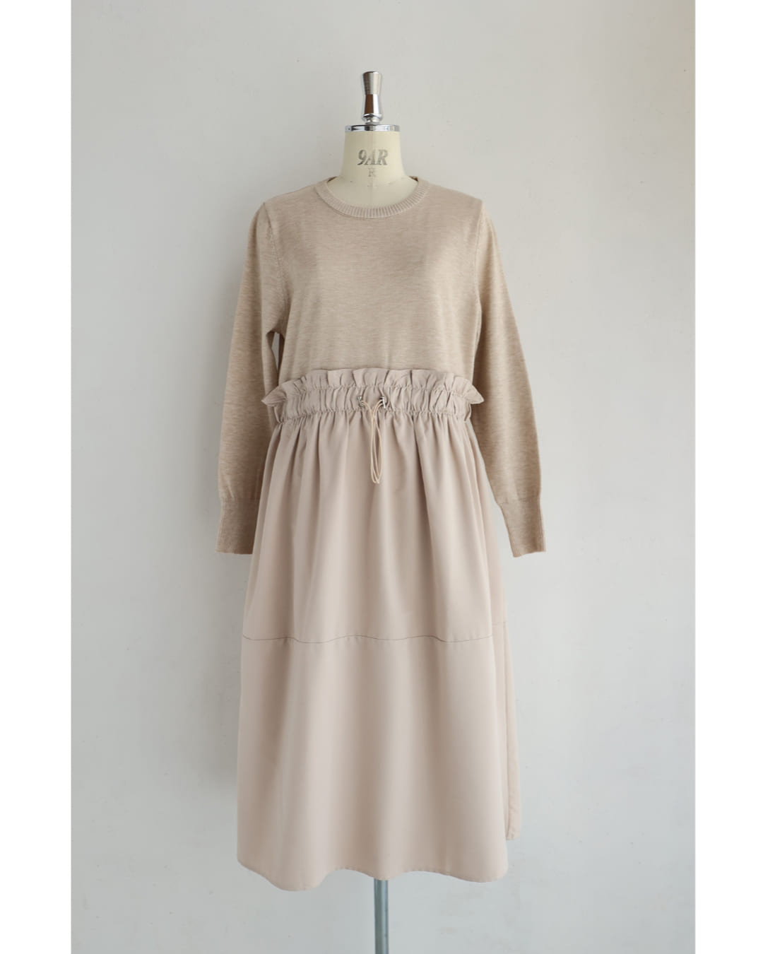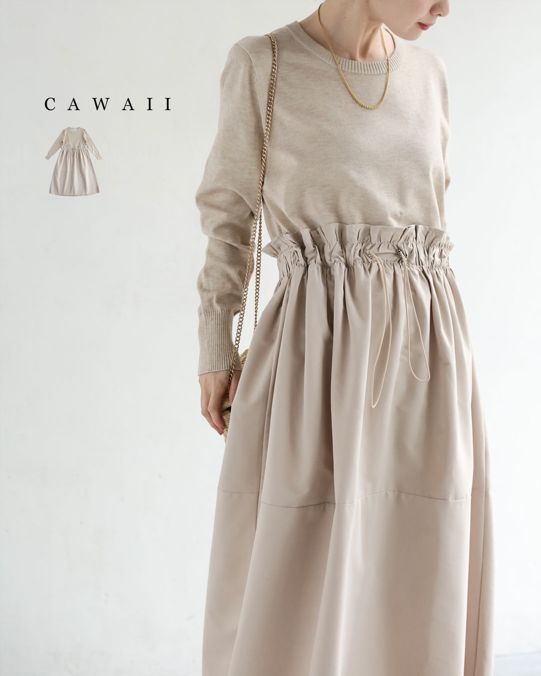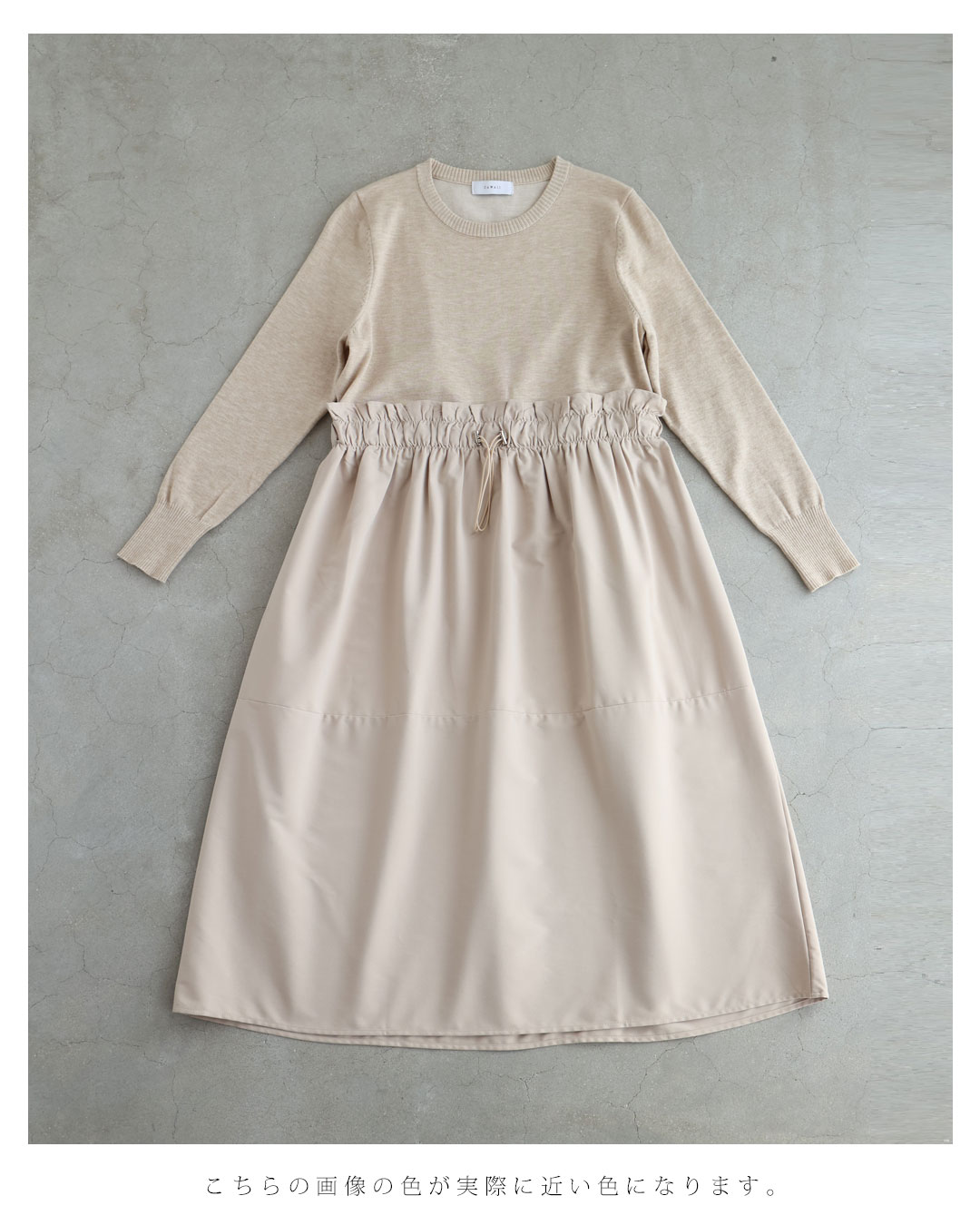w61692ps 新作 新着 再入荷 CAWAII FRENCHPAVE フレンチパヴェ エレガント ベーシック カジュアル 可愛い かわいい カワイイ おしゃれ オシャレ お洒落 個性 個性的 定番 ベーシック 大人かわいい 大人可愛い 上品 女性らしい デザイン スタンダード ナチュラル きれいめ キレイめ シンプル フェミニン レディース レディースファッション 大人 ママ ミセス 30代 40代 50代 60代 腰回りキュッとXラインの異素材切り替えミディアムワンピース 長袖 S M L ワンサイズ フリー 小さめ 小さい 低身長 痩せ ほっそり 小柄 細身 標準サイズ 大きめシルエット 大きい ビッグシルエット ゆったり F サイズ自由 春 夏 春服 春物 夏服 夏物 薄手 楽 ベージュ 無地 日常使い おでかけ キャザー 大人女子