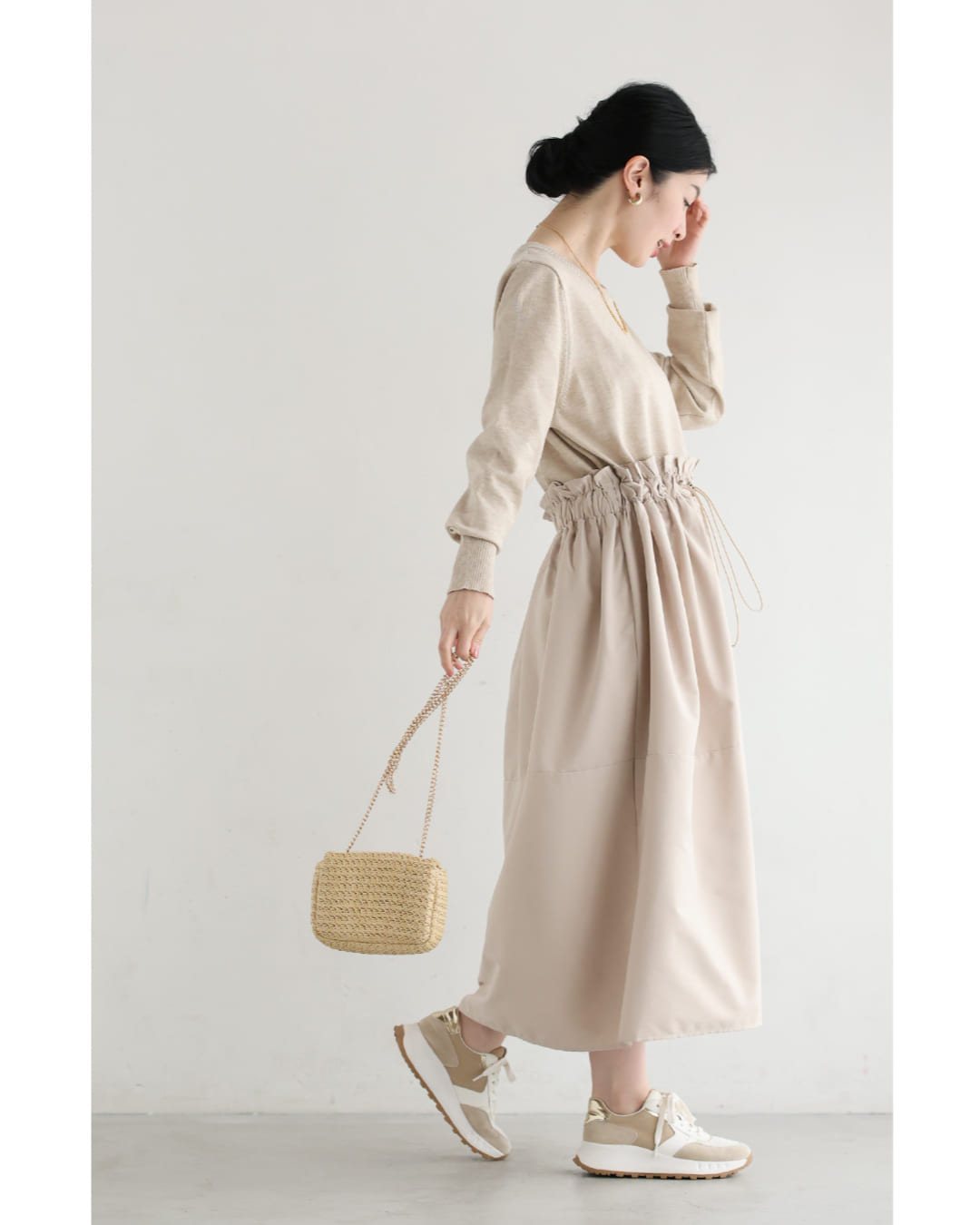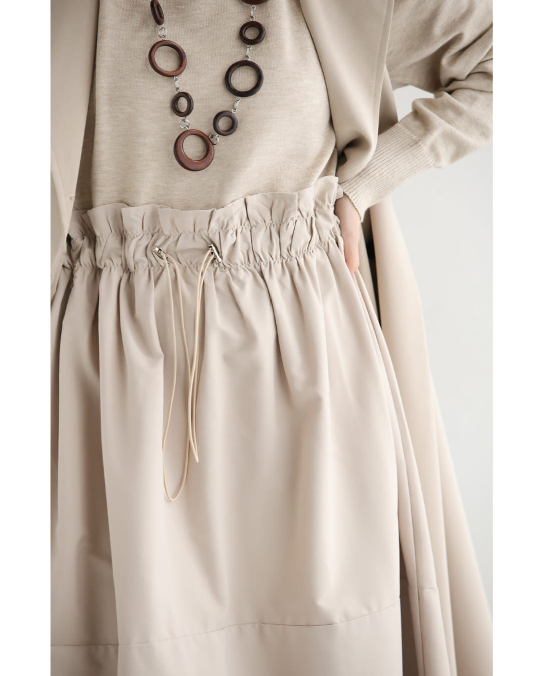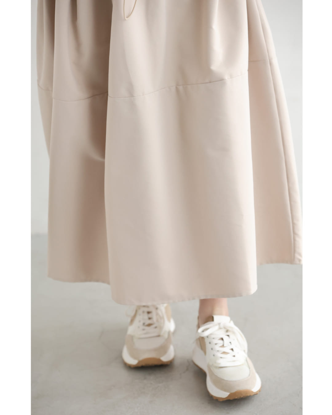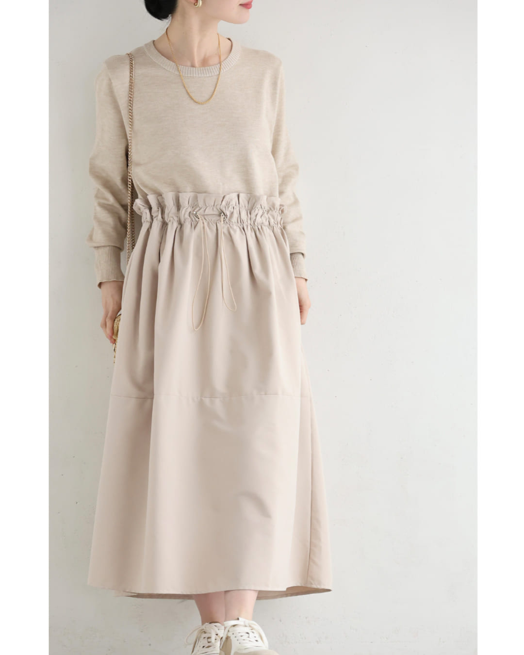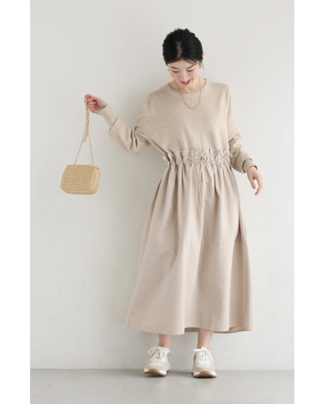 w61692ps 新作 新着 再入荷 CAWAII FRENCHPAVE フレンチパヴェ エレガント ベーシック カジュアル 可愛い かわいい カワイイ おしゃれ オシャレ お洒落 個性 個性的 定番 ベーシック 大人かわいい 大人可愛い 上品 女性らしい デザイン スタンダード ナチュラル きれいめ キレイめ シンプル フェミニン レディース レディースファッション 大人 ママ ミセス 30代 40代 50代 60代 腰回りキュッとXラインの異素材切り替えミディアムワンピース 長袖 S M L ワンサイズ フリー 小さめ 小さい 低身長 痩せ ほっそり 小柄 細身 標準サイズ 大きめシルエット 大きい ビッグシルエット ゆったり F サイズ自由 春 夏 春服 春物 夏服 夏物 薄手 楽 ベージュ 無地 日常使い おでかけ キャザー 大人女子