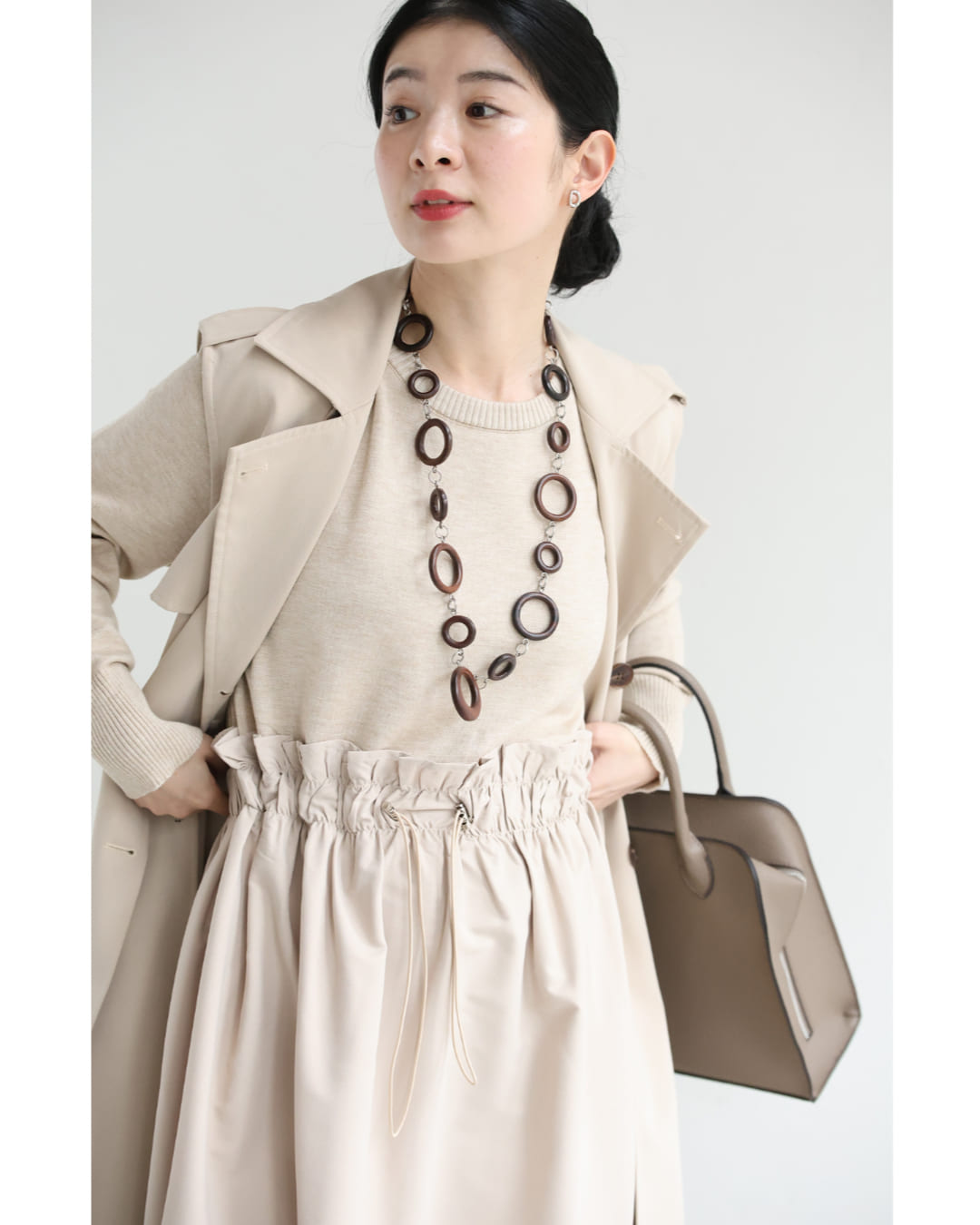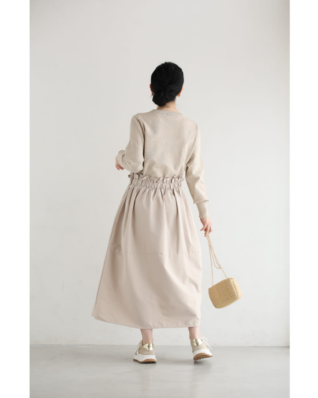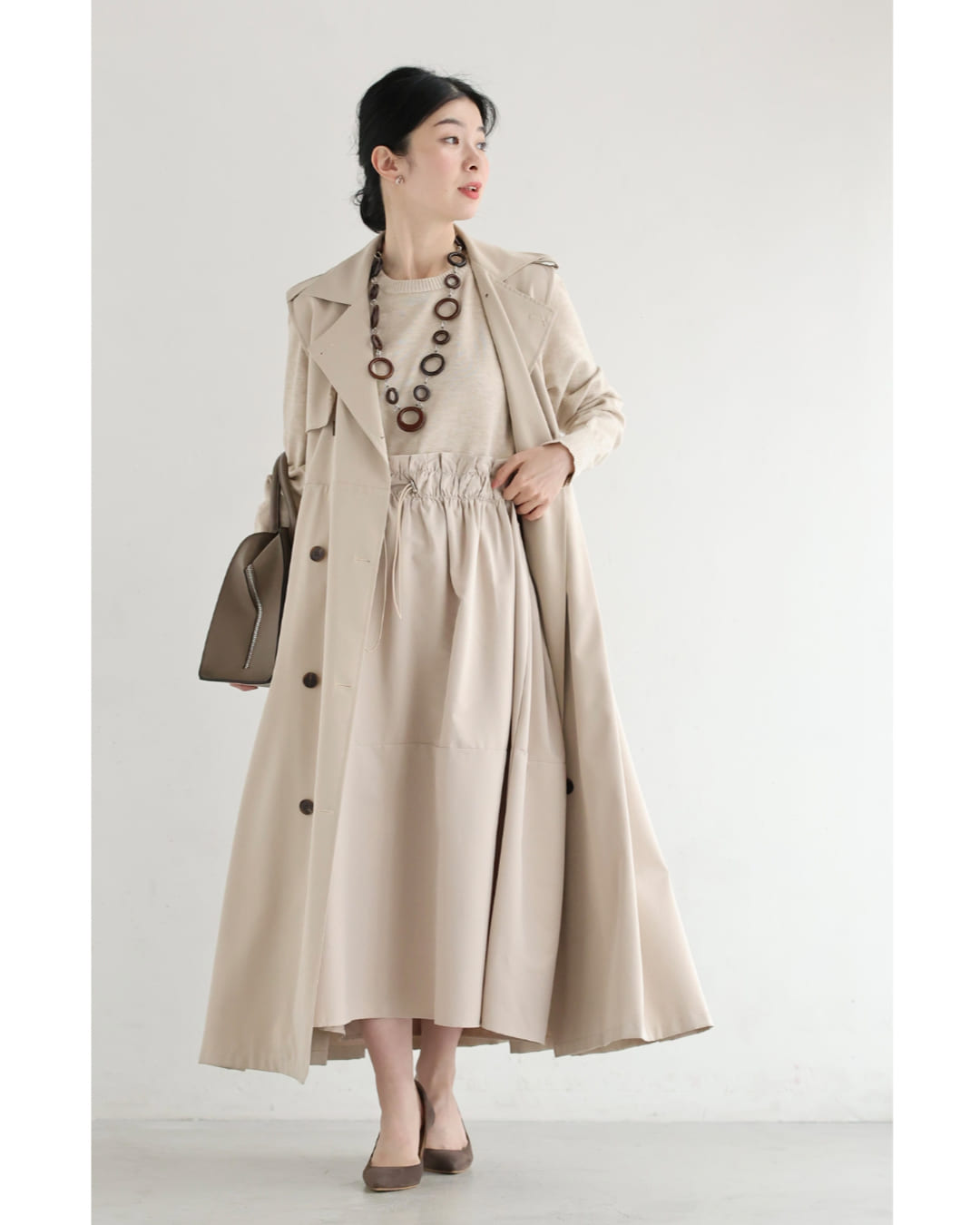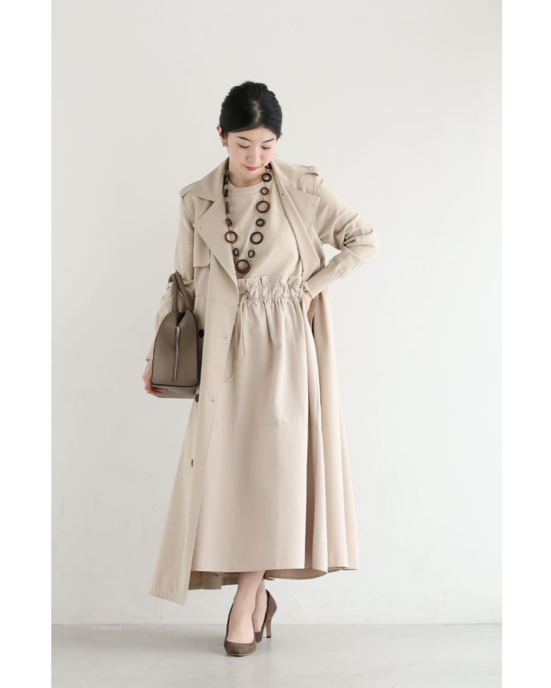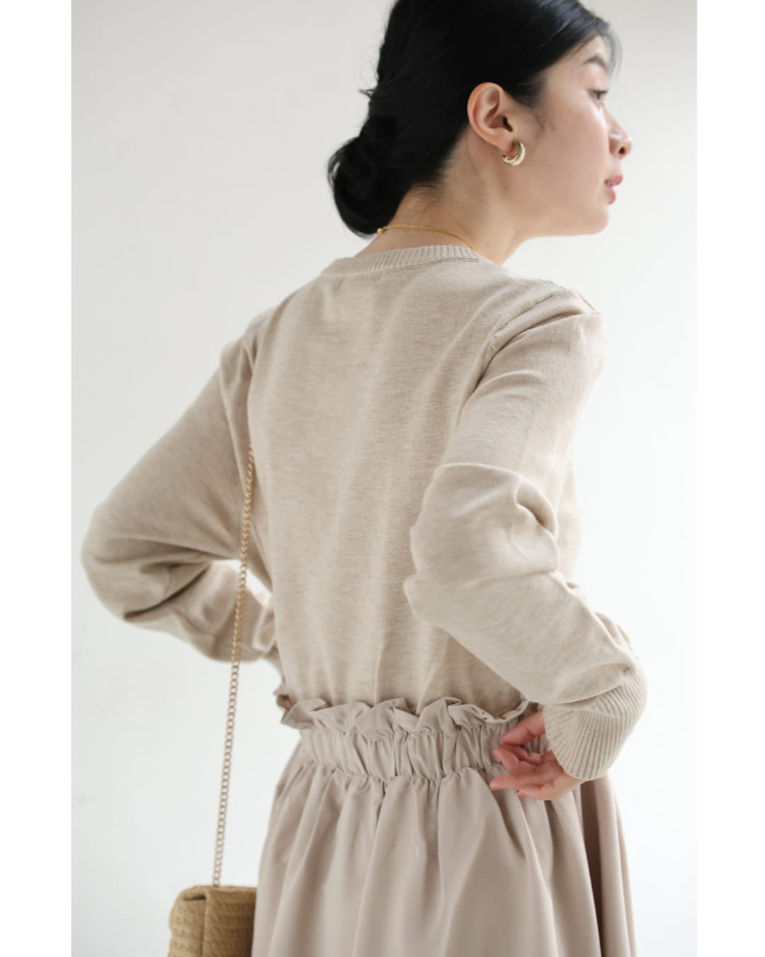 w61692ps 新作 新着 再入荷 CAWAII FRENCHPAVE フレンチパヴェ エレガント ベーシック カジュアル 可愛い かわいい カワイイ おしゃれ オシャレ お洒落 個性 個性的 定番 ベーシック 大人かわいい 大人可愛い 上品 女性らしい デザイン スタンダード ナチュラル きれいめ キレイめ シンプル フェミニン レディース レディースファッション 大人 ママ ミセス 30代 40代 50代 60代 腰回りキュッとXラインの異素材切り替えミディアムワンピース 長袖 S M L ワンサイズ フリー 小さめ 小さい 低身長 痩せ ほっそり 小柄 細身 標準サイズ 大きめシルエット 大きい ビッグシルエット ゆったり F サイズ自由 春 夏 春服 春物 夏服 夏物 薄手 楽 ベージュ 無地 日常使い おでかけ キャザー 大人女子