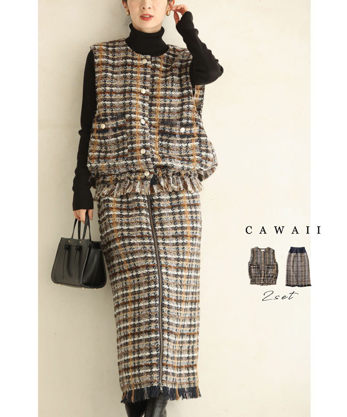 w6s00134od 新作 新着 再入荷 CAWAII FRENCHPAVE フレンチパヴェ エレガント ベーシック カジュアル 可愛い かわいい カワイイ おしゃれ オシャレ お洒落 個性 個性的 定番 ベーシック 大人かわいい 大人可愛い 上品 女性らしい デザイン スタンダード ナチュラル きれいめ キレイめ シンプル フェミニン レディース レディースファッション 大人 ママ ミセス 30代 40代 50代 60代 チェックツイード風 ベスト スカート セットアップ S M 小さめ 小さめサイズ小さい 小さいサイズ 低身長 痩せ ほっそり 小柄 細身 秋 冬 秋服 秋物 冬服 冬物 ネイビー 紺 紺色 藍 藍色 日常着 普段着 日常使い 後ろゴム センターファスナー