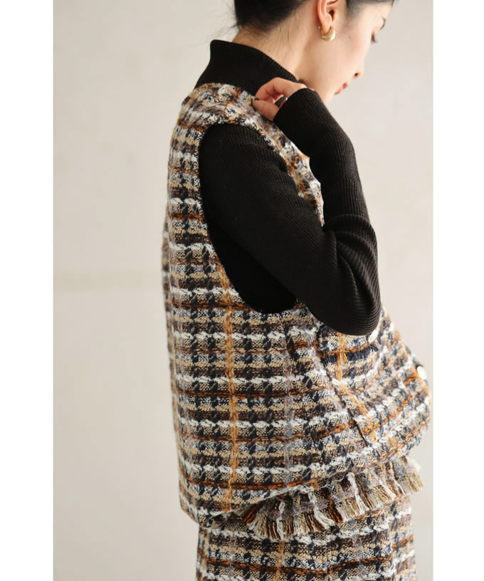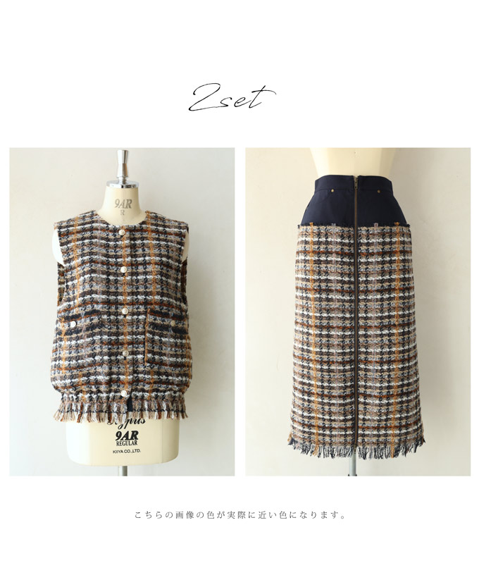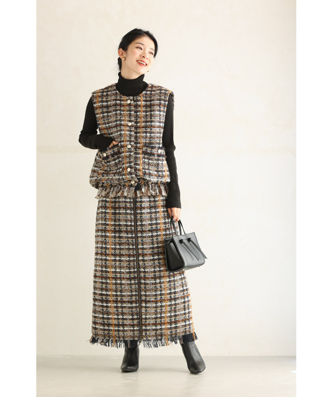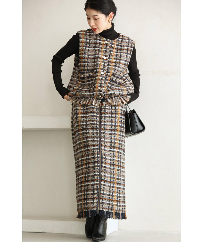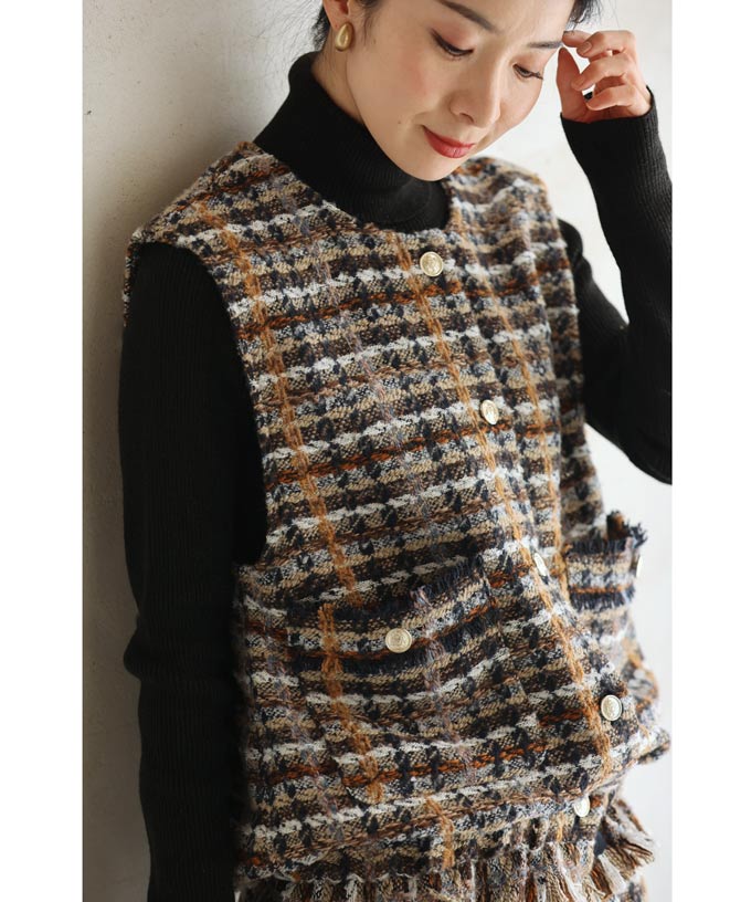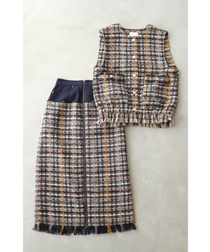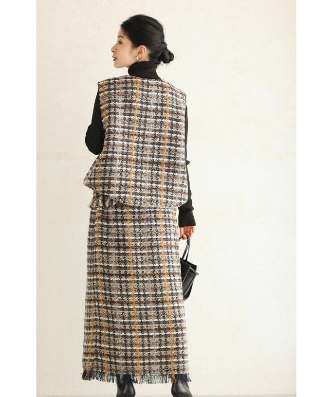 チェックツイード風ベストとスカートのセットアップ