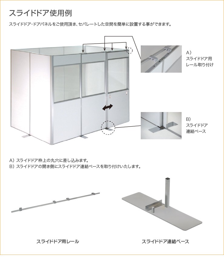 視認性の高い透明アクリルパネルを前面に配置。出入り口にはスライドドアを使用しておりますので、狭いスペースでも無駄なく設置できます。パーツを組み合わせることで、お好きなレイアウトで組めますので、汎用性の高い簡易設置ルームとしてお使いいただけます。