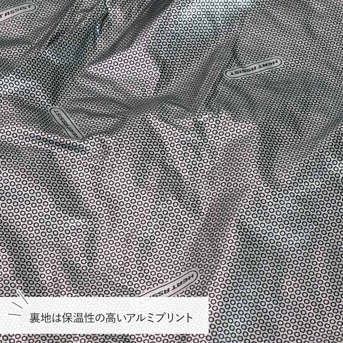 裏地全面に施されたアルミプリントが体温を反射し、衣服内の暖かさをキープ。
