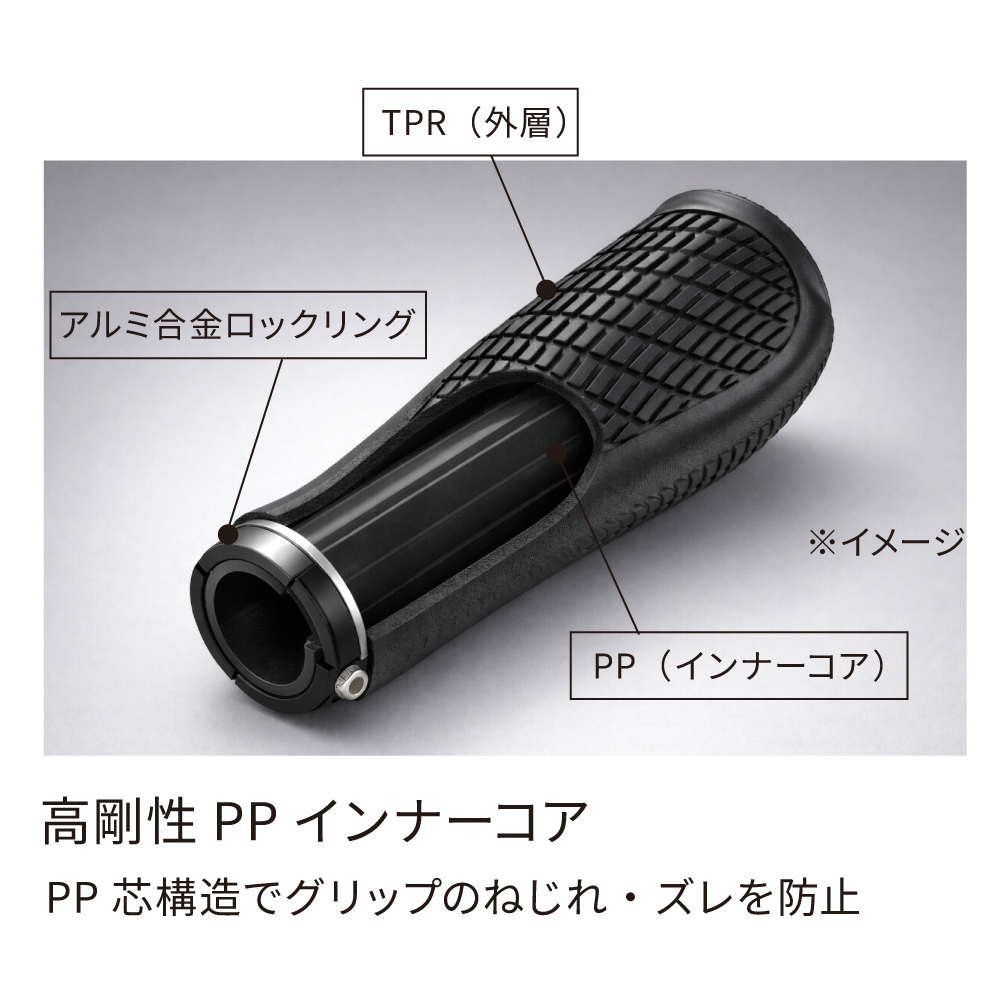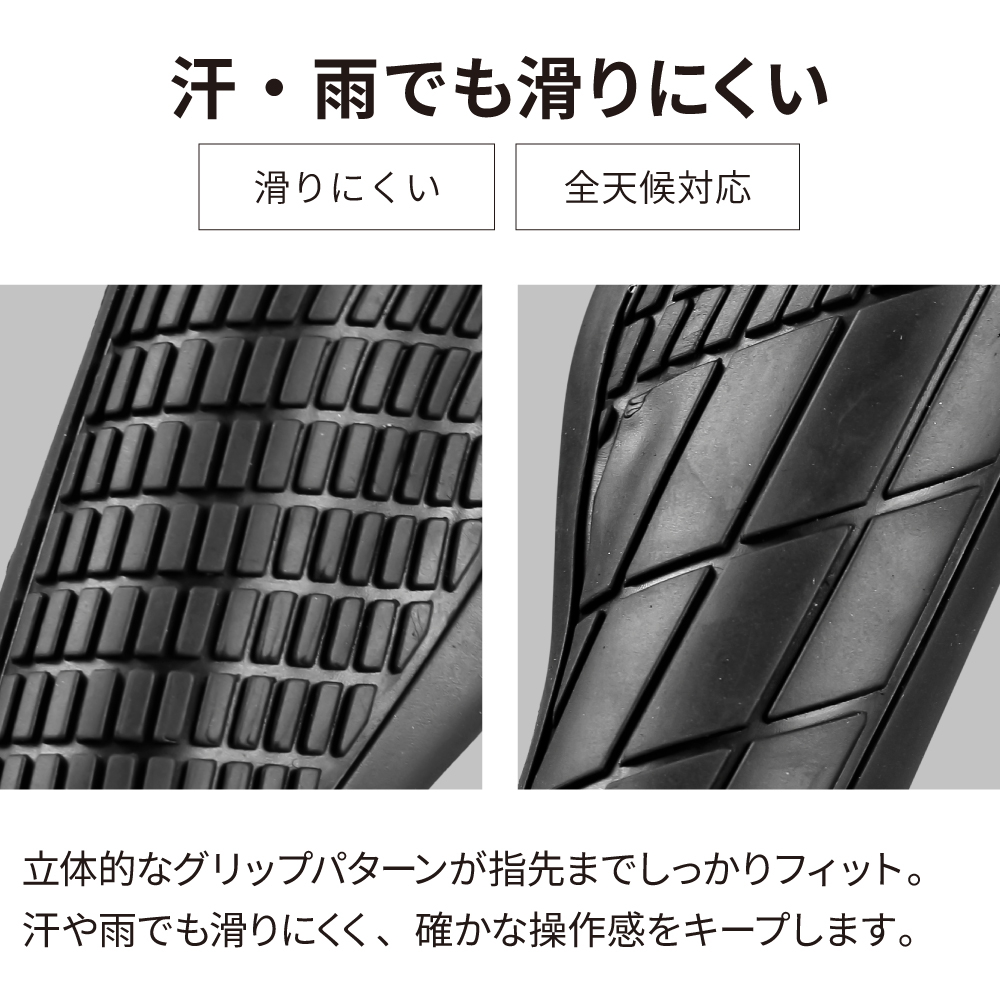 外層には汗や雨でも滑りにくく、ゴム特有の不快なベタつきを抑えた高品質TPR素材を採用 。