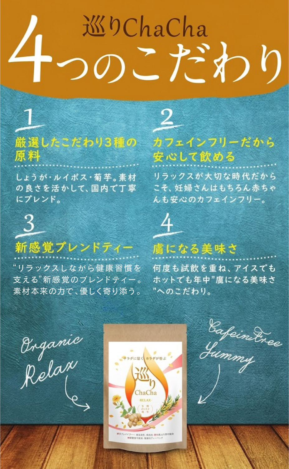 "リラックスしながらカラダを整える新感覚ブレンドティー"、"虜になる美味さ"で年中頂けます。