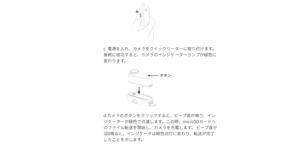 カメラをクイックリーダーにドッキングし、ケーブル経由で充電できるようにします。 アクションポッドを持ち歩く必要はありません。
