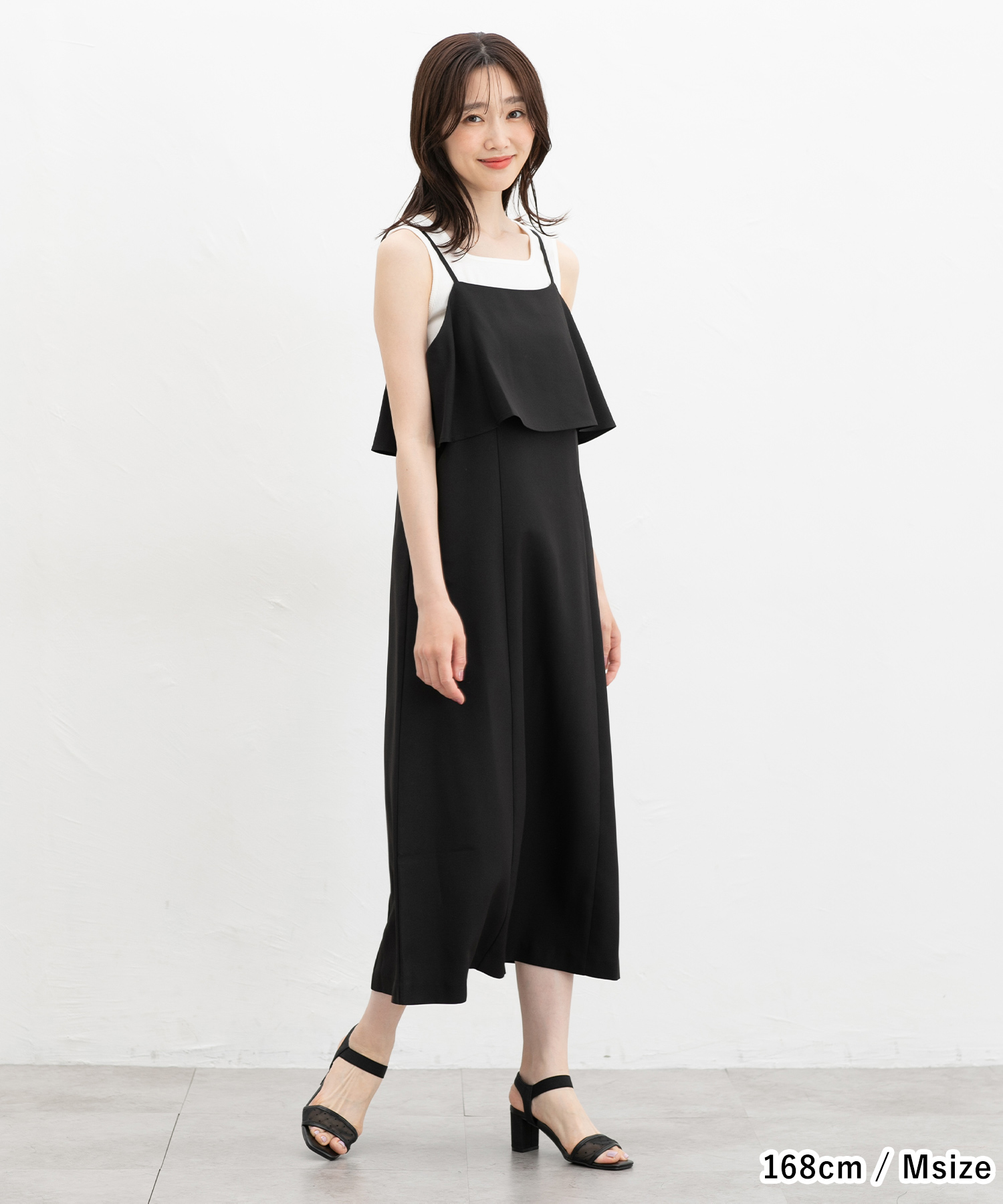 ワンピース キャミワンピ ノースリーブ ロング丈 大きいサイズ フリル Aライン 無地 ツイル素材 裏地付き レディース Honeys ハニーズ キャミワンピース
