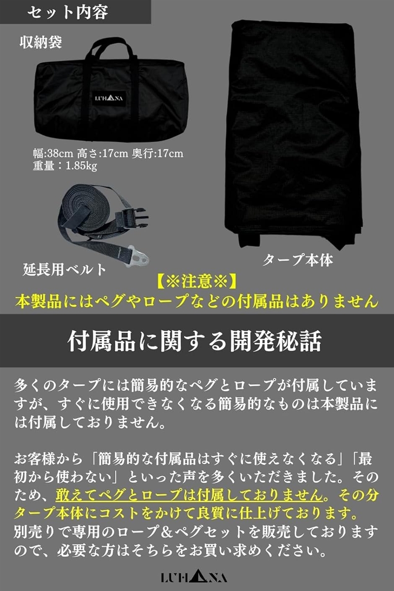 敢えて簡易的な付属品は付けず、タープ本体にコストをかけ、無駄を省きより良い製品をお届けしたいという思いから開発しました。