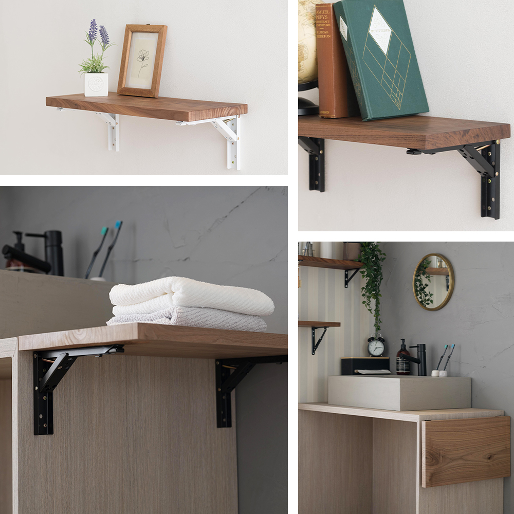 使用しない時はたためて空間を有効活用できる折りたたみ式の便利な棚受け金具。