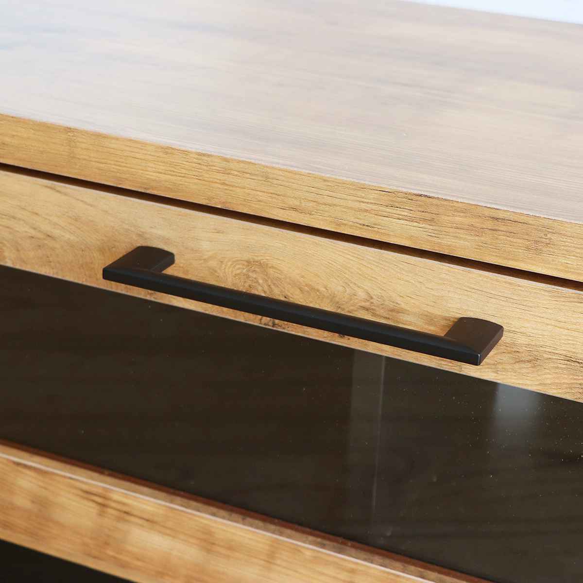 ラフな質感のあるヴィンテージ調の木目と、主張しすぎない取っ手のアイアンの組み合わせがポイントです。