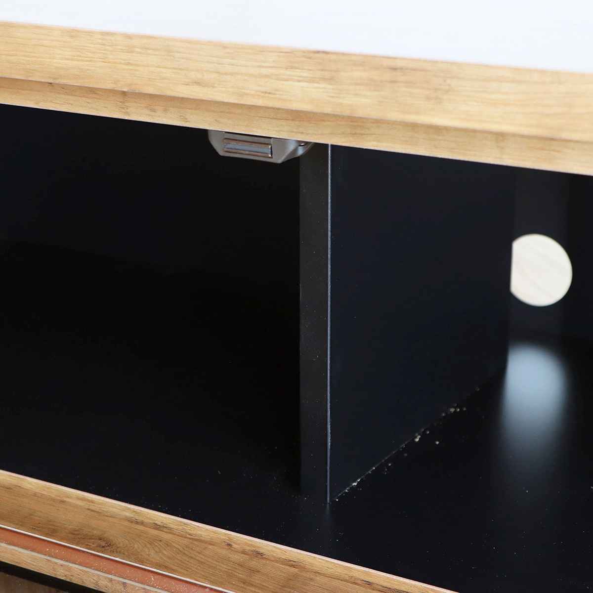 ガラス扉は閉めたままリモコン操作が可能です。ガラス扉内の棚にはAV機器が置ける収納になっており、AV機器を置くのにとっても便利です。