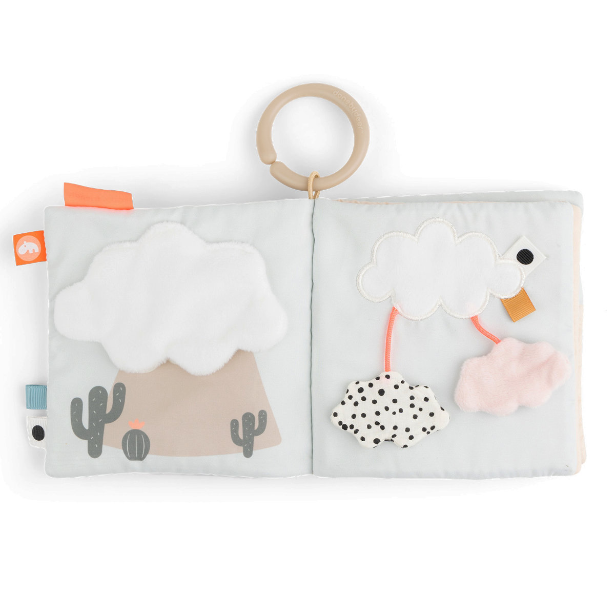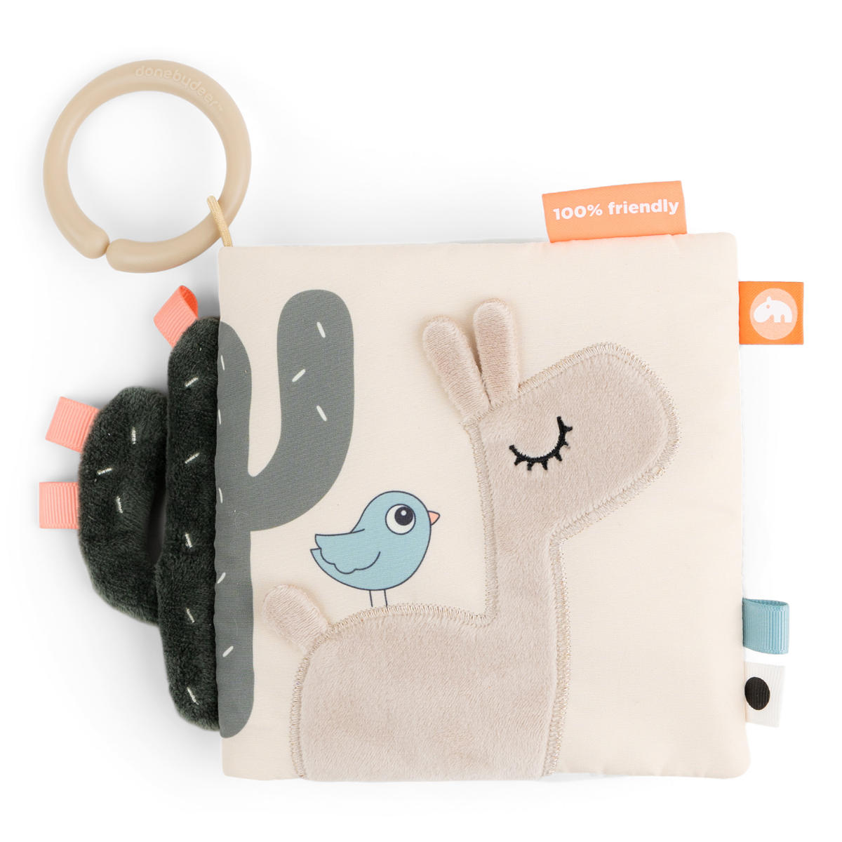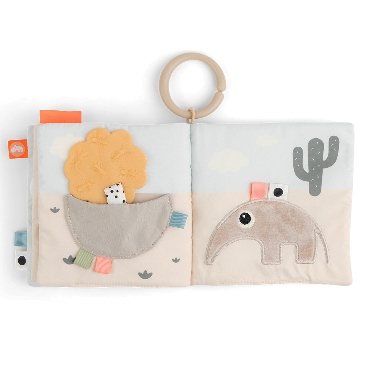 絵本の表には新キャラクターのラマの女の子「ラリー」が描かれてされており、横に付いてるサボテンがかわいいアクセントです。リング付きなので掛けて収納することもでき、外出時はベビーカーやカバンに付けてお出かけできます。